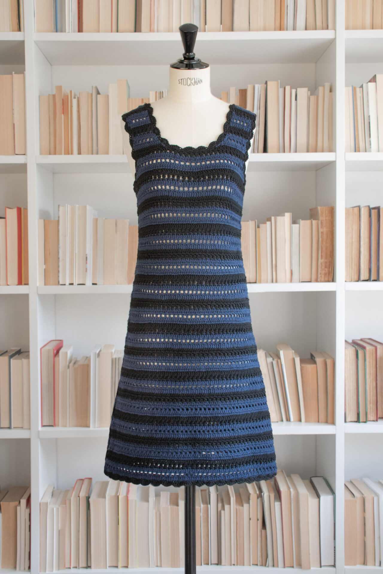 Abito smanicato fatto a mano in crochet con filato di lana merino blu/nero, a “righe Gaeta” orizzontali. Scollatura, giromanica e orlo smerlati in crochet di filato lana merino nero.