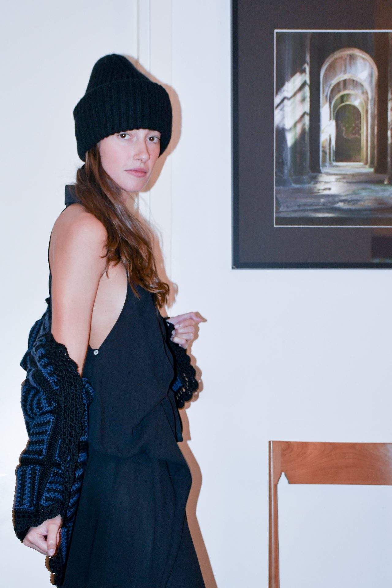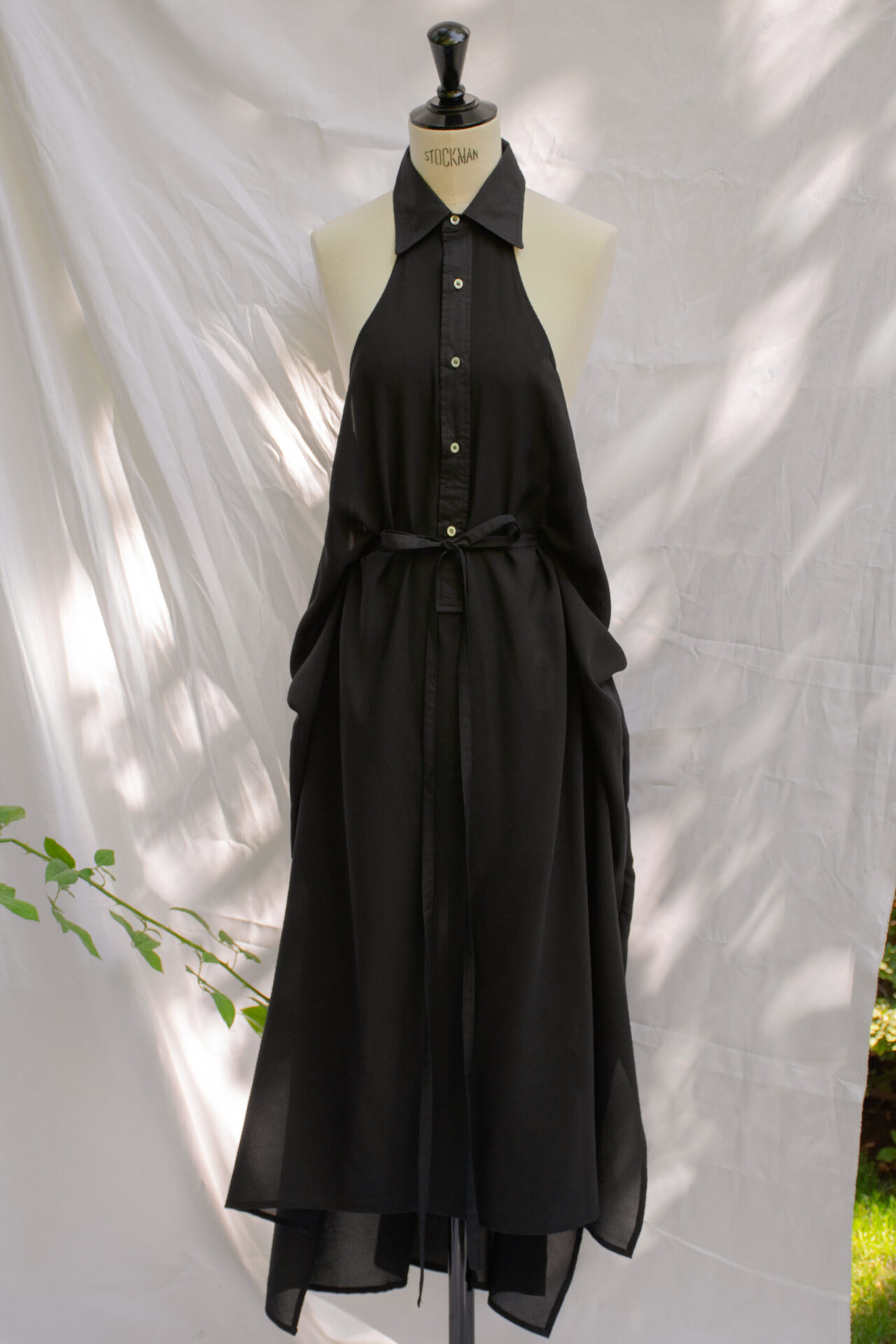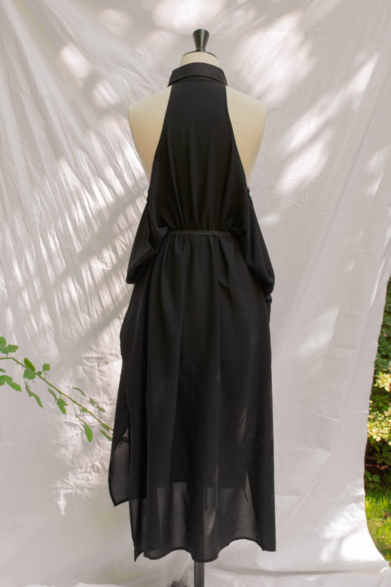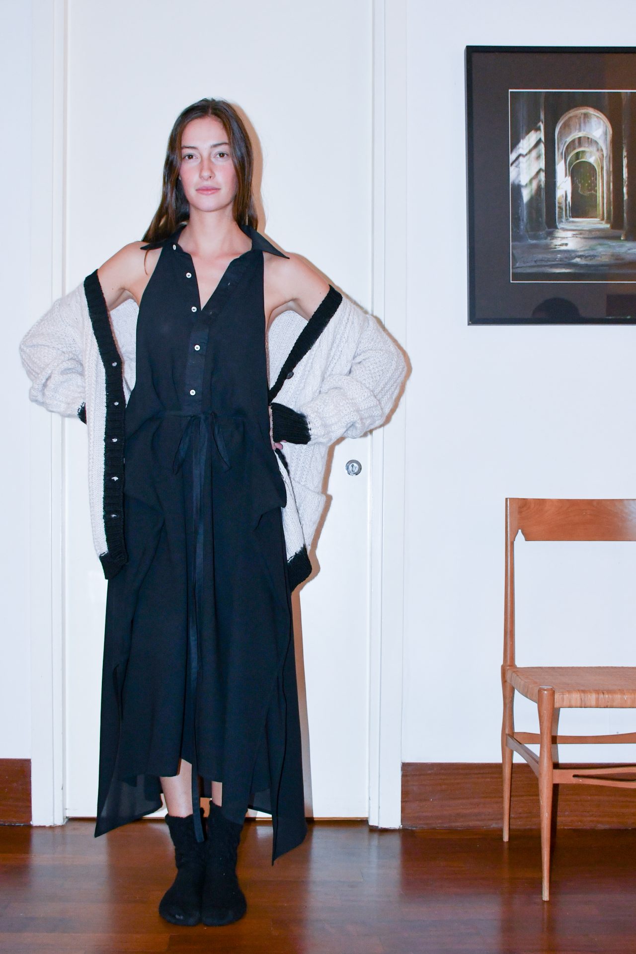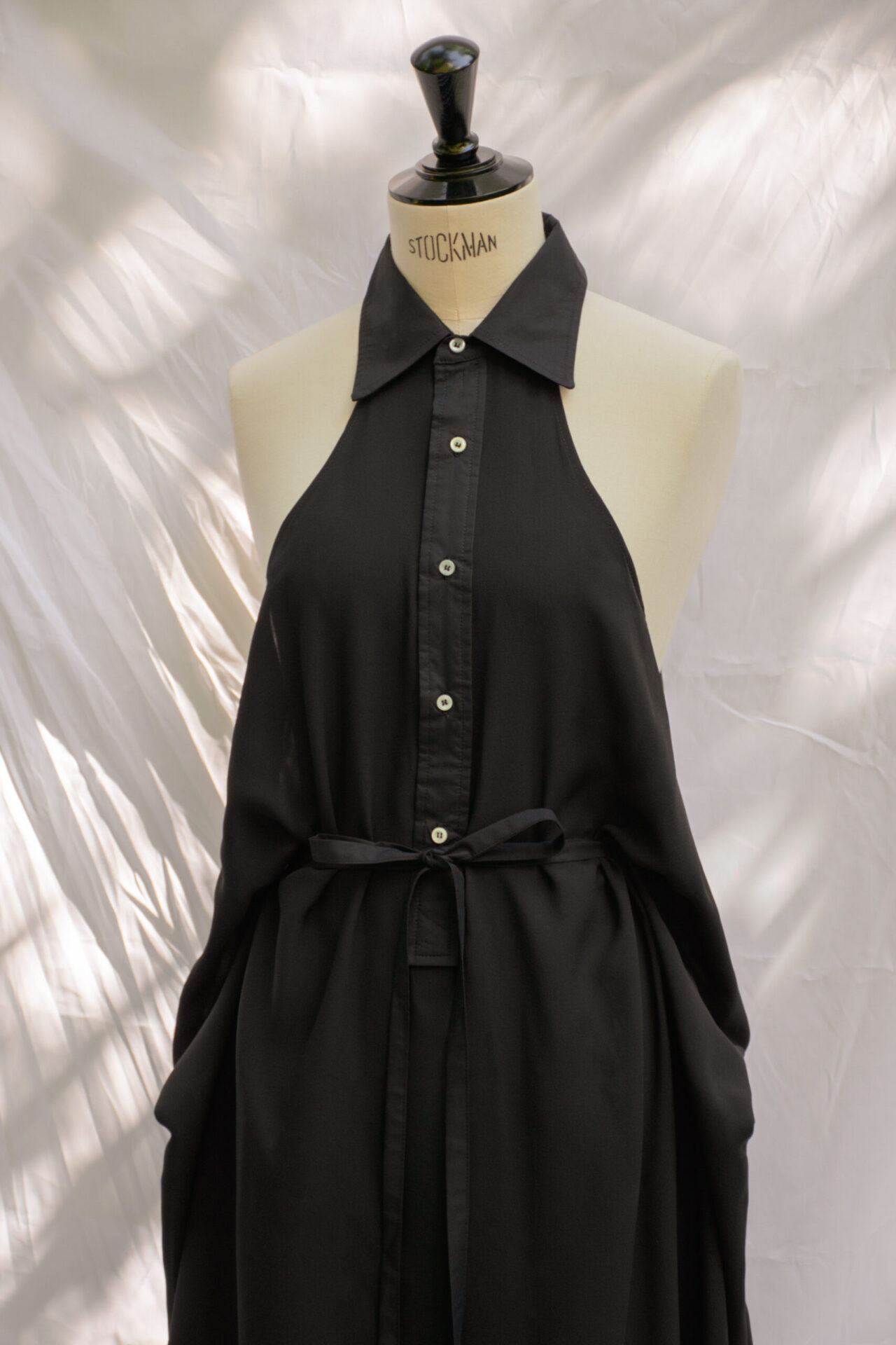 Abito kaftano off-shoulders in crêpe di seta nera, regolabile tramite cintura a nastro inserita in vita e con spacchi laterali. Collo, cannoncino e cintura in popeline di cotone nero. Bottoni madreperla naturale con asolina volante per regolare la scollatura del giro.