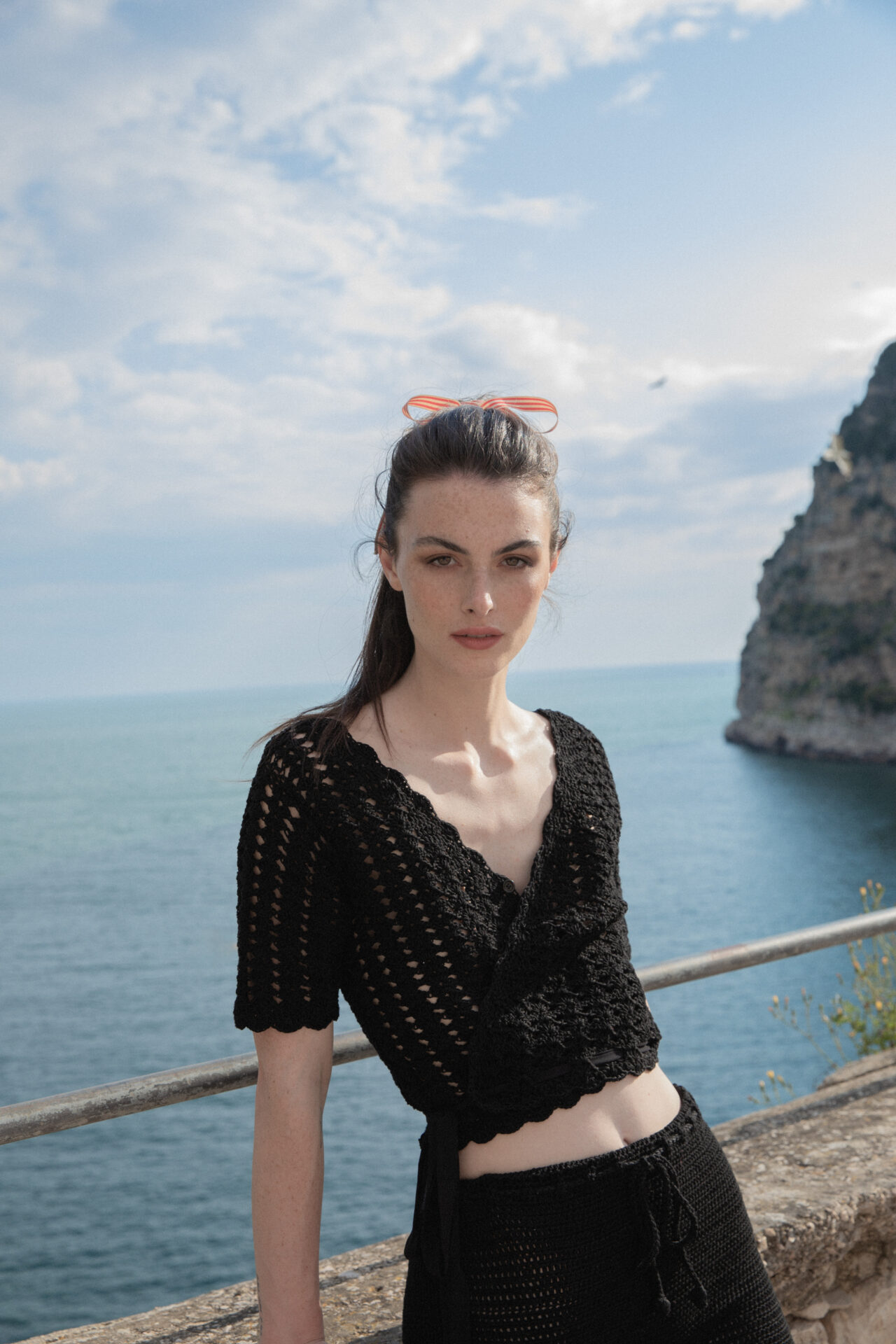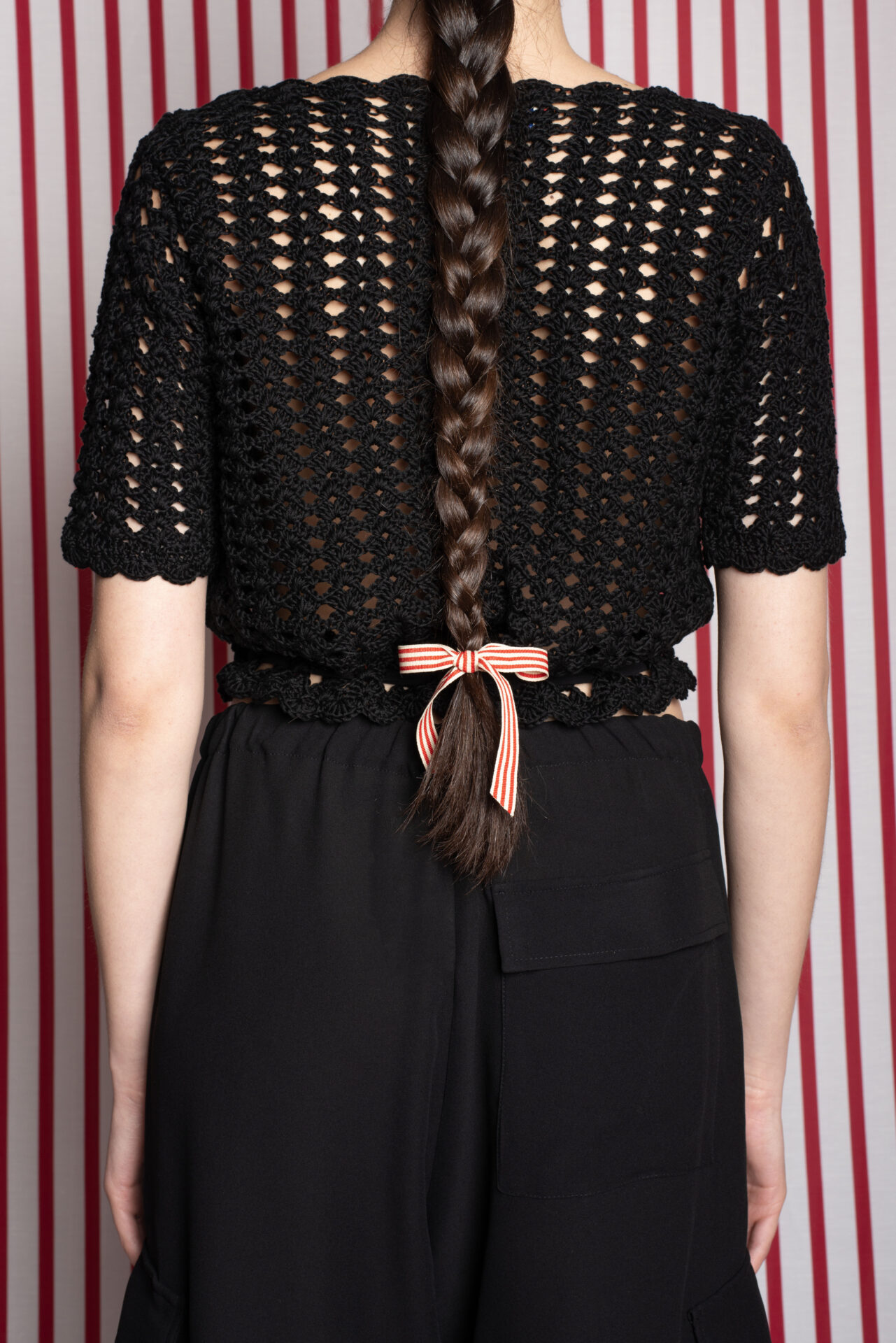 Cache-coer fatto a mano in crochet con filato di lana nero, realizzato in punto ventaglietti traforato. Scollatura a incrocio sul davanti, regolabile con cintura in georgette di seta nera. Orlo, scollo e orlo maniche smerlati.