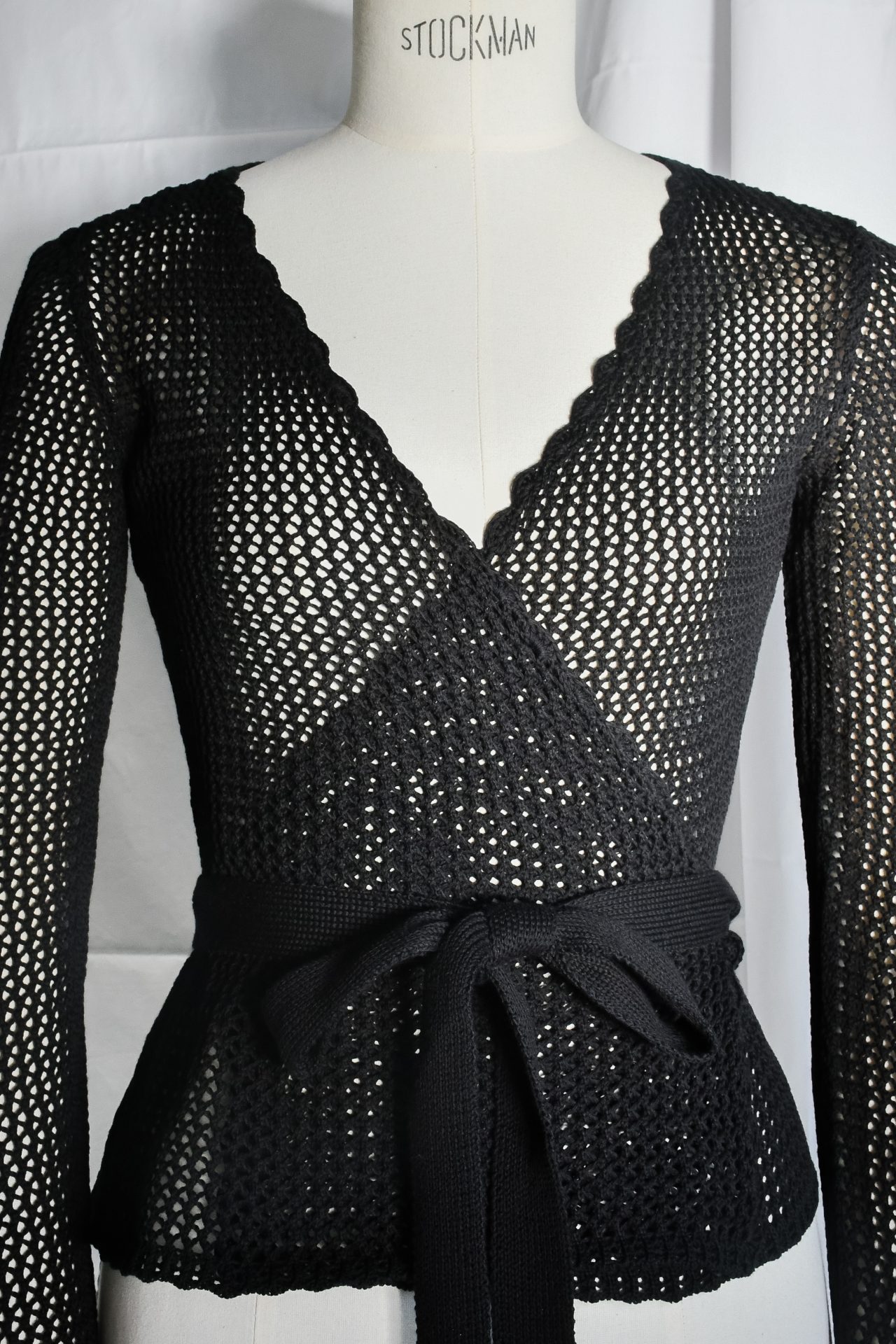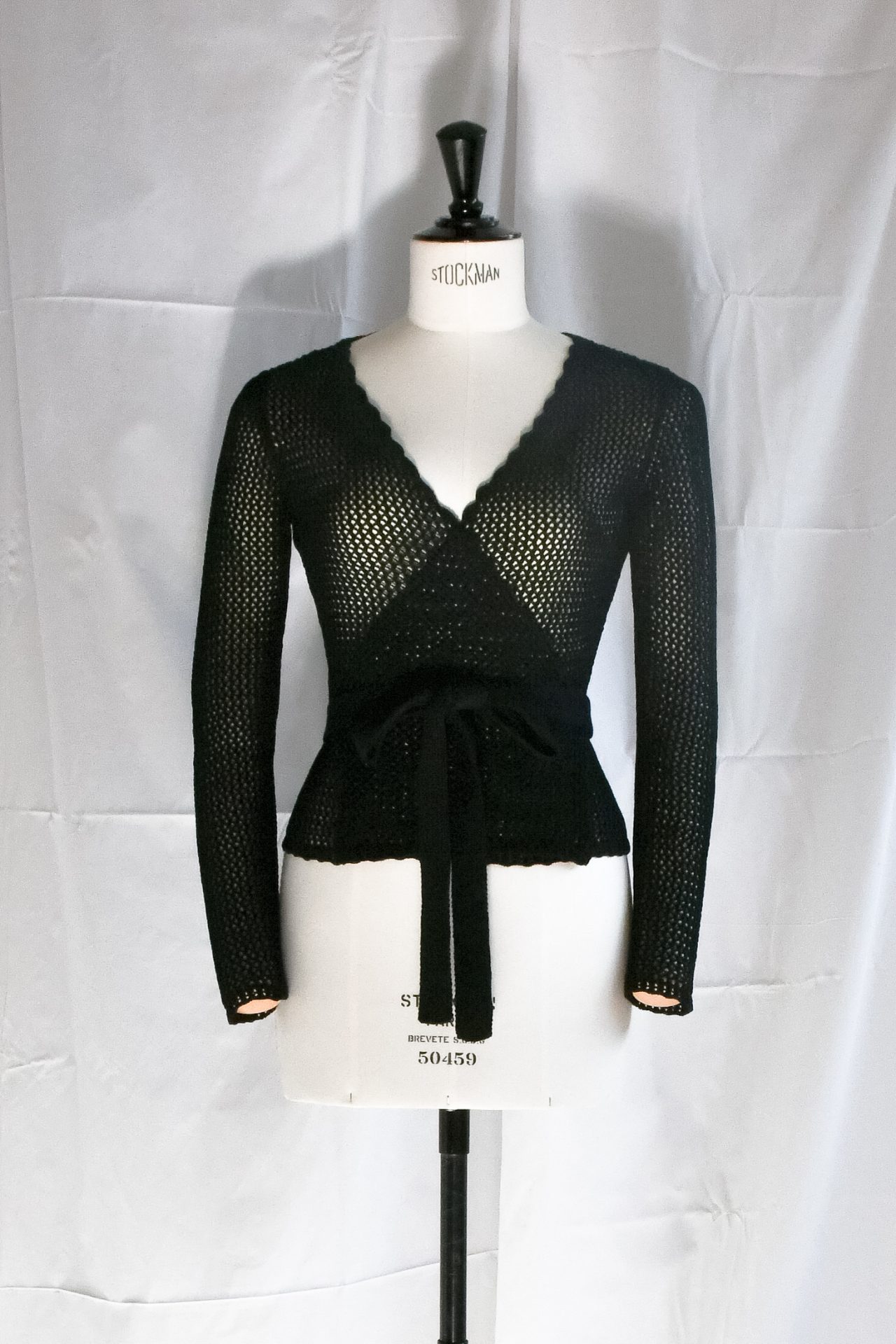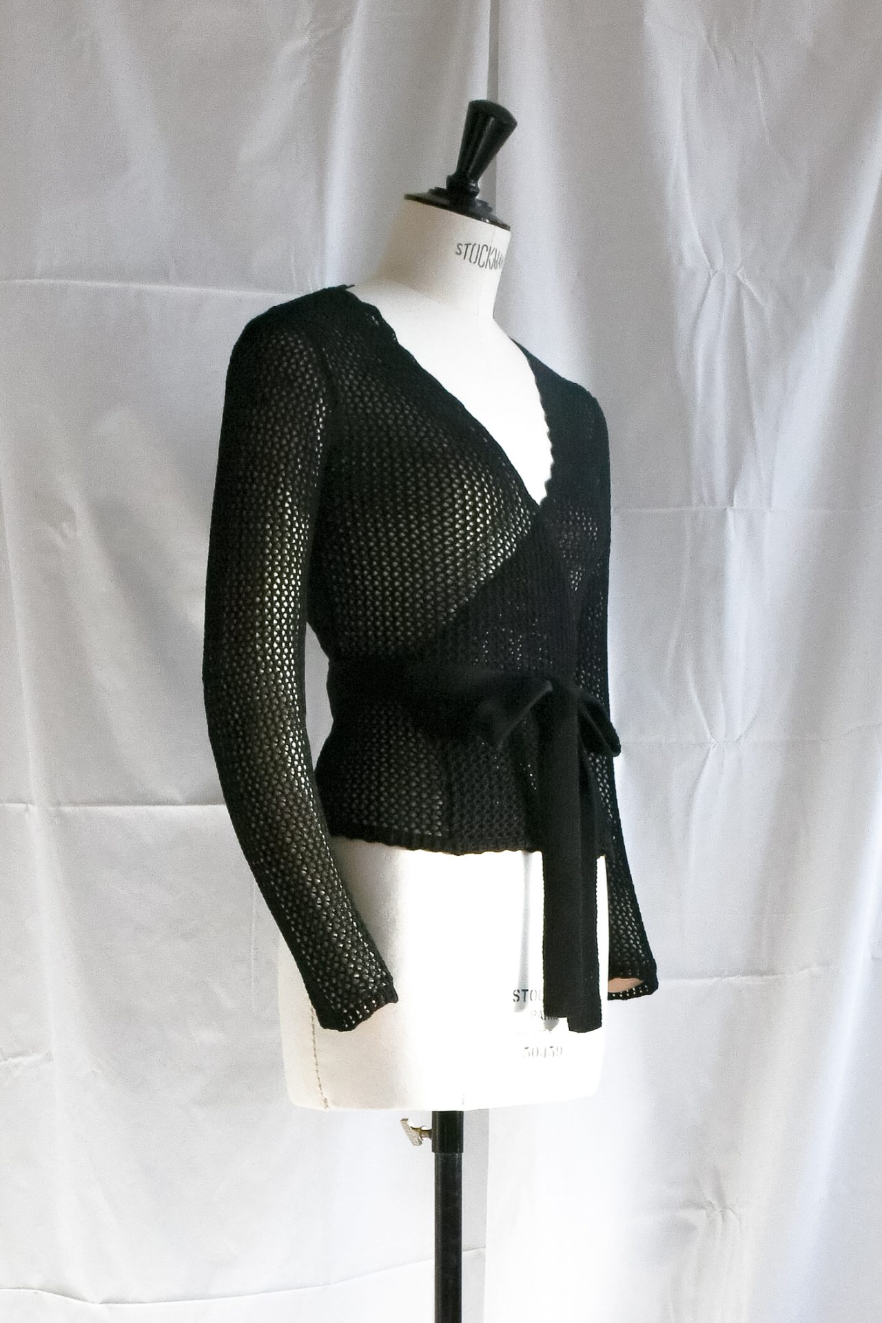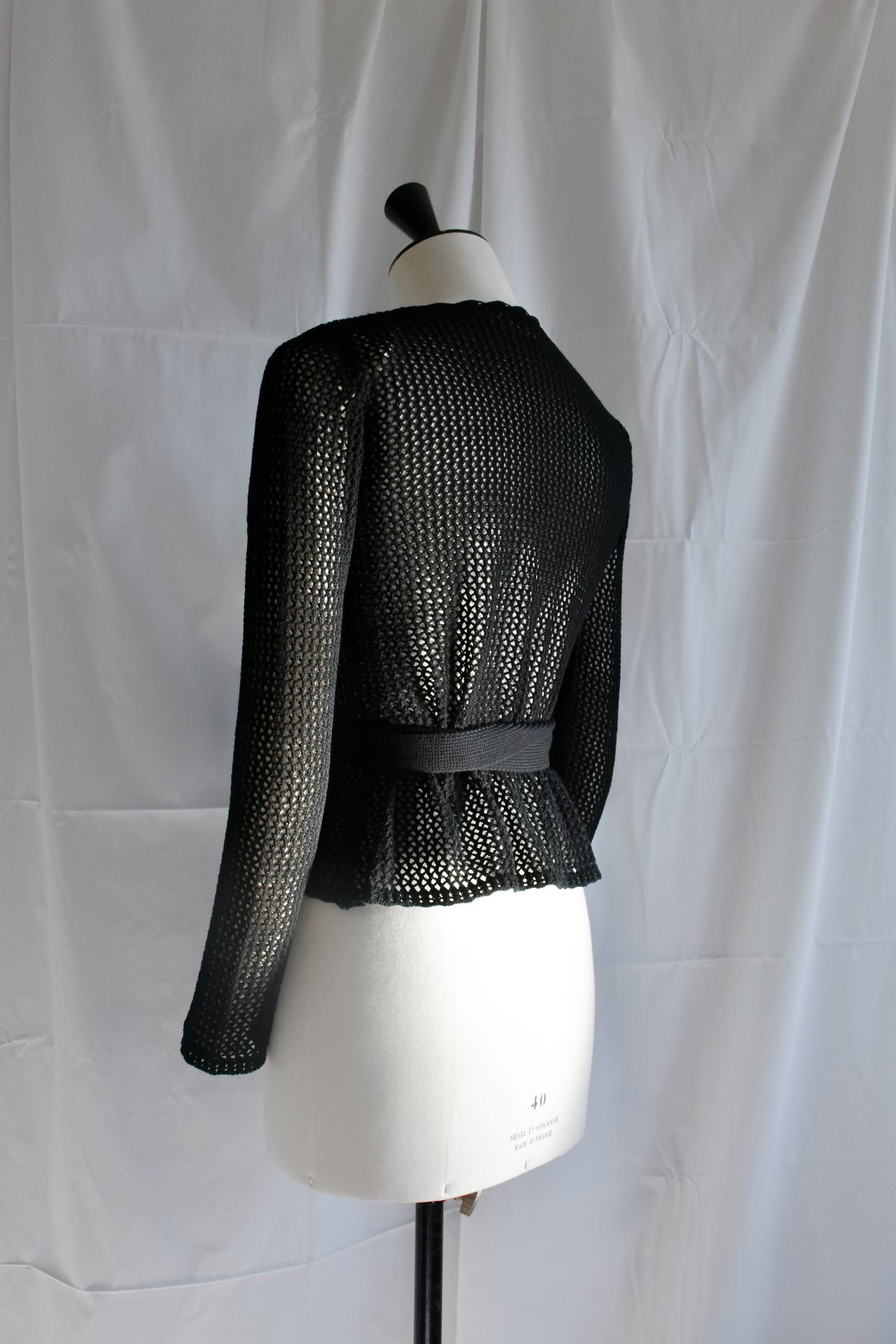Cache-coeur a maniche lunghe realizzato a macchina manuale con filato di cotone nero, realizzato in punto rete. Scollatura a incrocio sul davanti, regolabile con cintura realizzata a maglia unita nera. Scollo, polsi e fondo ad archetti realizzati a mano in crochet.