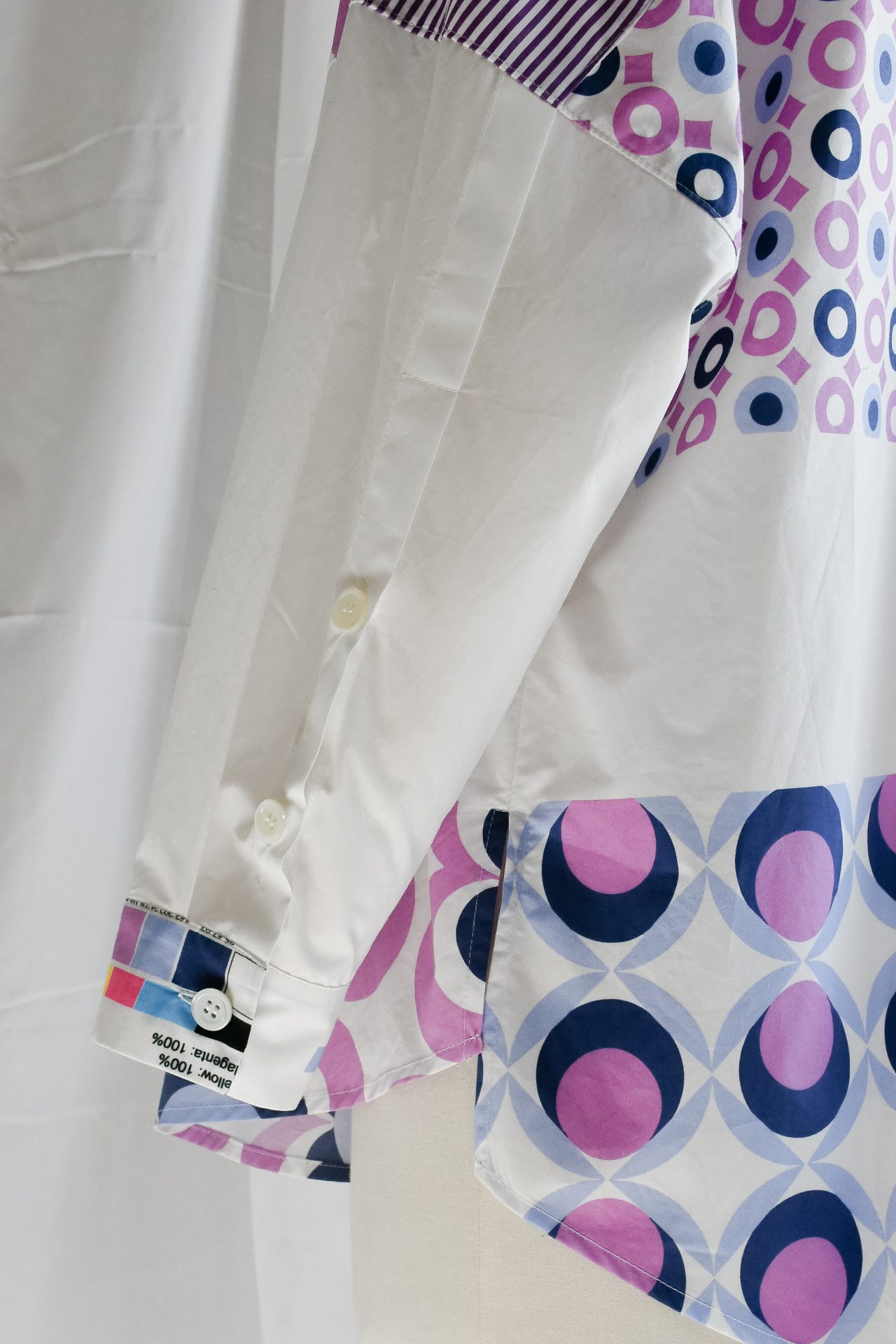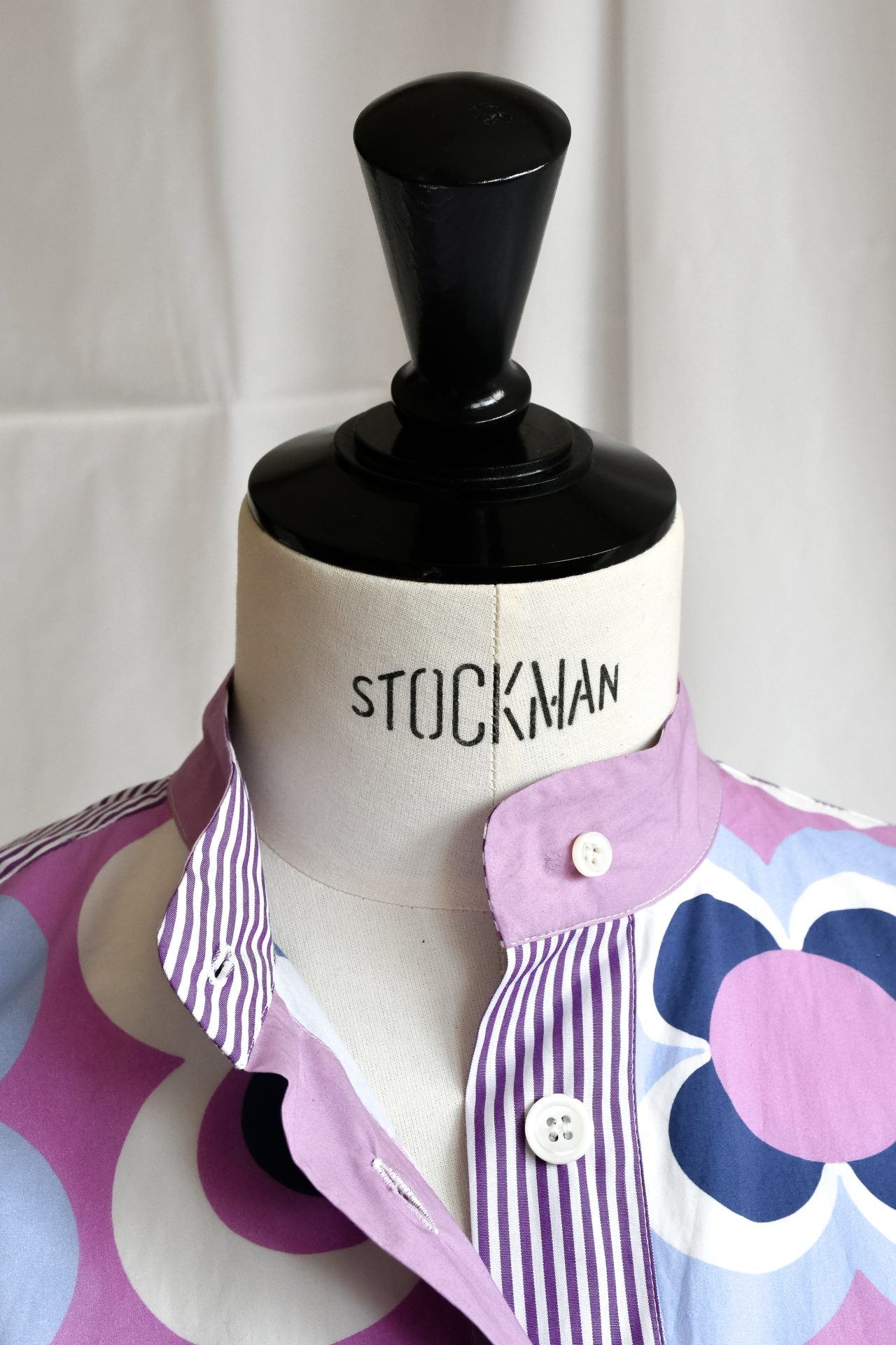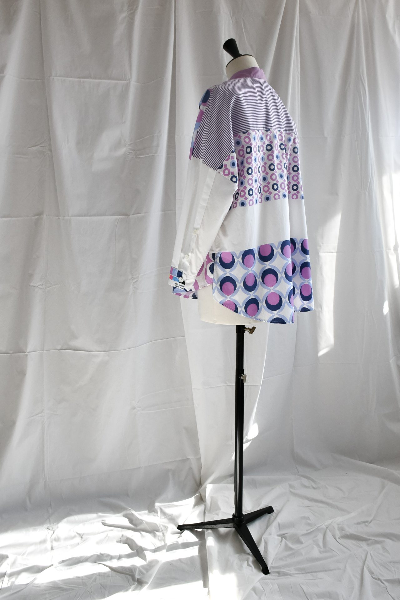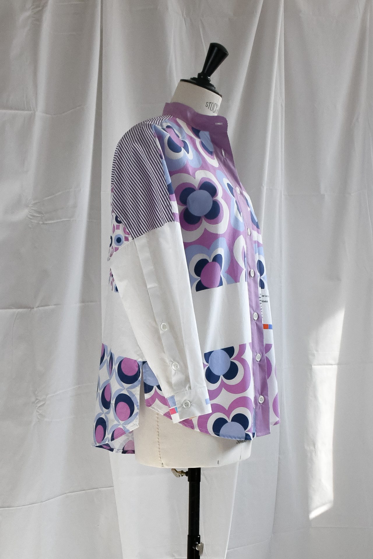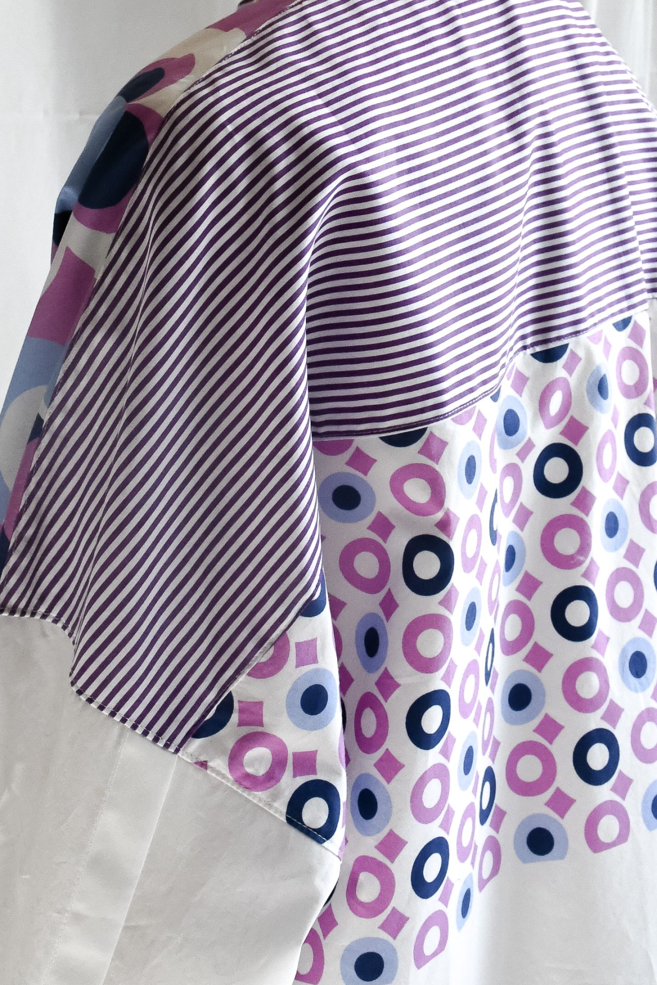 Camicia con collo alla coreana realizzata con patchwork di popeline tinta unita, a righe e stampati con motivo all-over sui toni del lilla, azzurro e bianco. Spacchetti laterali sul fianco. Bottoni su in madreperla naturale.