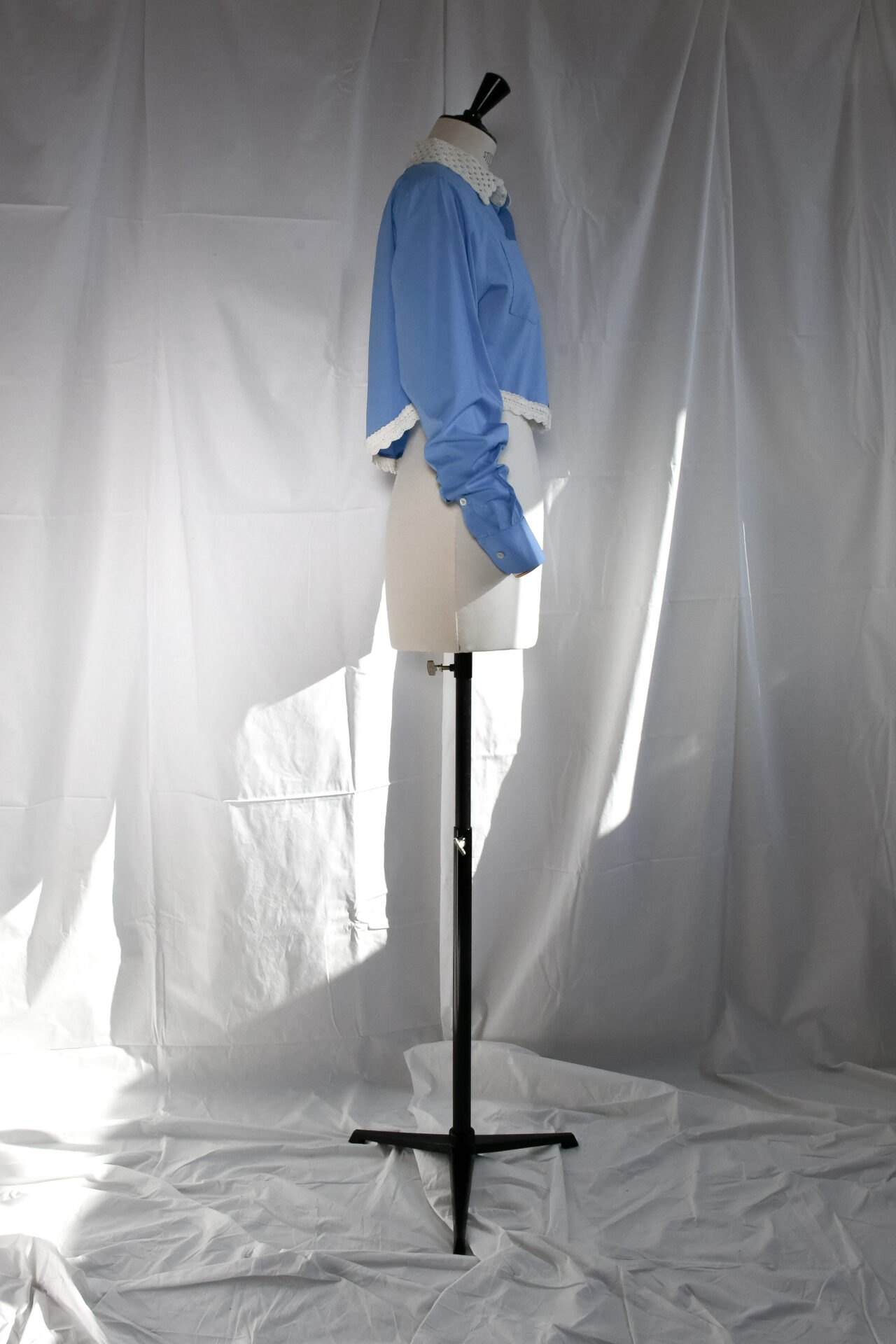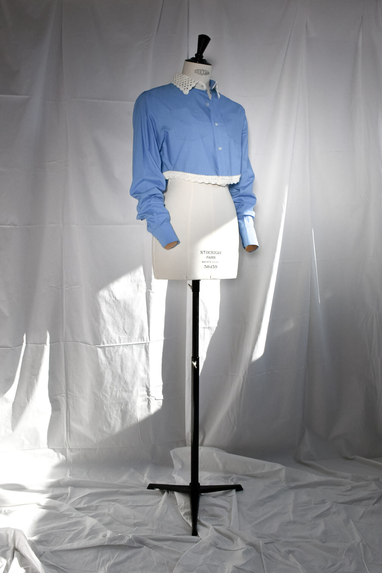 Camicia cropped realizzata in popeline di cotone azzurro con tasche applicate sul davanti, collo e orlo in crochet di cotone panna, fatti a mano. Bottoni madreperla naturale.