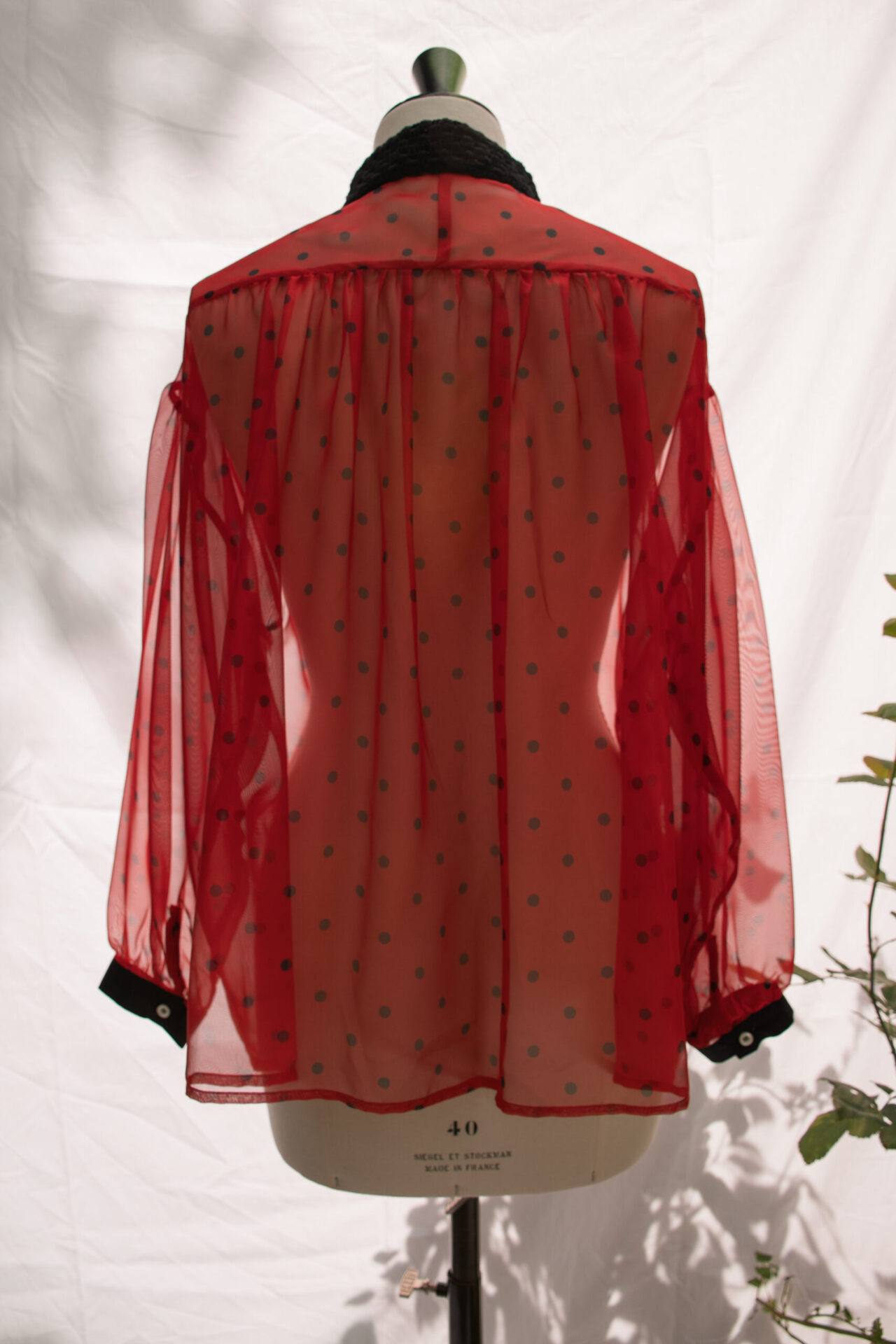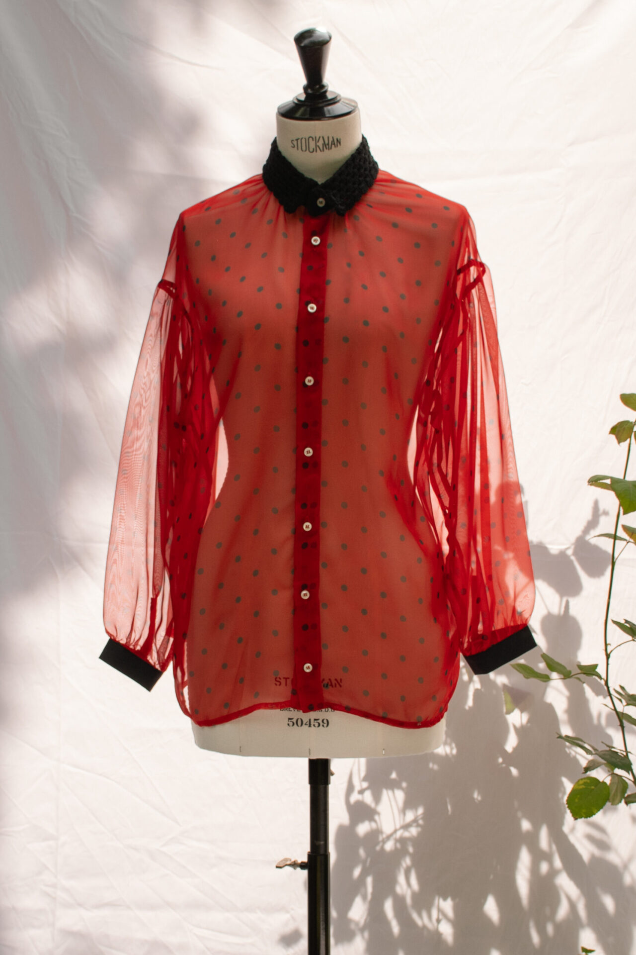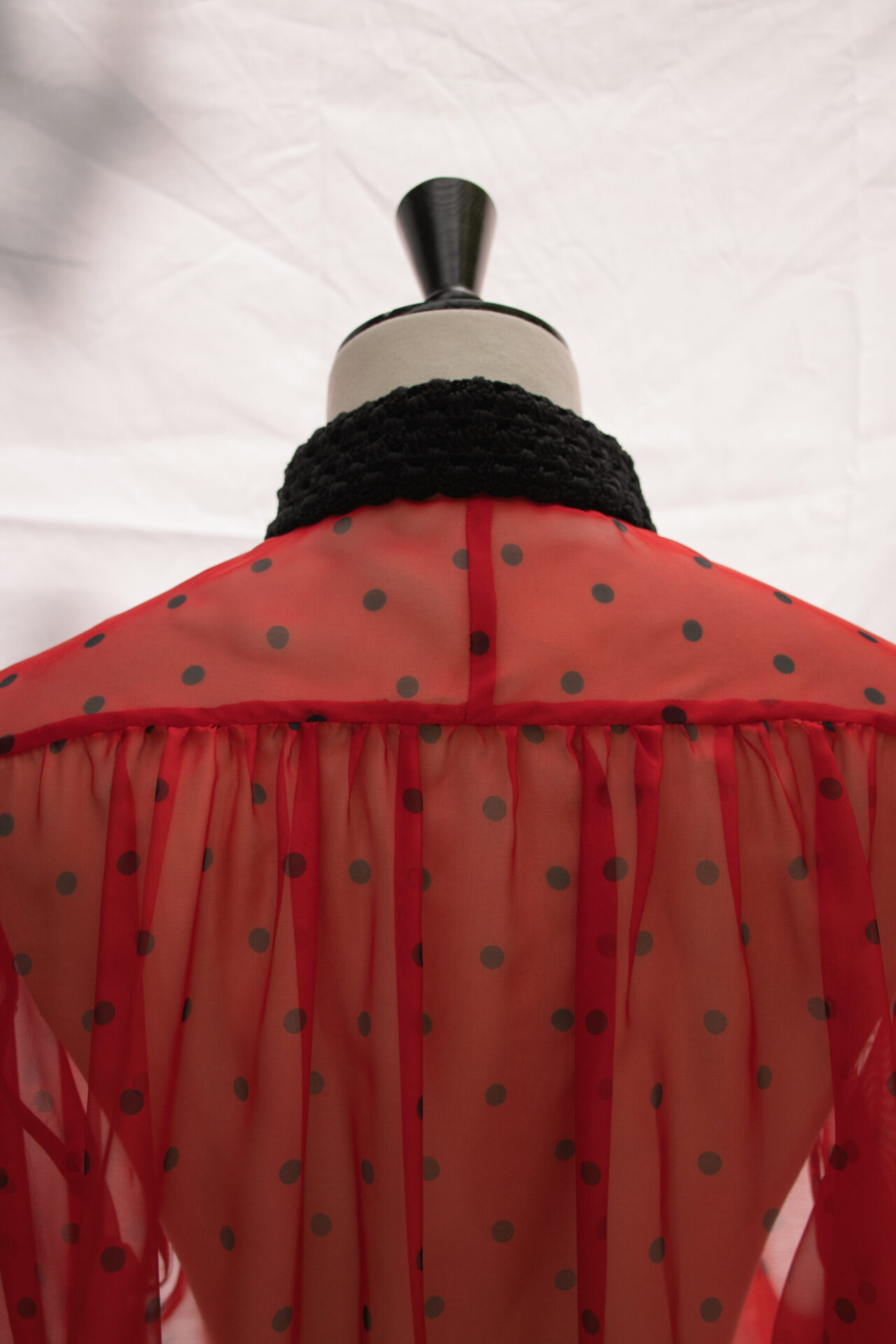 Camicia taglio “pittore” realizzata in chiffon di poliestere stampato a pois neri, con collo in crochet di cotone nero, fatto a mano e polsi in crêpe di seta nera. Bottoni madreperla naturale.