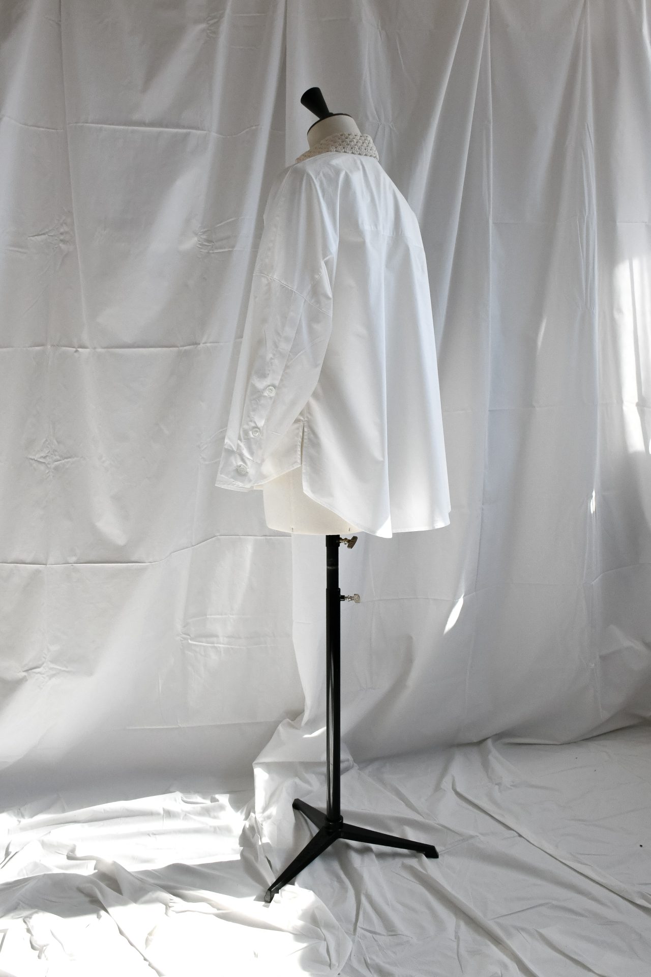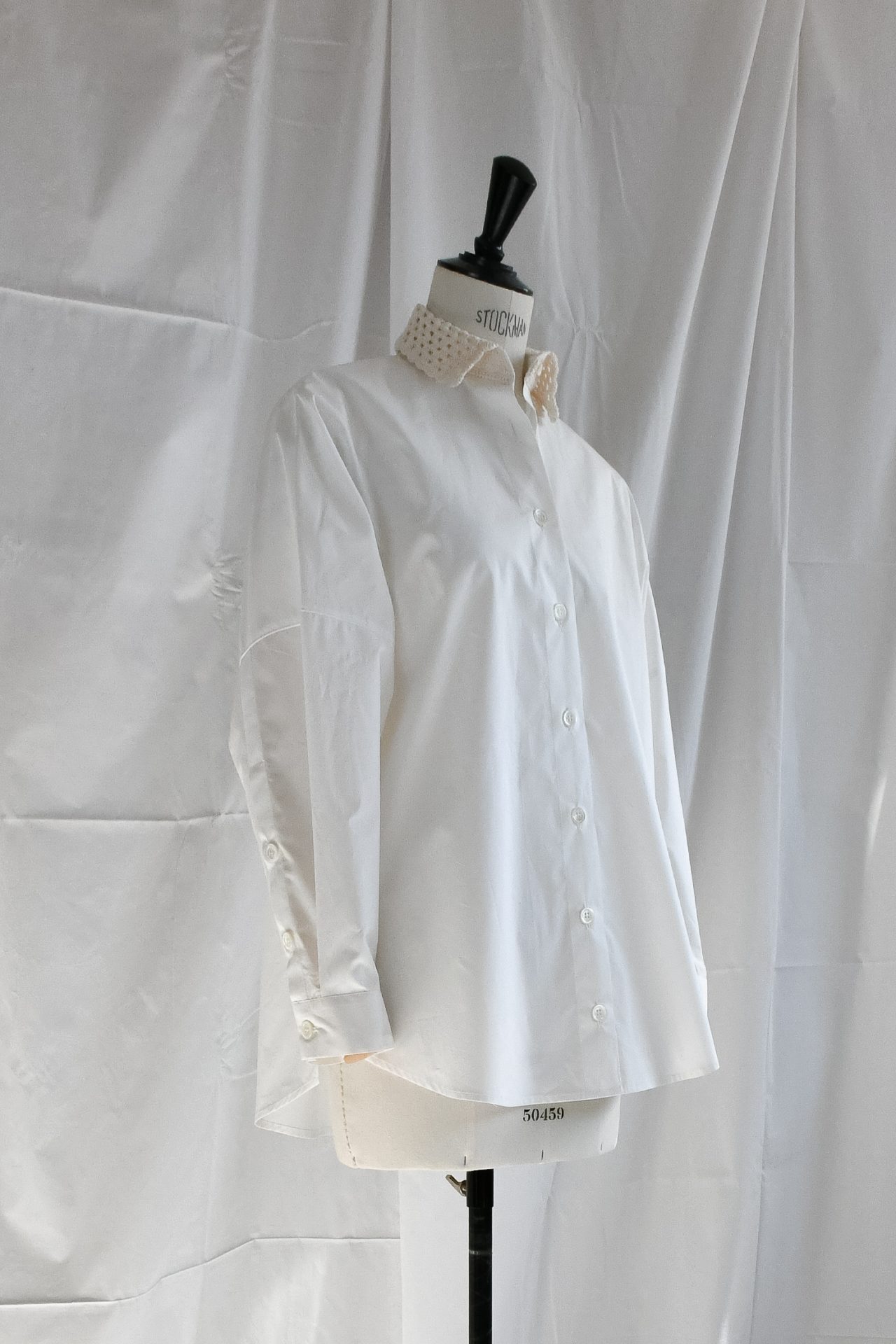 Camicia di popeline bianco con collo classico in crochet di cotone panna, fatto a mano. Spacchetti laterali sul fianco. Bottoni in madreperla naturale.