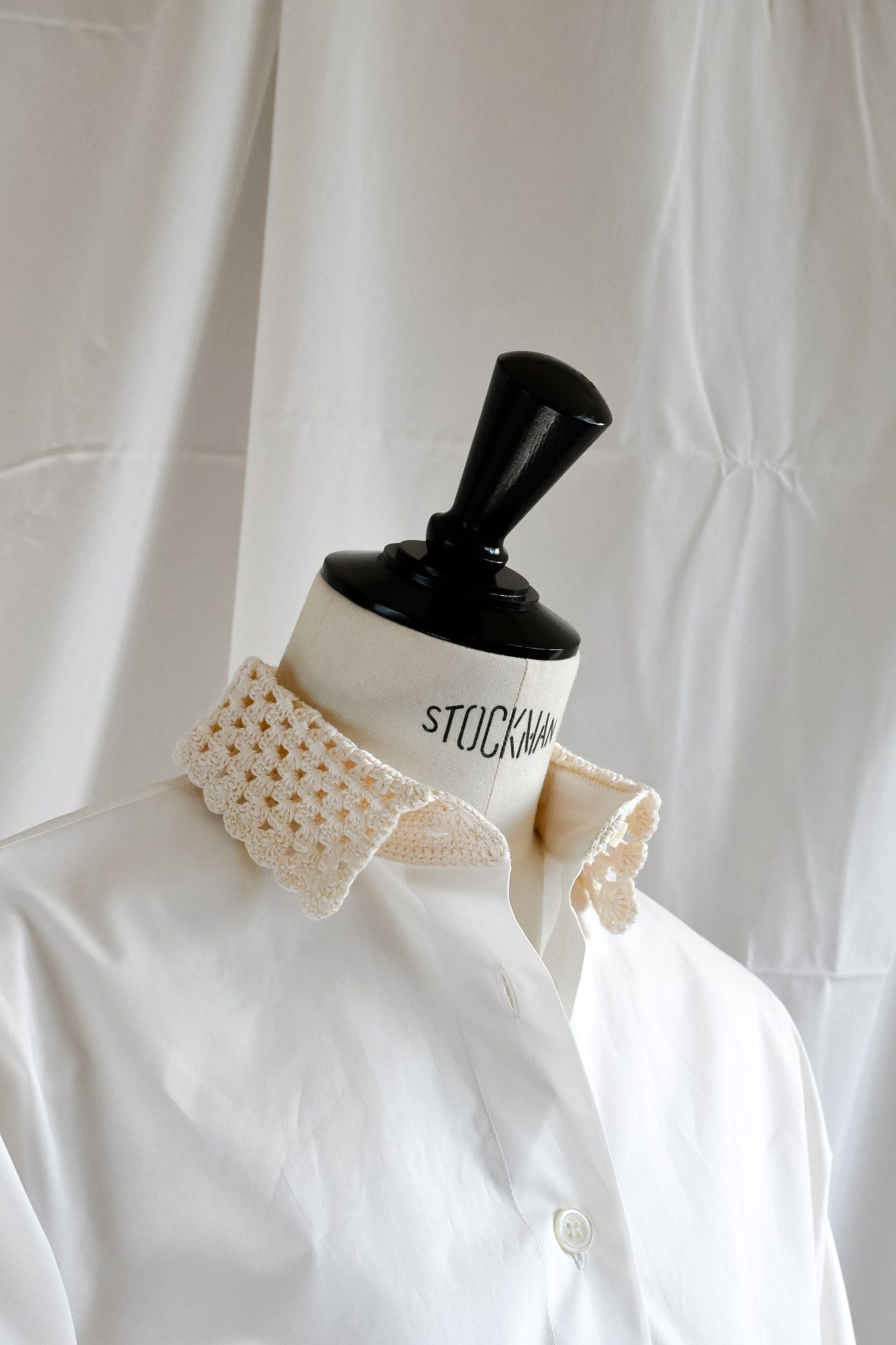 CAMICIA PULCINELLA BIANCA , COLLO CROCHET PANNA