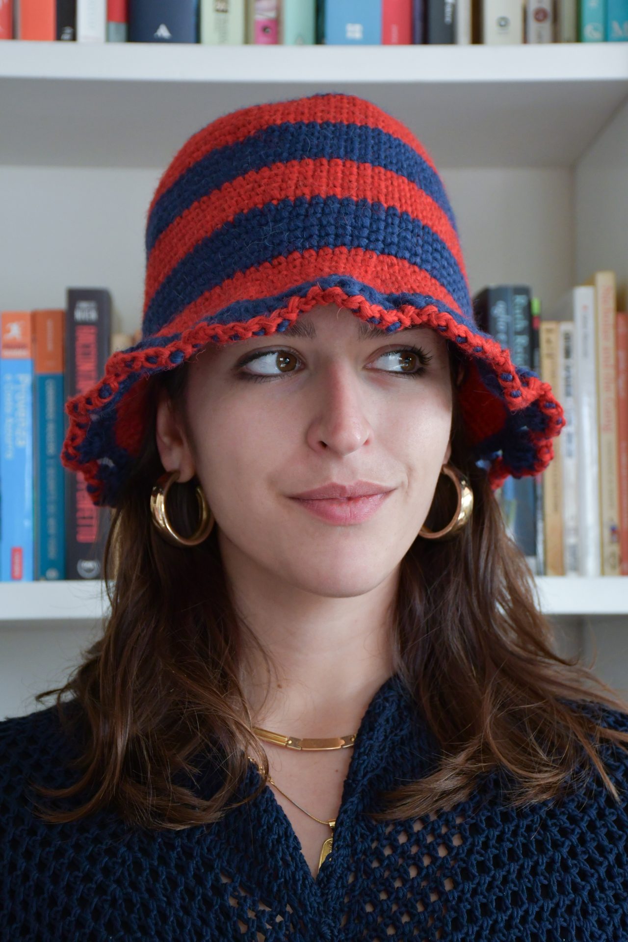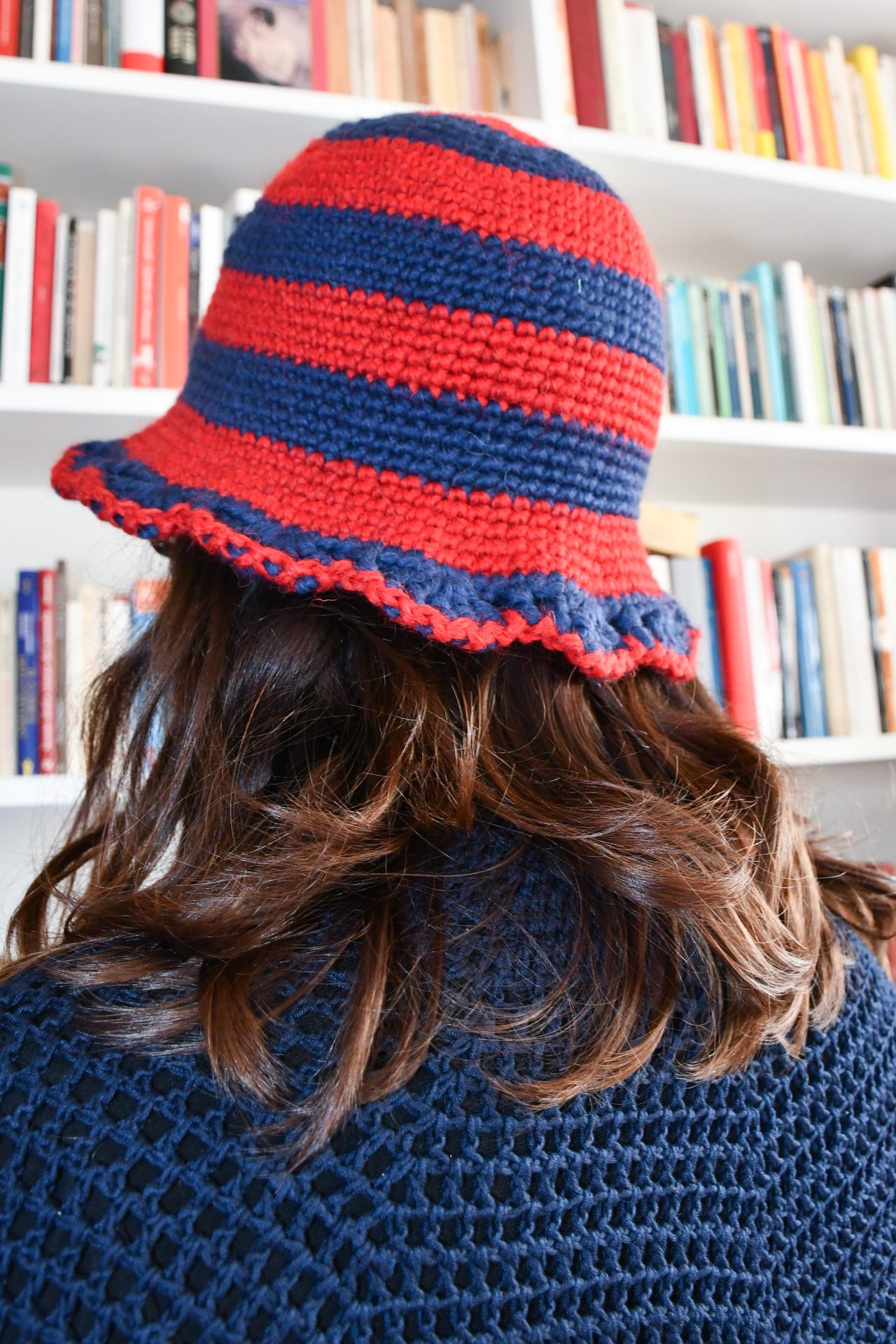 Cappellino fatto a mano all’uncinetto con filato misto di lana e alpaca, a righe rosso e blu con bordo a ventaglietti.
