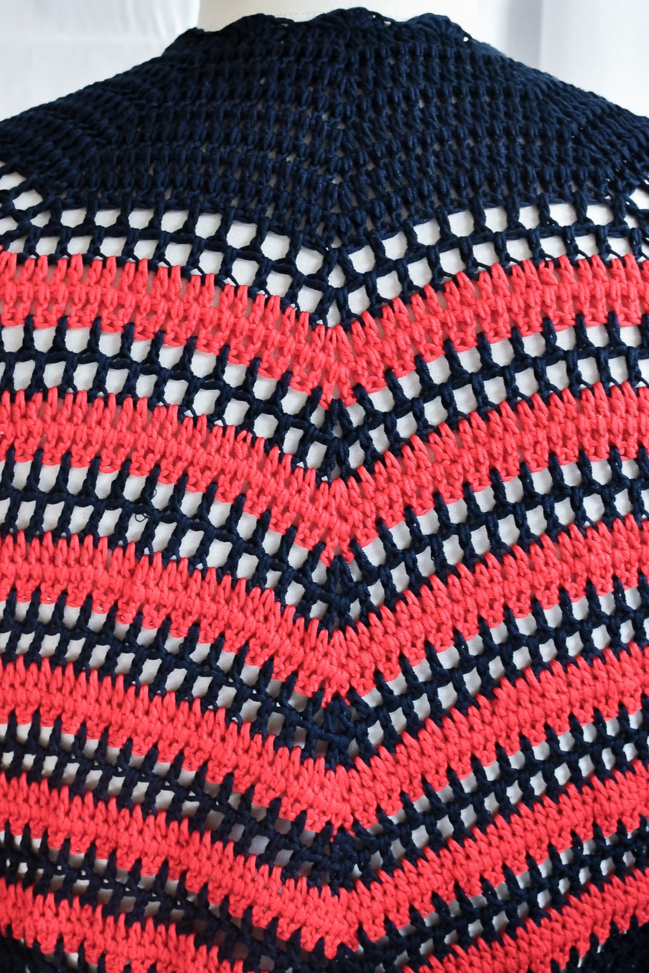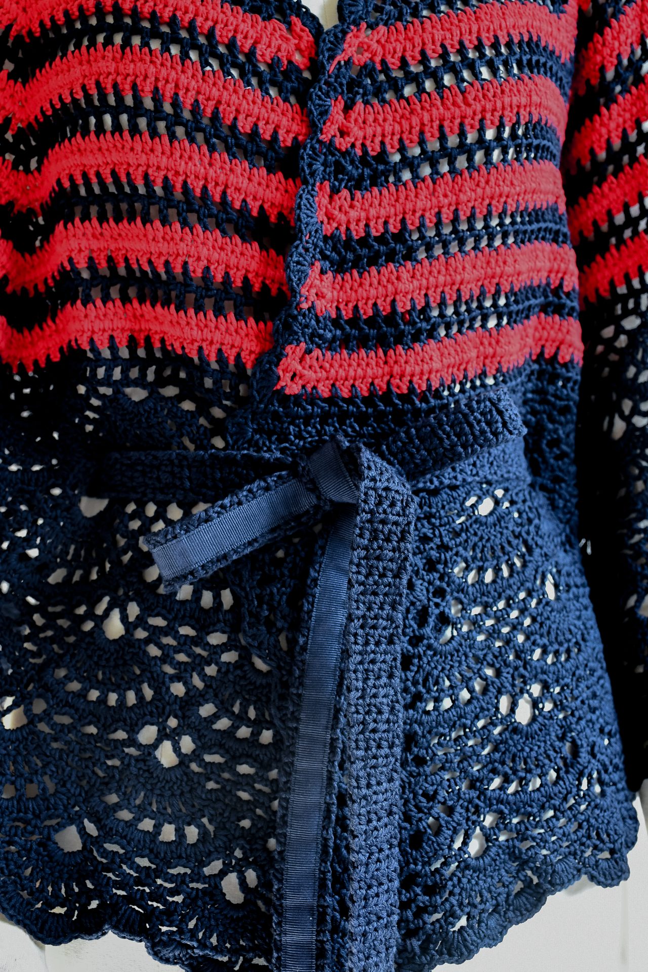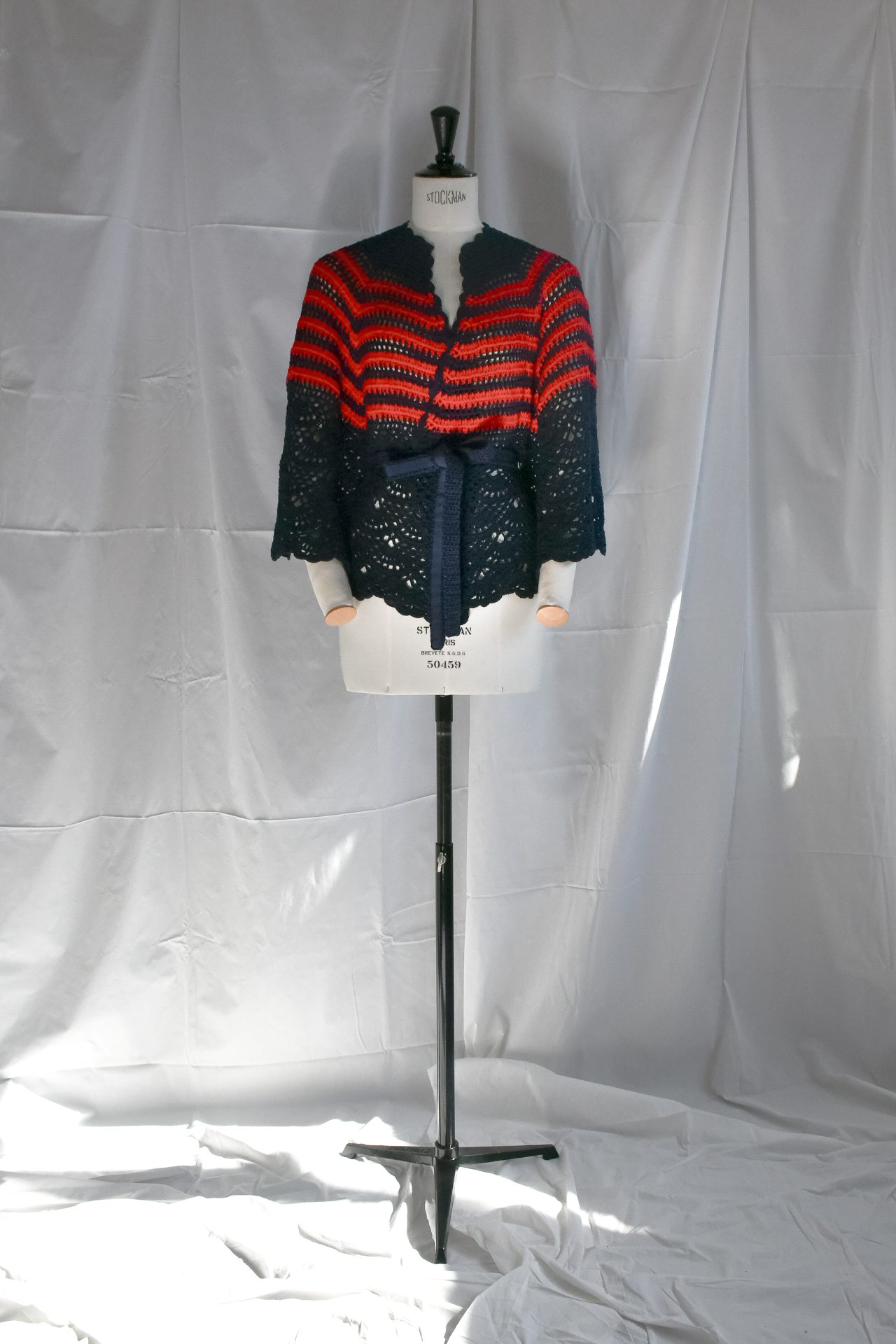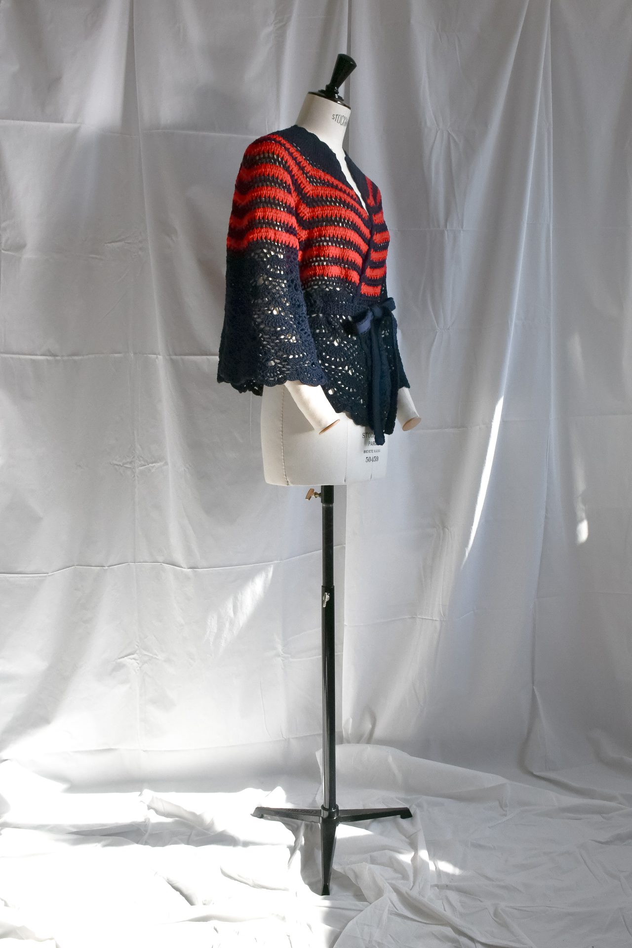 Cappetta fatta a mano in crochet, con filato di cotone blu e rosso, realizzata in punto alto, punto rete a righe piazzate orizzontali e punto pizzo. Incrociata sul davanti e regolabile in vita con cinturino in crochet blu, doppiato con nastro gros grain di cotone in tinta. E’ possibile rimuovere la cintura e portare la cappa appoggiandola sulle spalle.