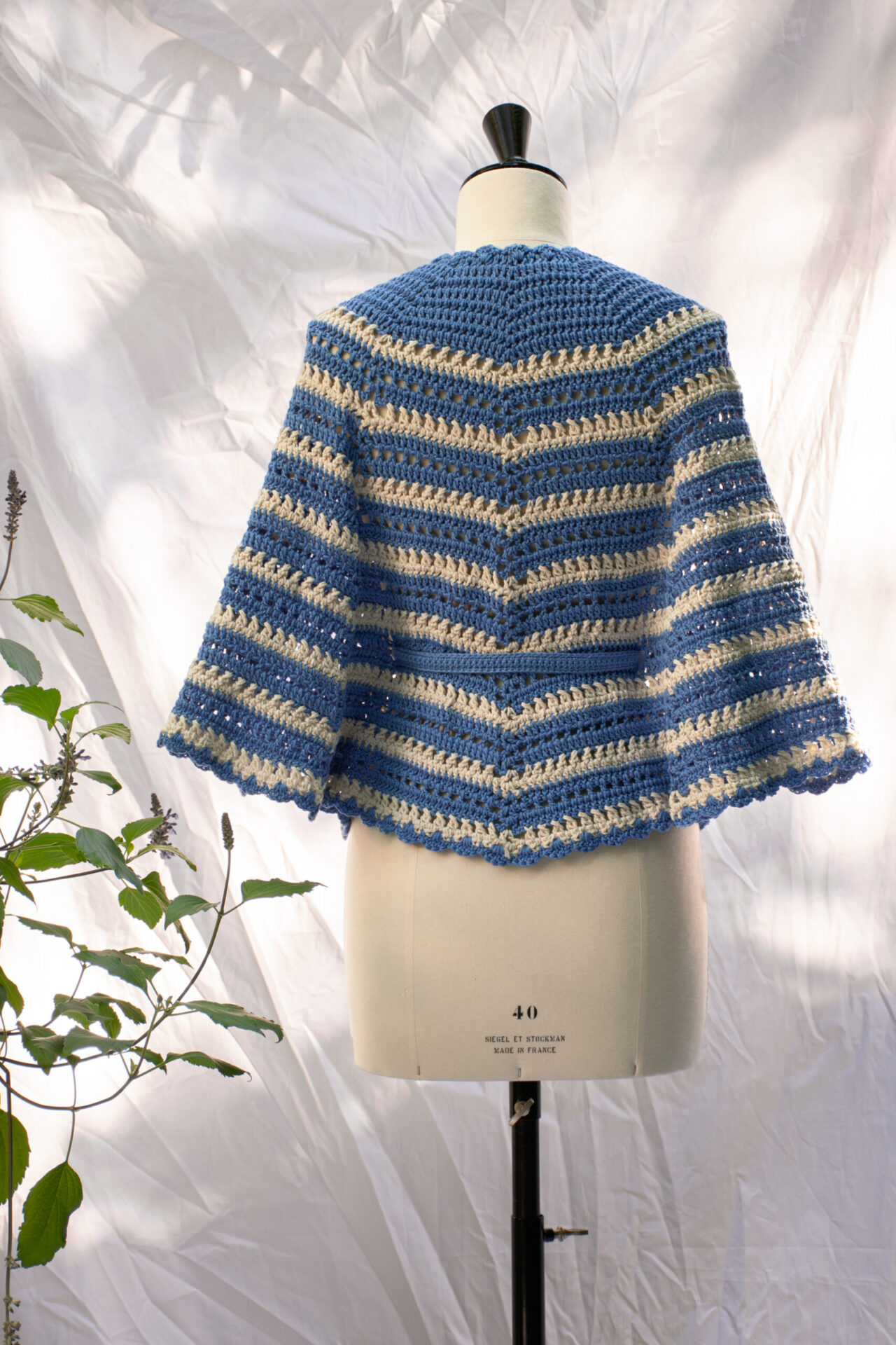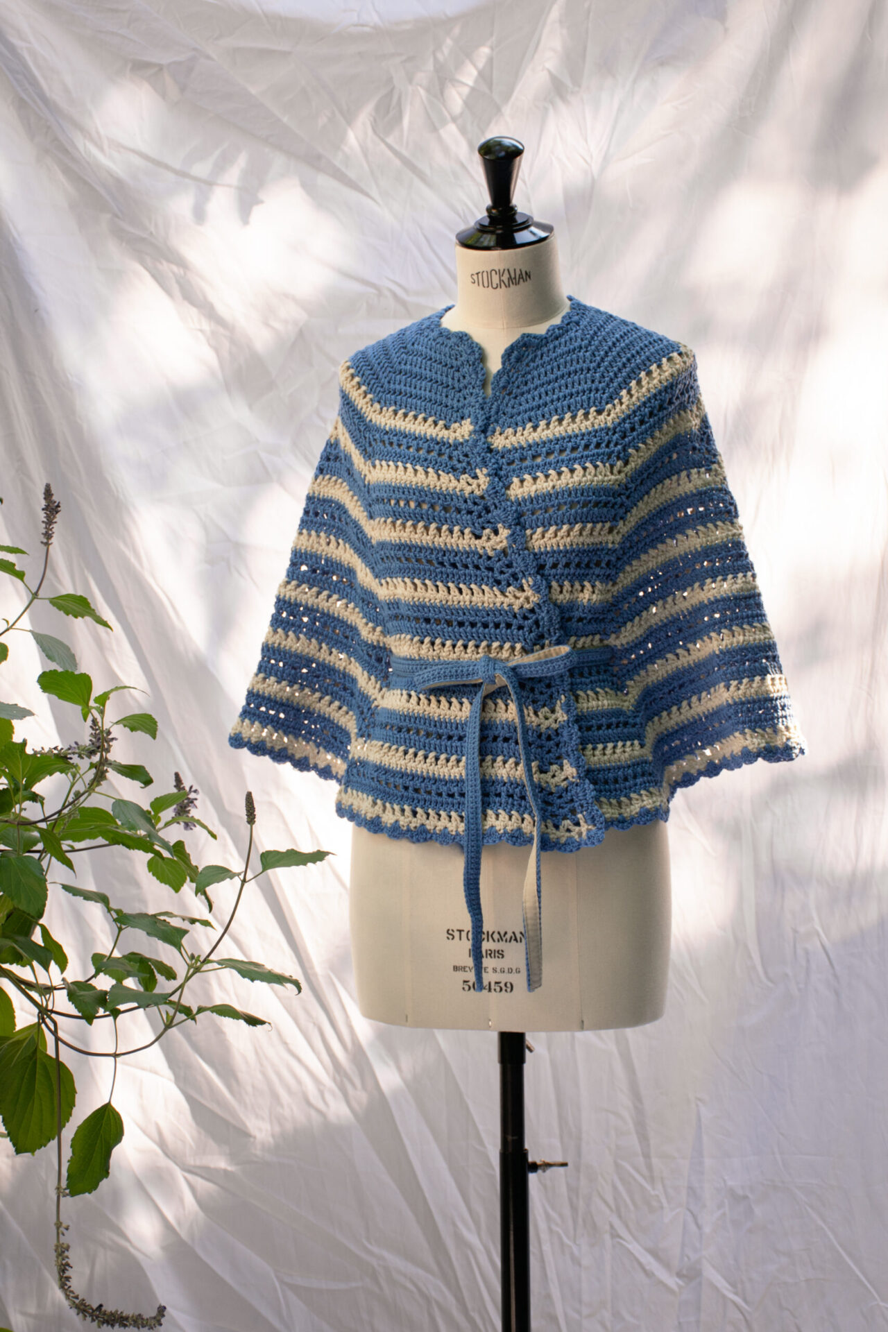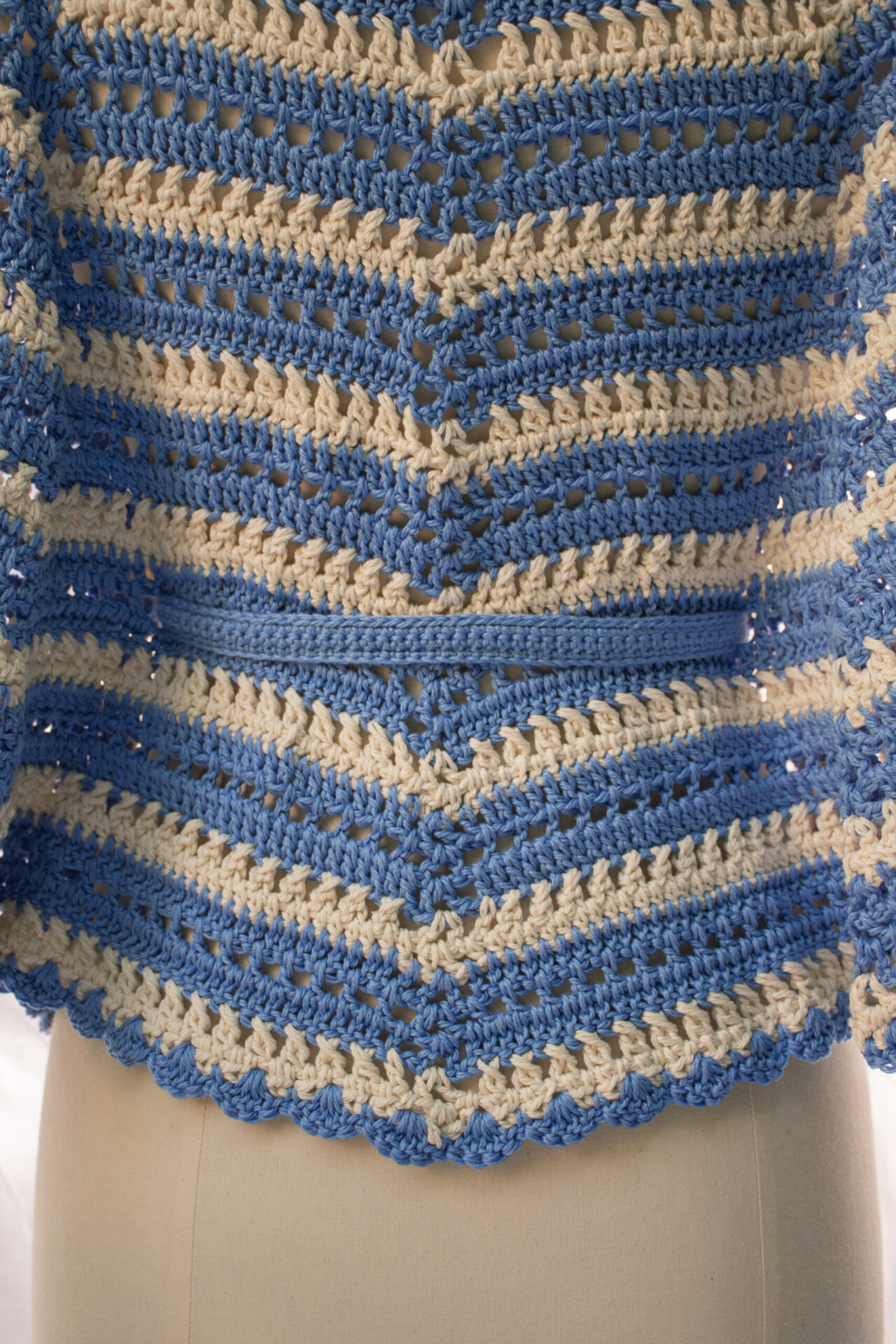 Cappetta fatta a mano in crochet con filato di cotone azzurro/panna a “righe Gaeta” orizzontali. Incrociata sul davanti e regolabile in vita con cinturino in crochet doppiato con nastro gros grain di cotone in contrasto. Bordo scollatura e davanti smerlato in crochet di cotone azzurro.