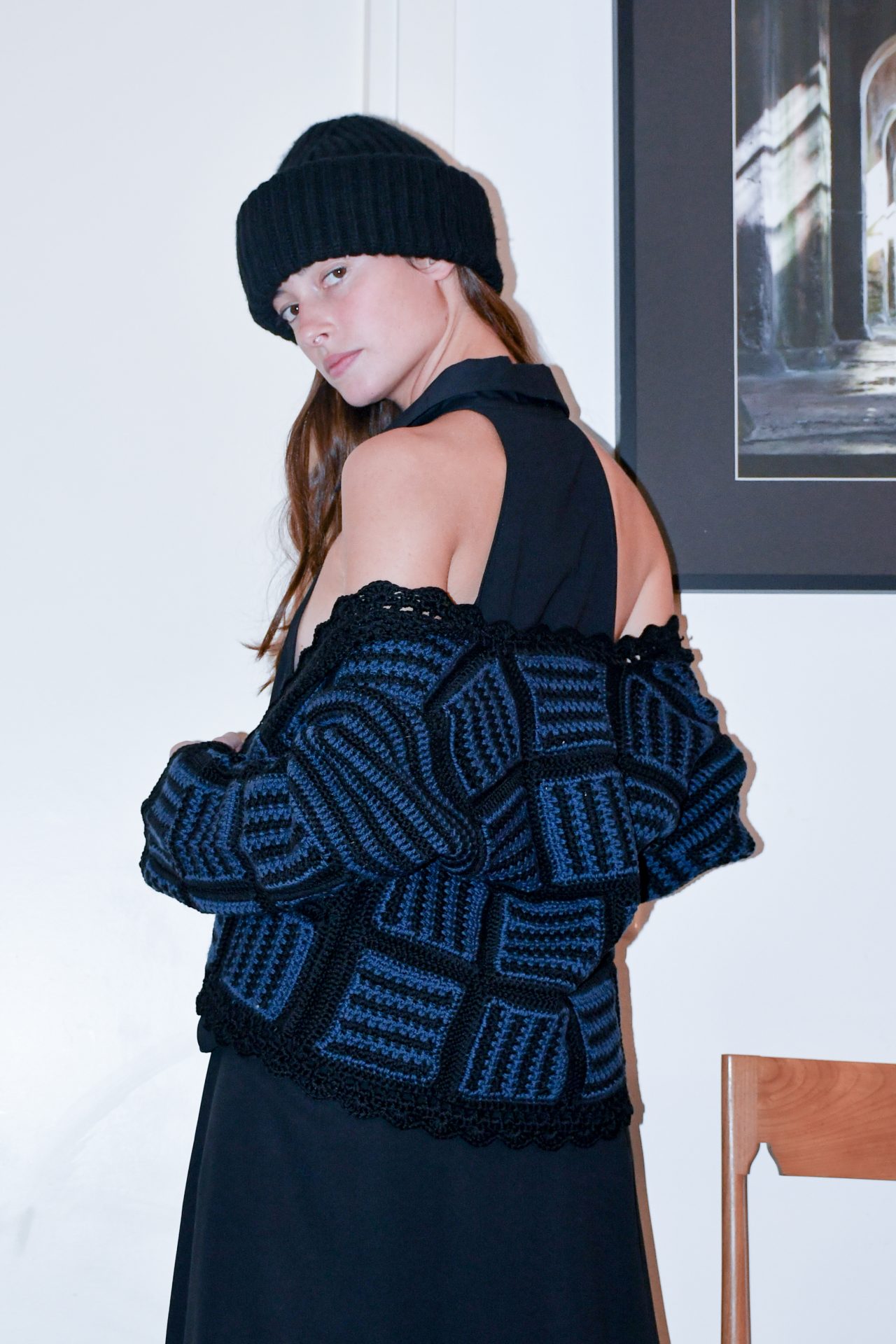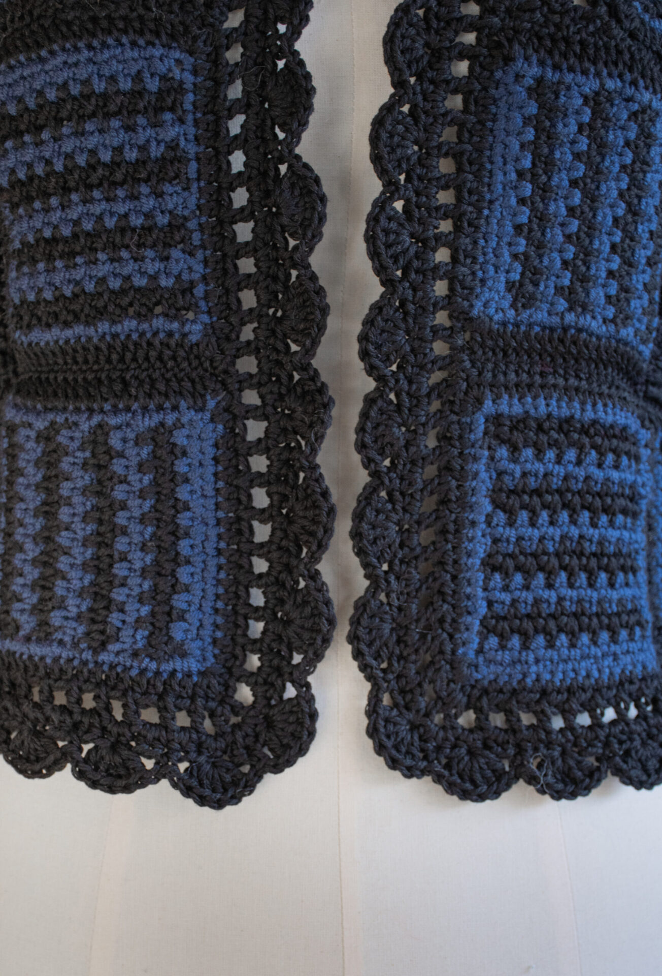 Cardigan corto lana e cotone blu nero crochet patchwork