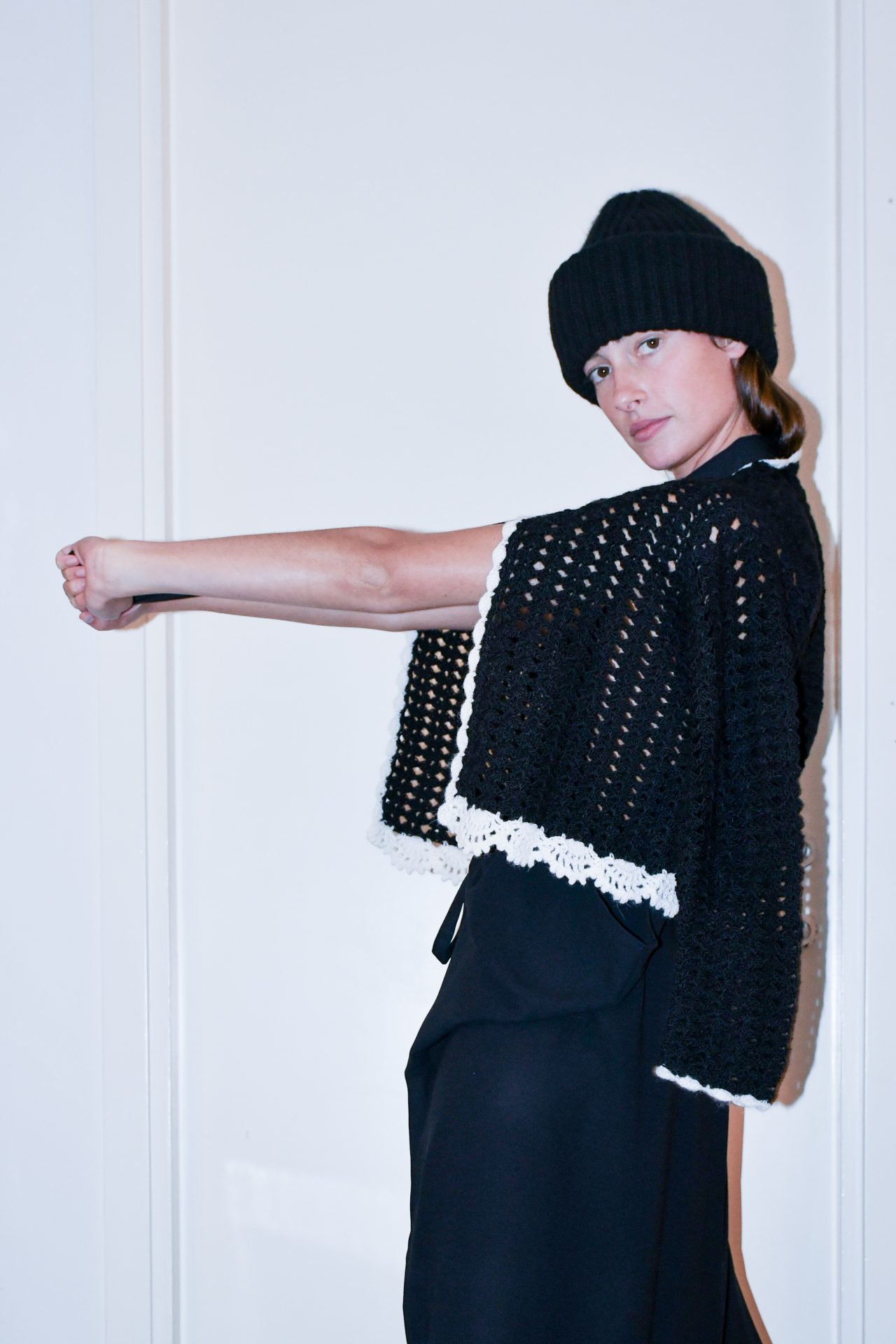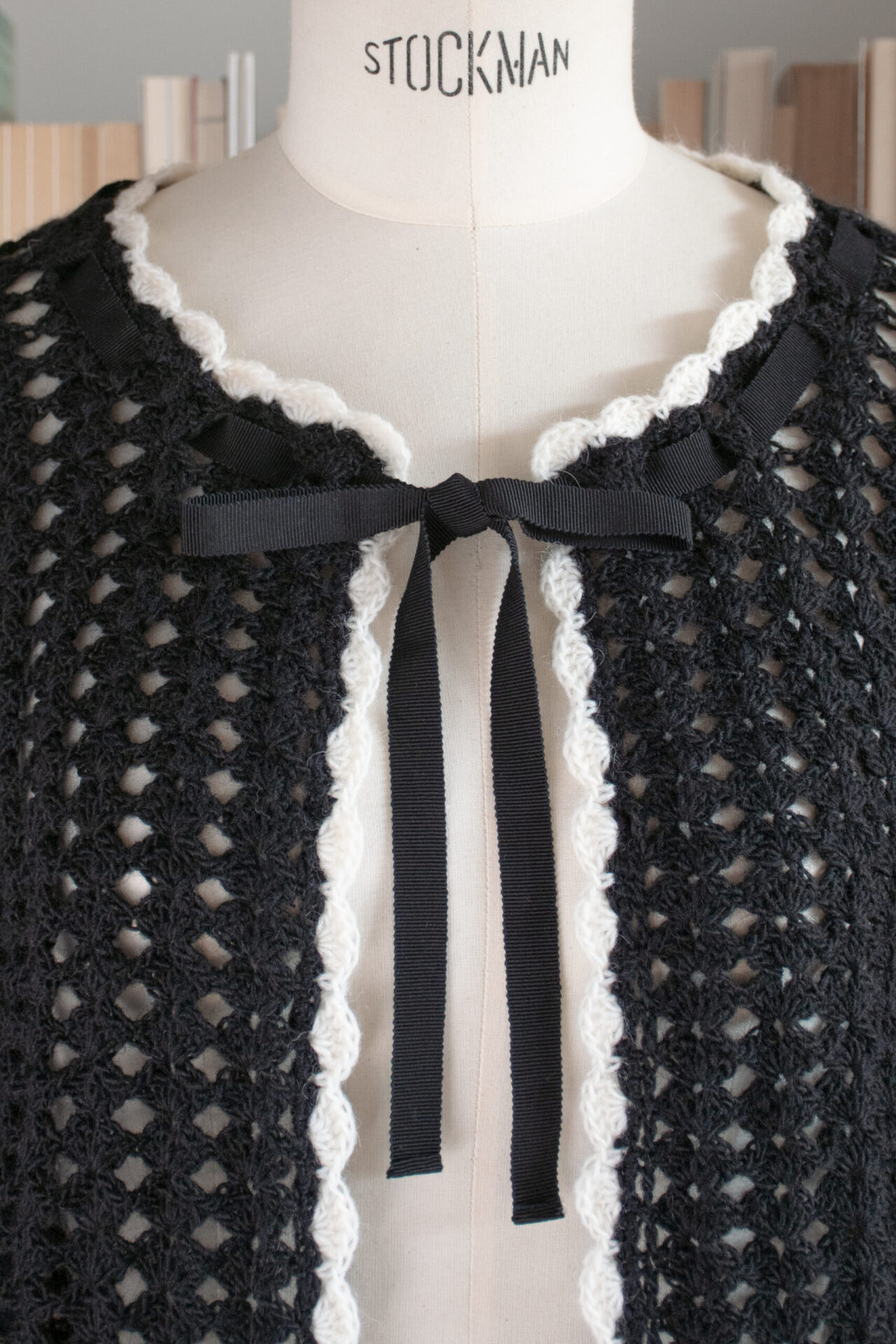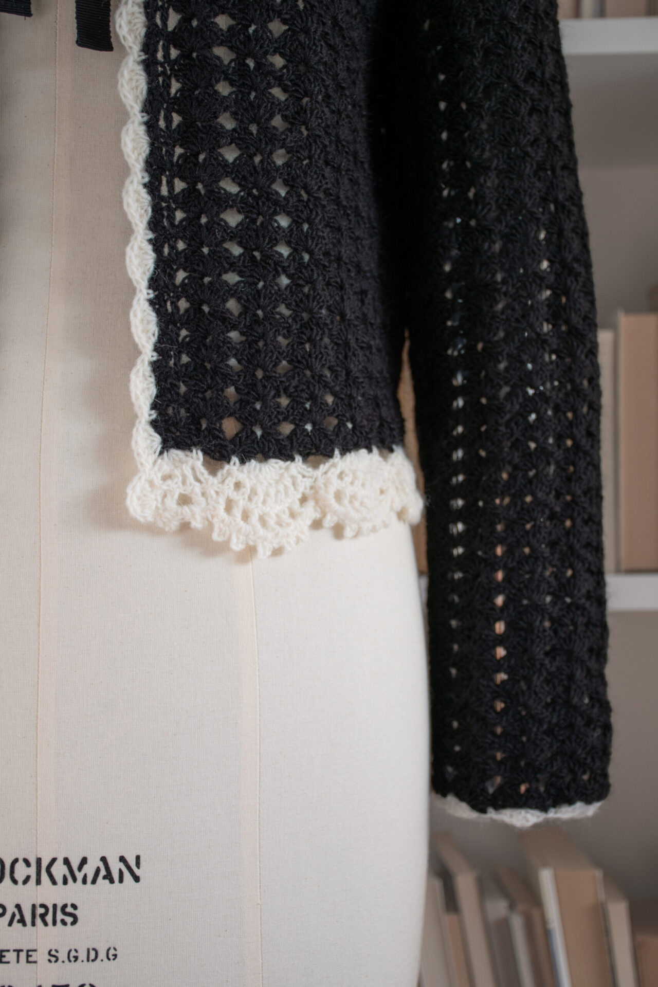 Cardigan corto fatto a mano in crochet con filato dahù, misto lana/alpaca/acrilico, nero/panna, realizzato in punto ventaglietti traforato. Girocollo e bordo davanti smerlati e orlo a ventaglietti panna. Nastrino in gros grais di cotone nero da allacciare sul davanti, inserito lungo il girocollo.