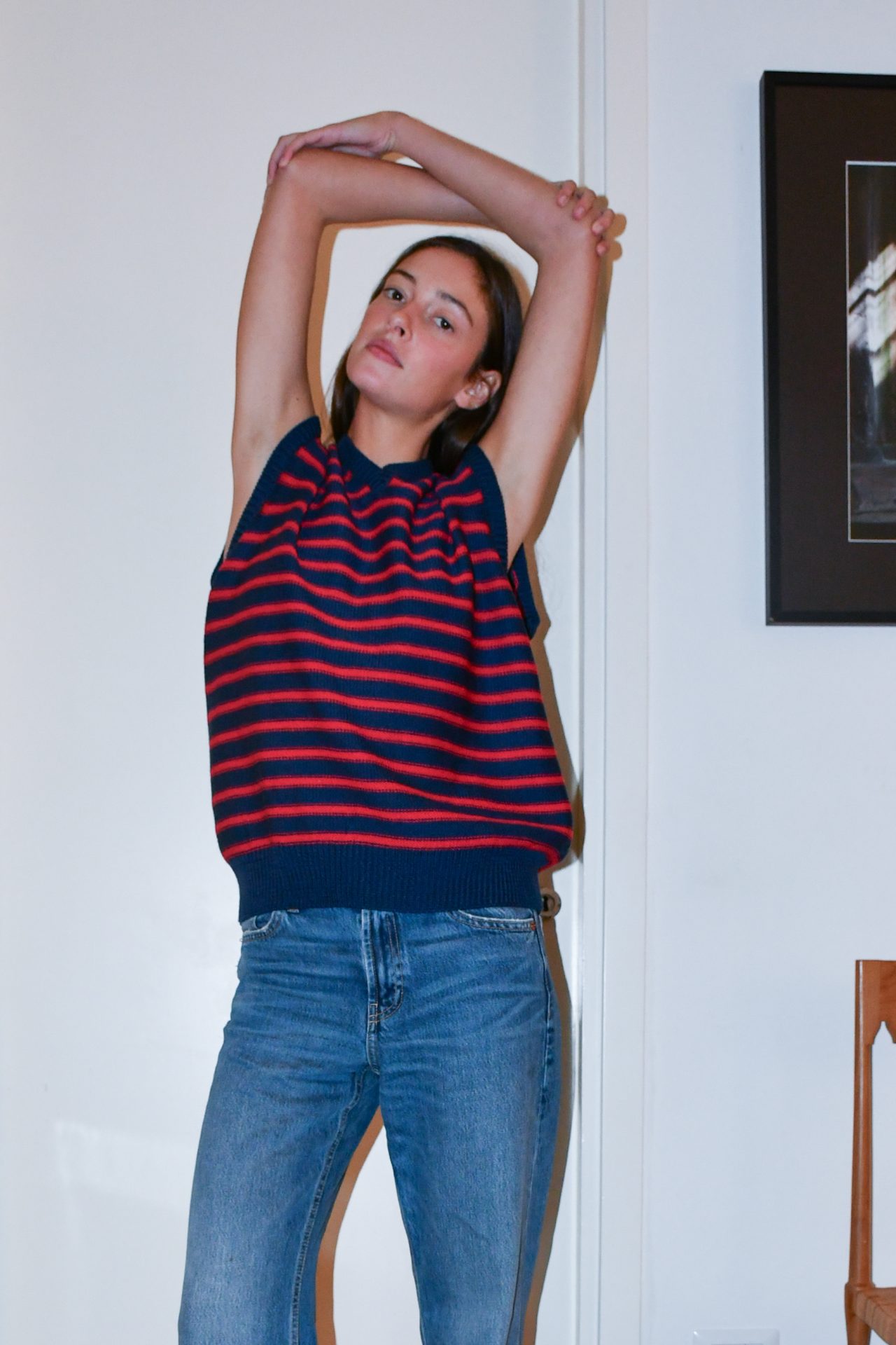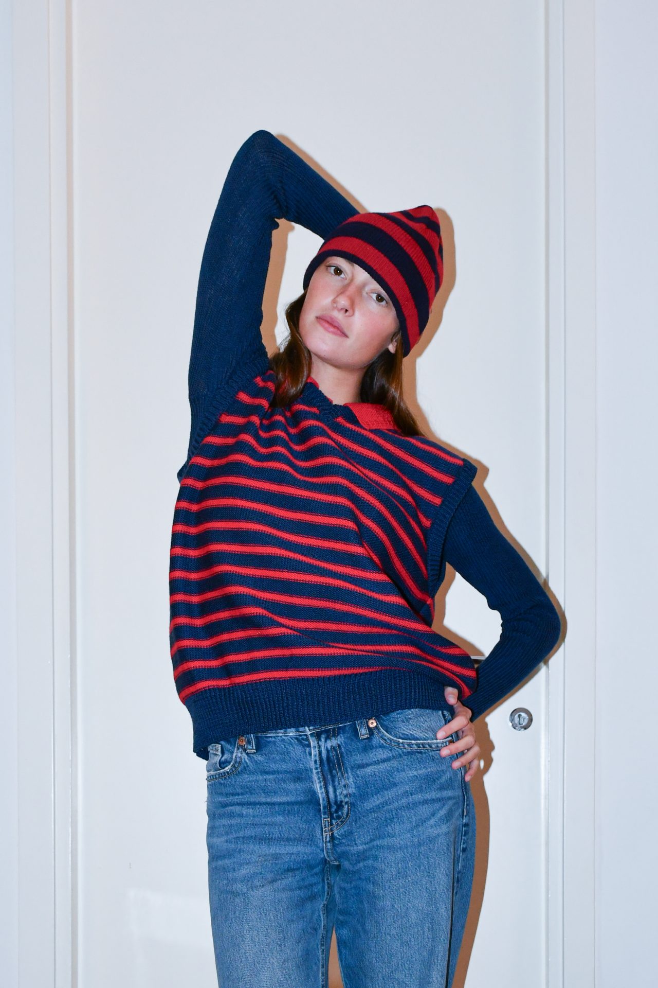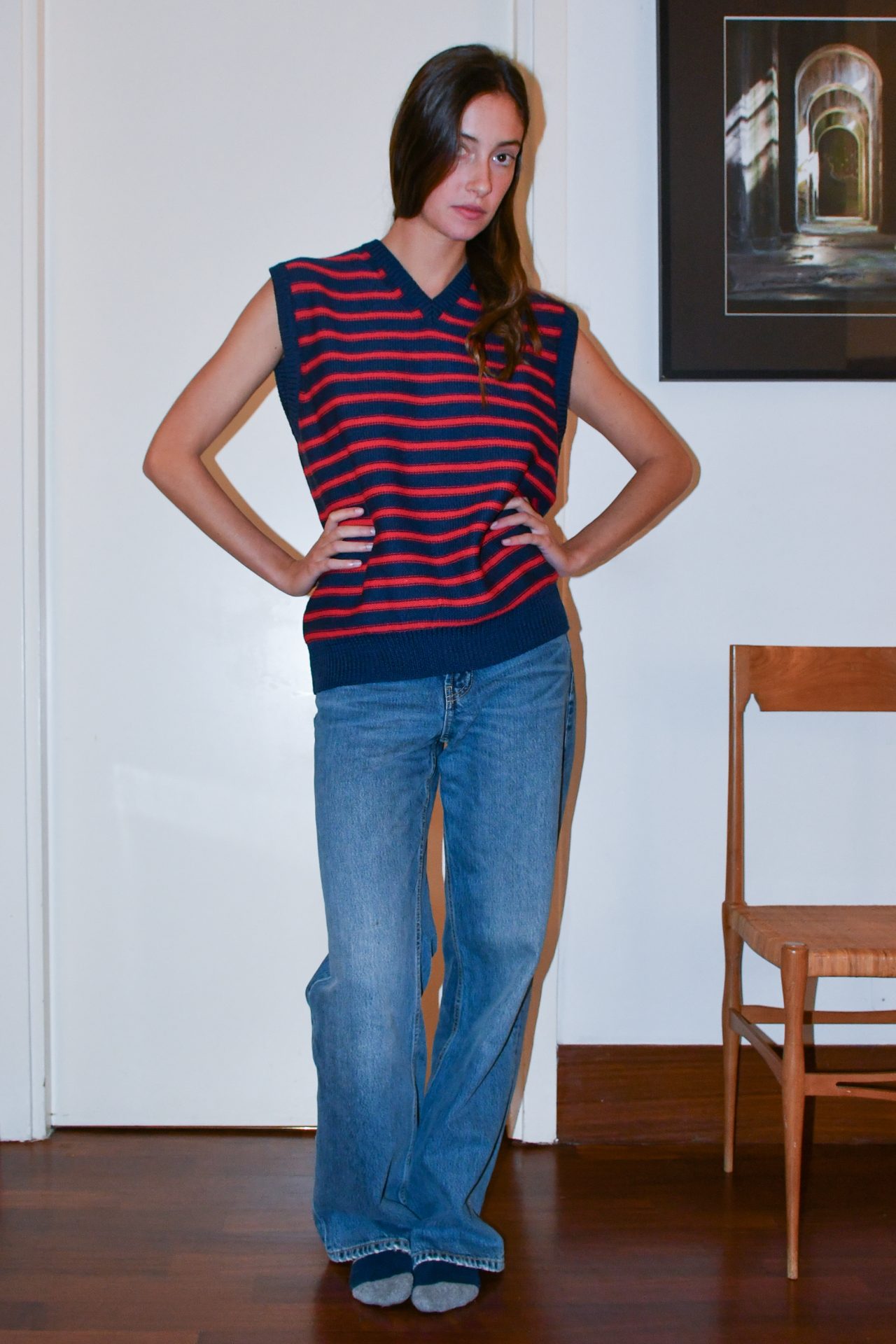 Gilet oversize con scollo a V realizzato a macchina manuale con filato di lana merino blu e rosso in punto rasato rovescio a righe orizzontali. Scollo, giro manica e orlo a costine blu.