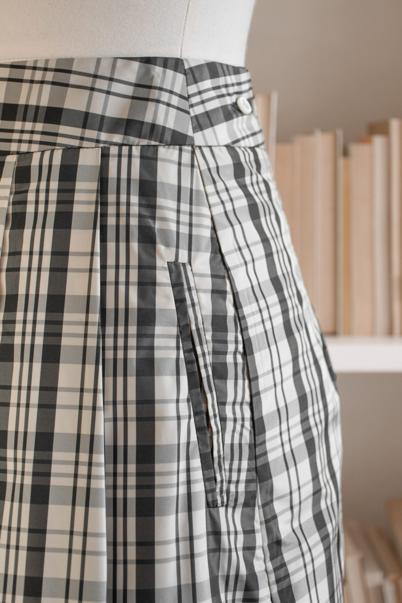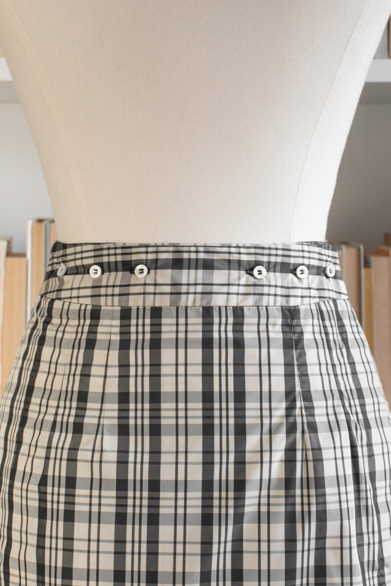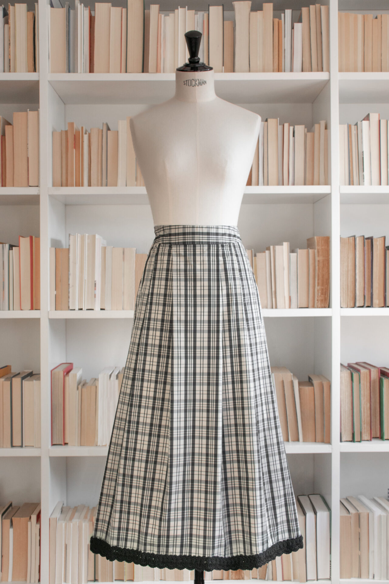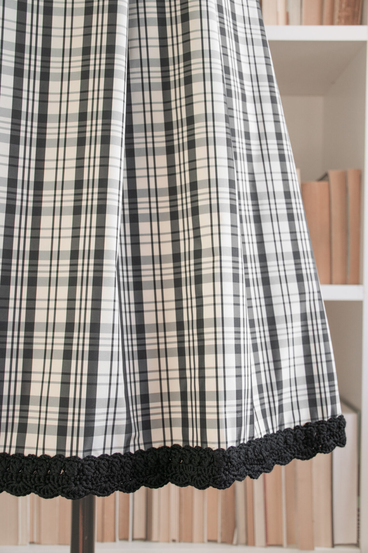 Gonna a pieghe a portafoglio in taffetà check di poliestere, con cinturino e chiusura regolabile sul retro con bottoni madreperla naturale; tasche a filetto nei fianchi. Orlo in crochet smerlato di lana merino nero, fatto a mano.