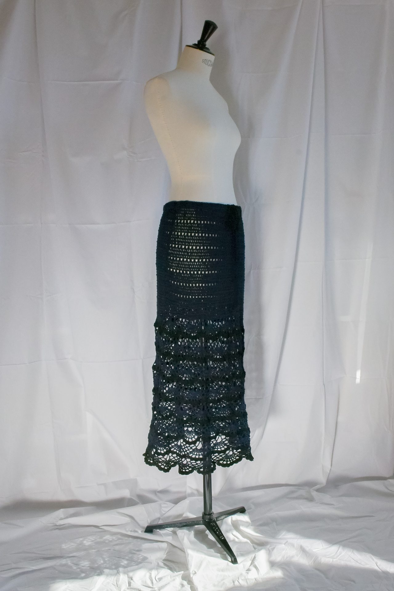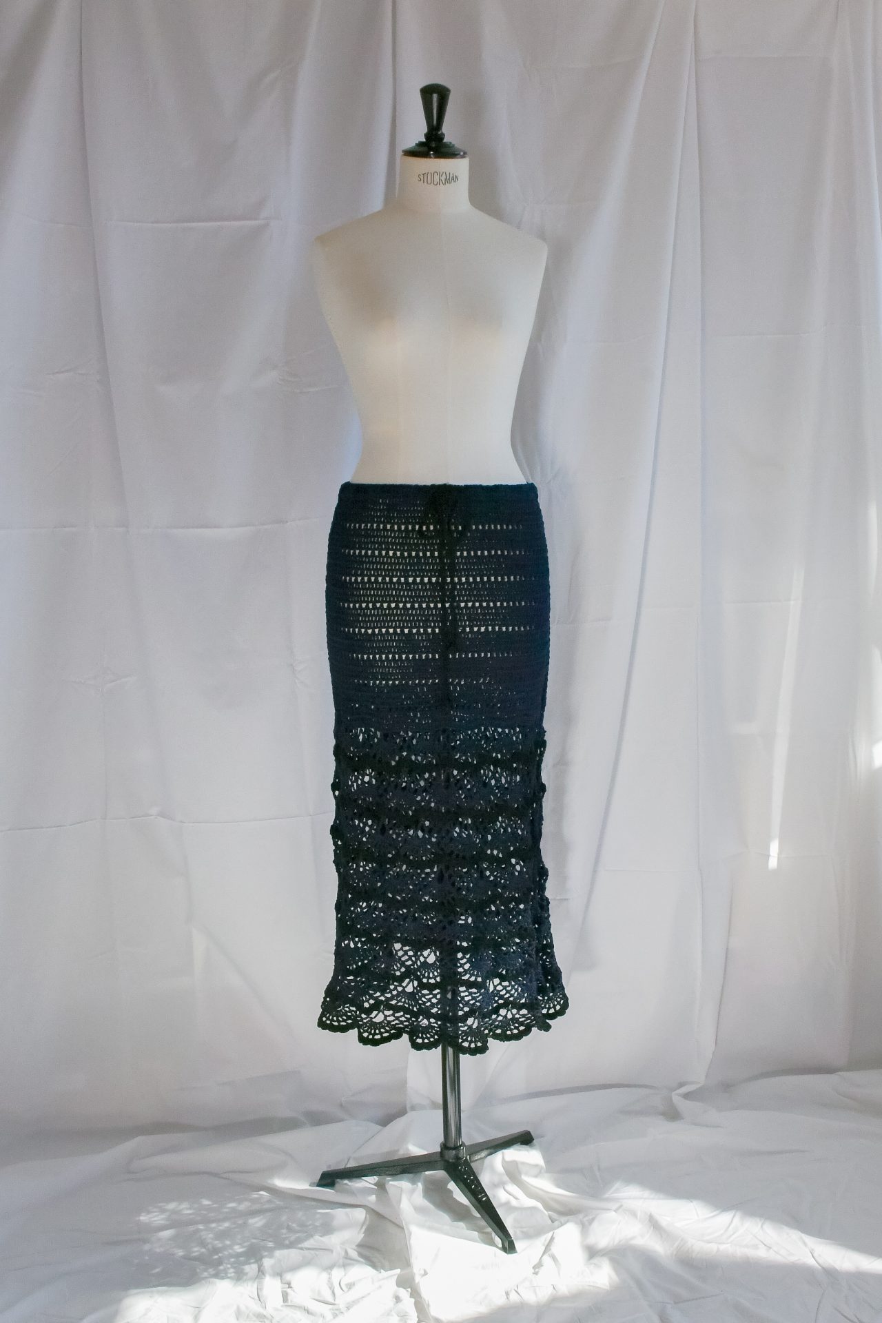 Gonna svasata, fatta a mano in crochet con filato di cotone blu, baschina realizzata in punto alto e balza in punto pizzo con rifiniture archi nere. Cinturino in vita con elastico interno e cordino lavorato a catenella in cotone nero.