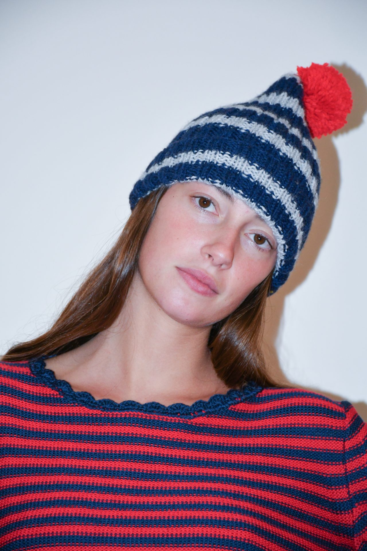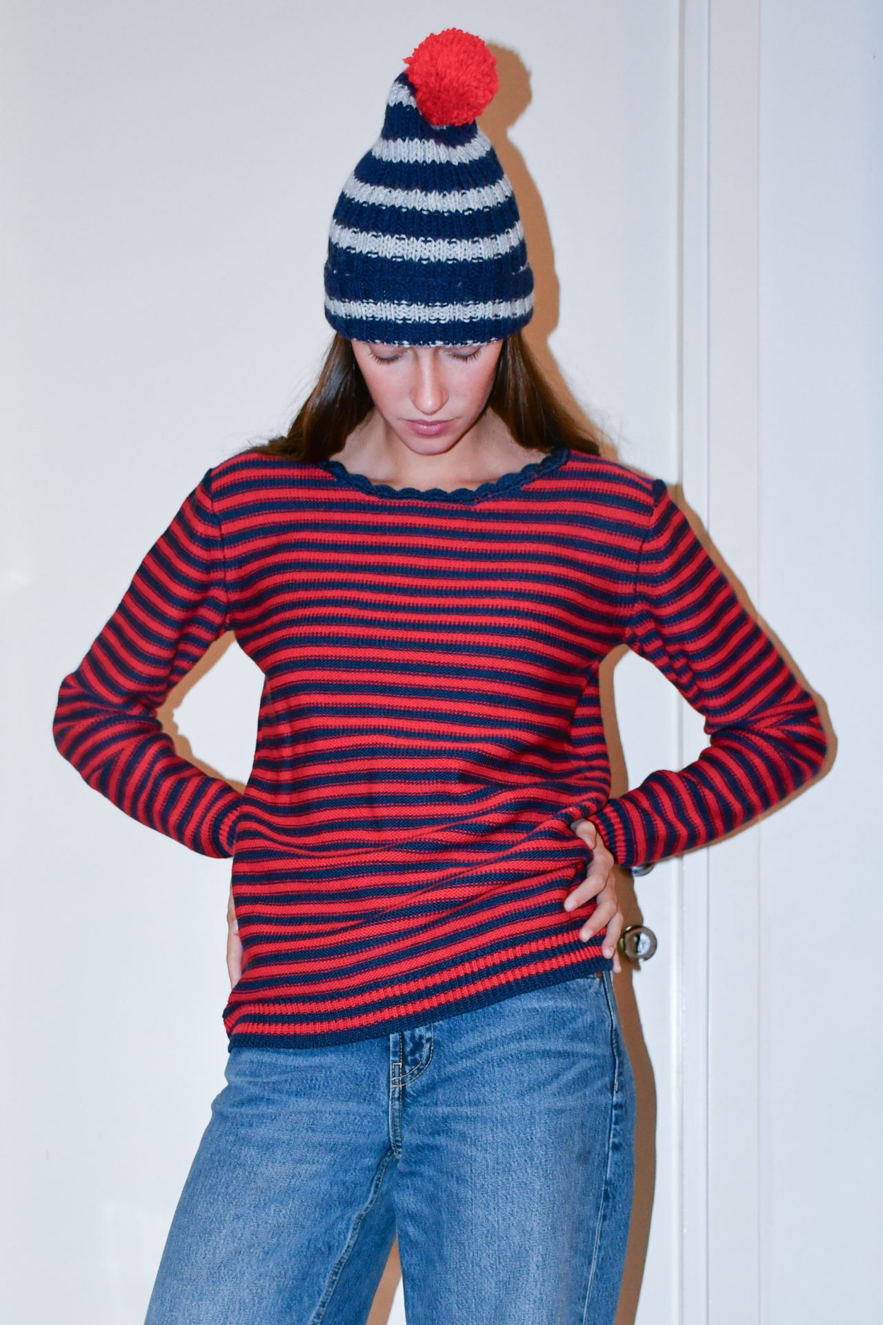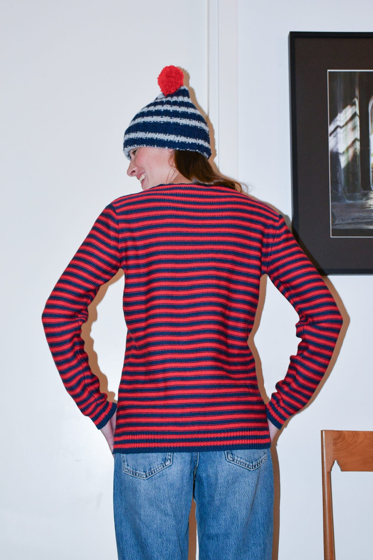 Maglia rasata a righe realizzata a macchina manuale con filato di lana merino blu e rosso. Polsi e orlo a costine, collo rifinito all’uncinetto con archetti in lana blu.