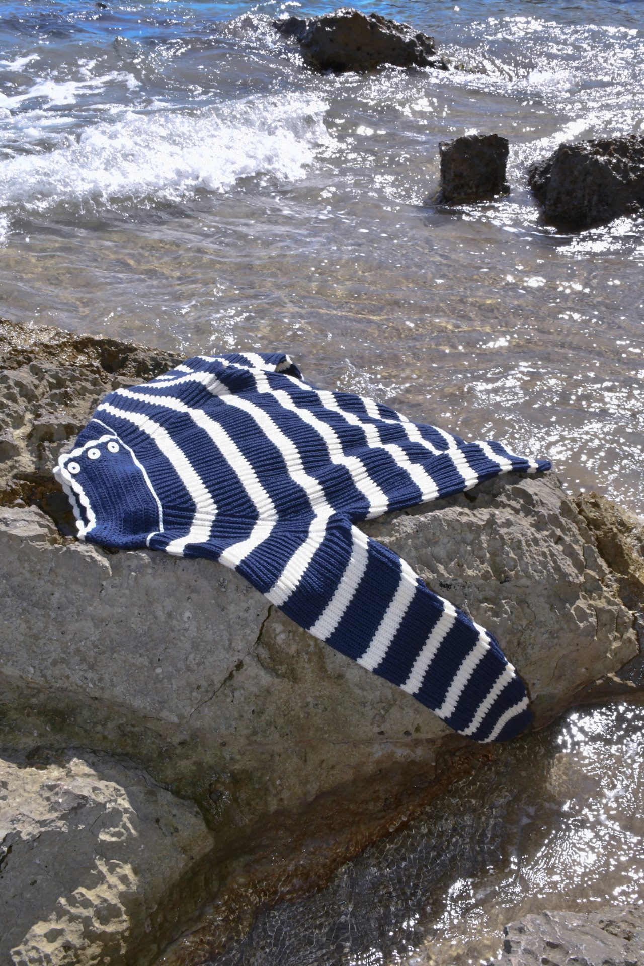 Maglione realizzato a macchina manuale con filato di lana merino blu/panna, realizzato in punto costa inglese a righe orizzontali; con collo alto e carré smerlato in crochet blu con cannoncino in lana merino panna, fatto a mano.