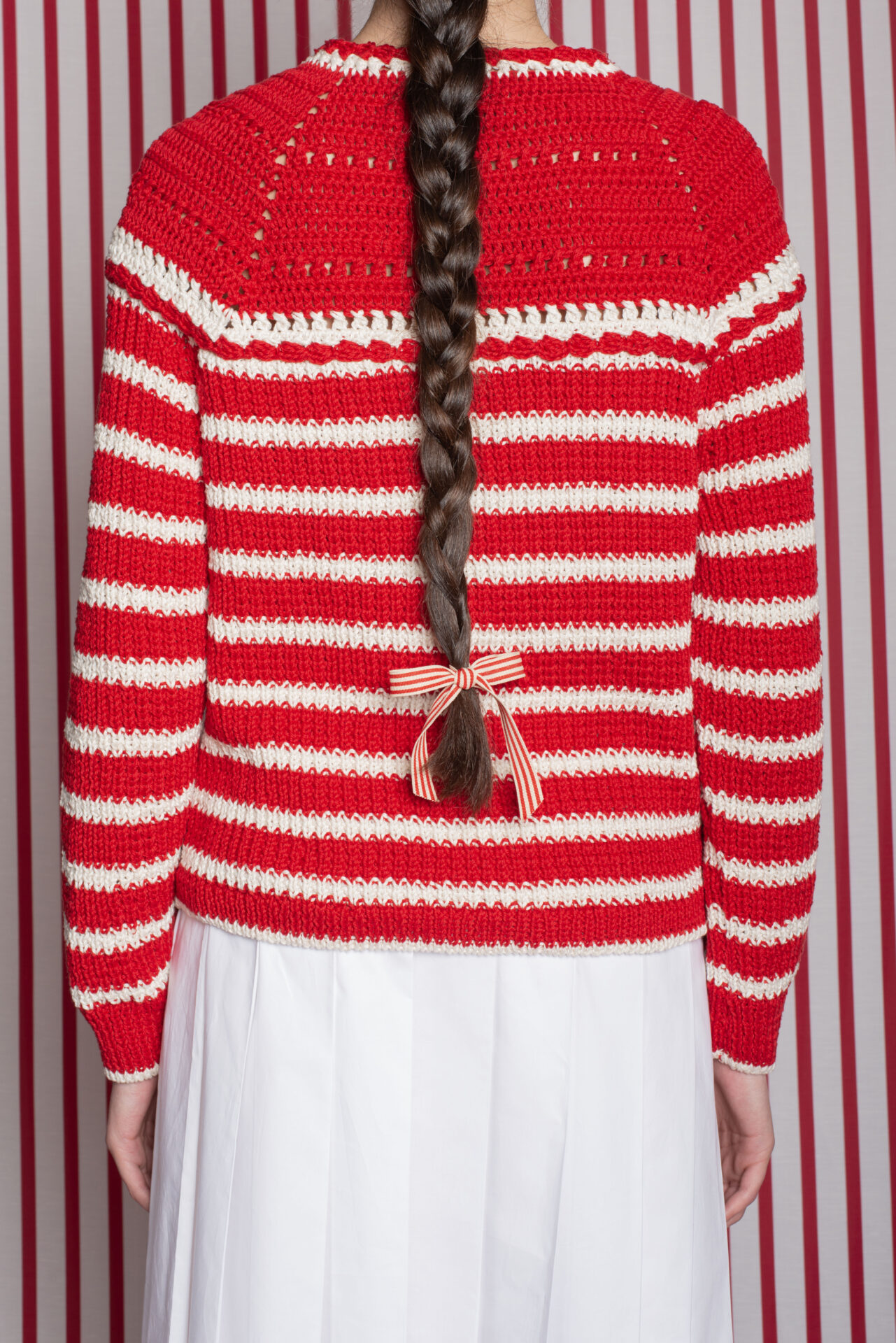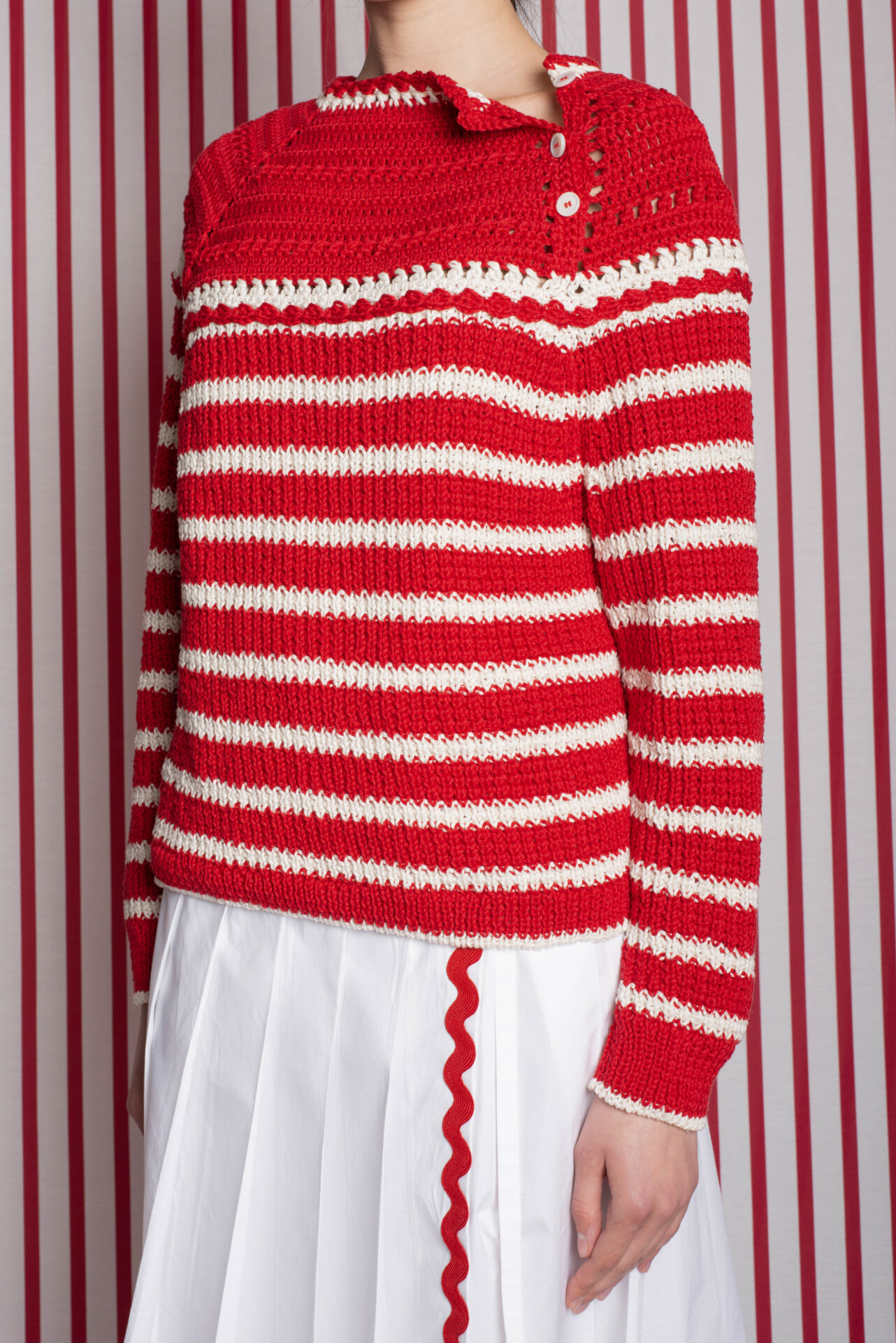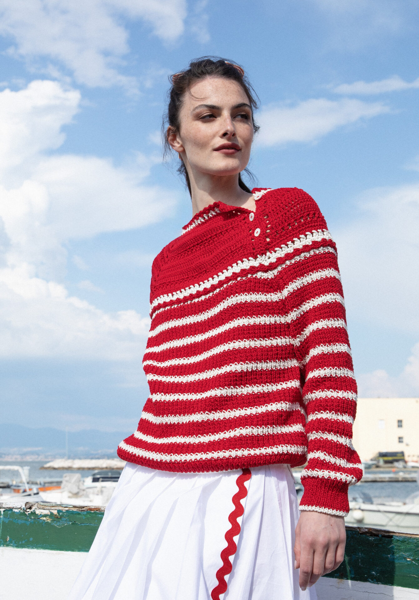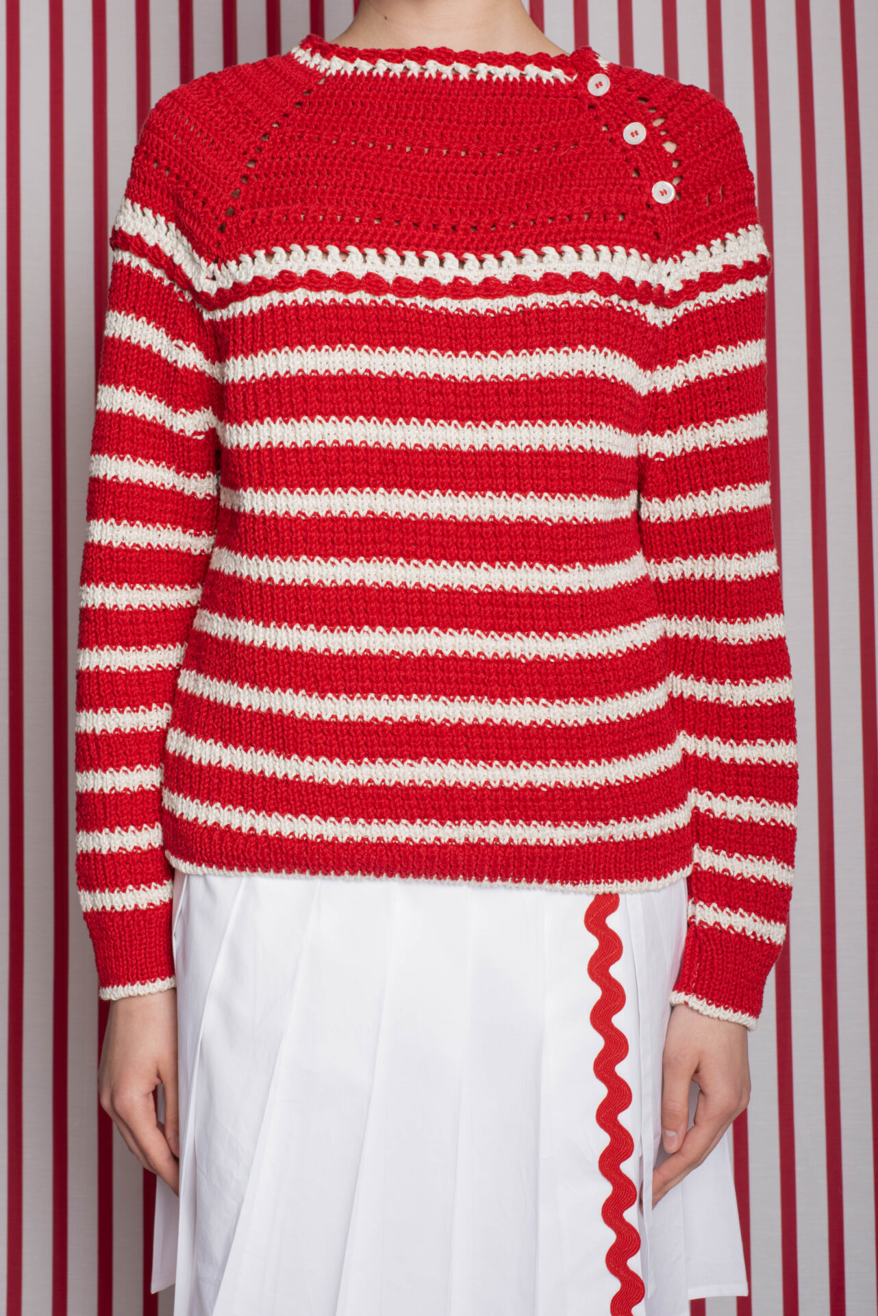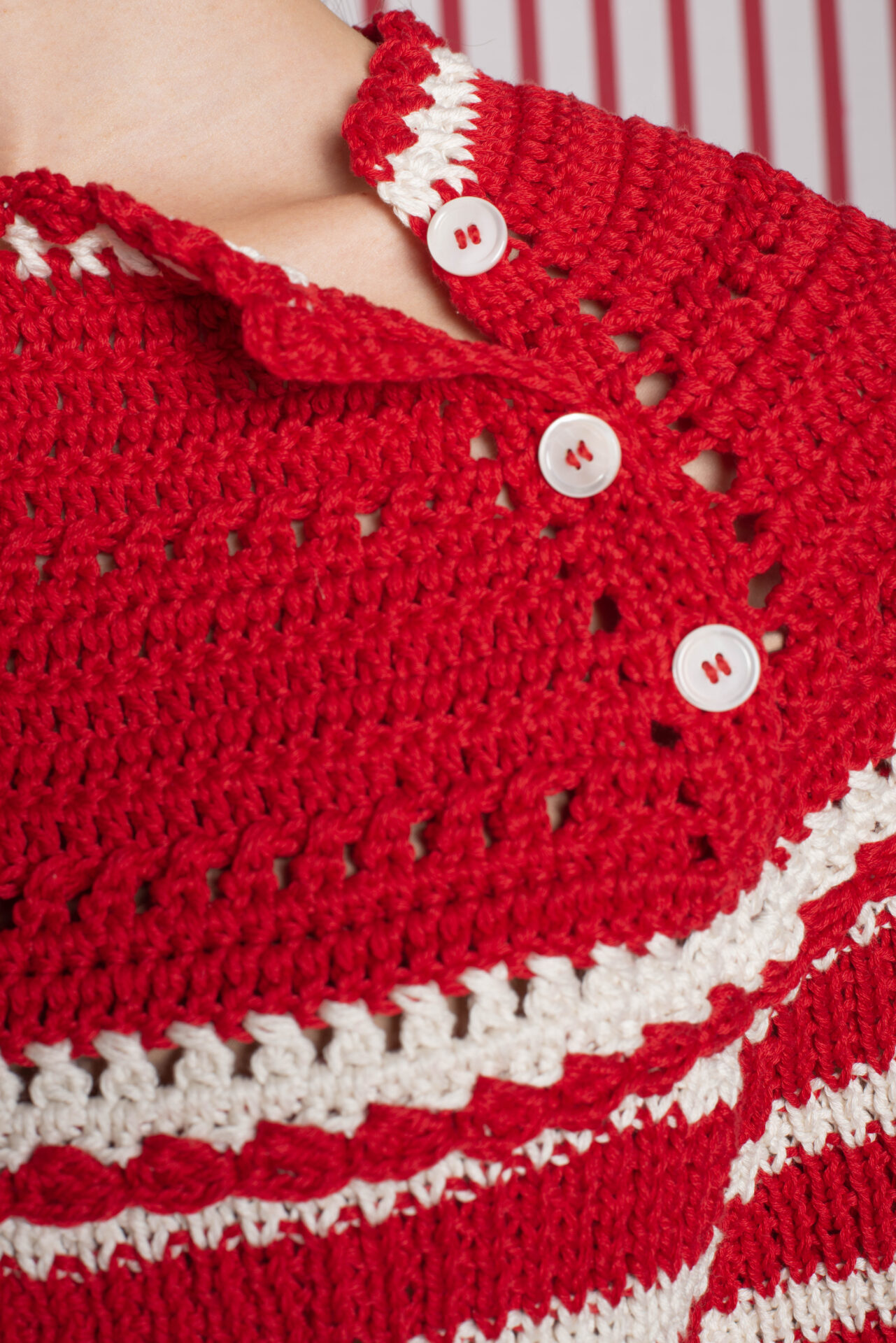 Maglione fatto a mano ai ferri con filato di cotone rosso/panna, realizzato in punto finta costa inglese a righe orizzontali; con collo alto e carré smerlato in crochet di cotone rosso con rifinitura panna, fatto a mano.