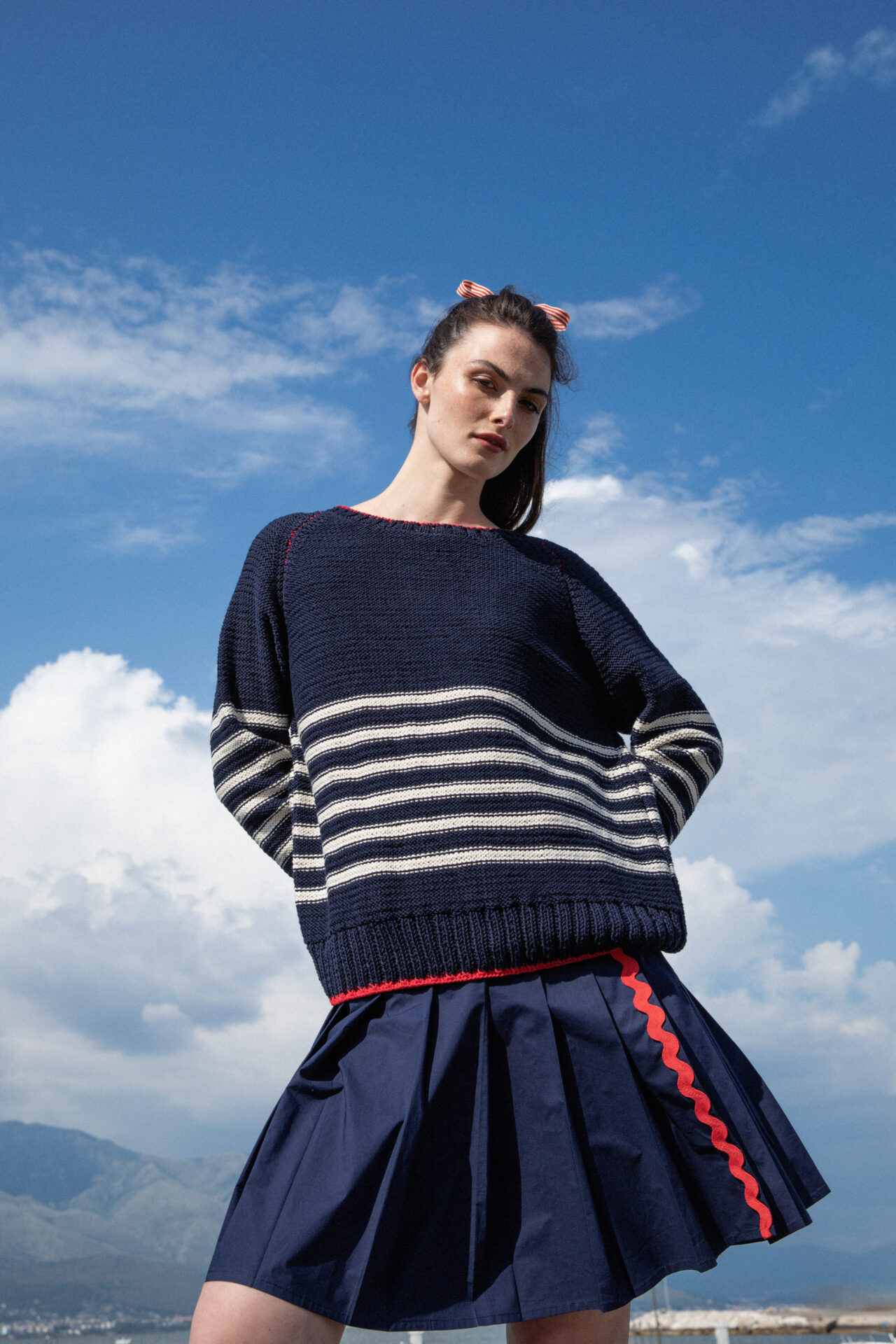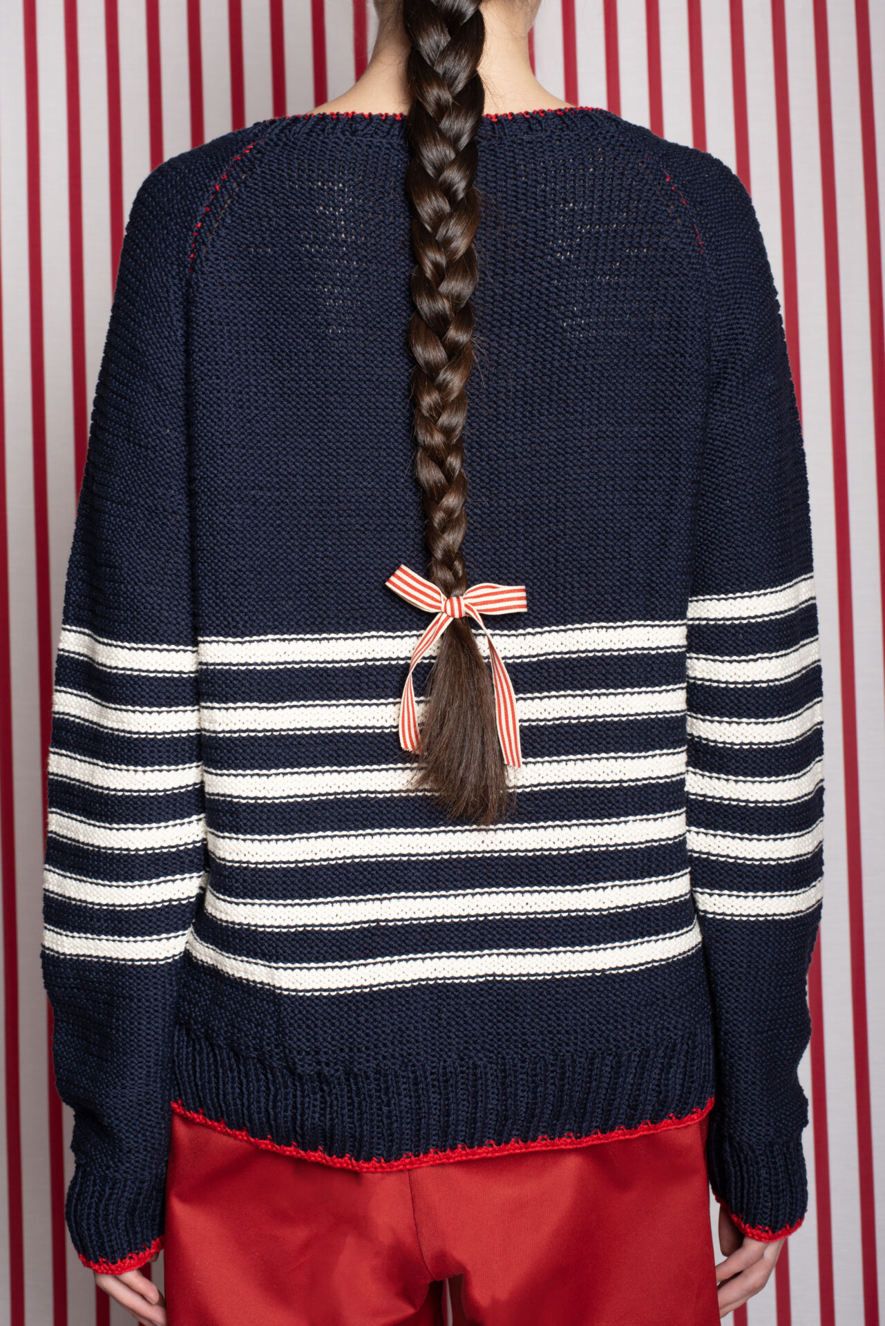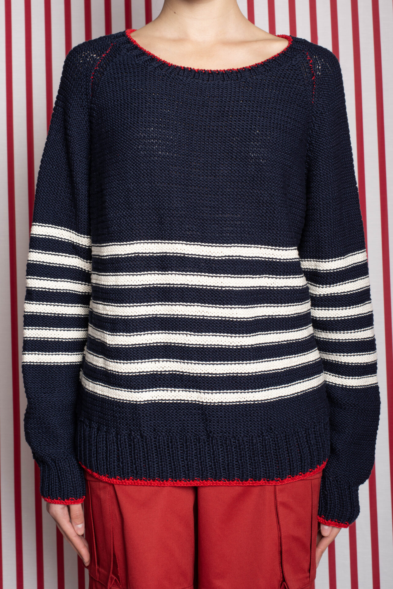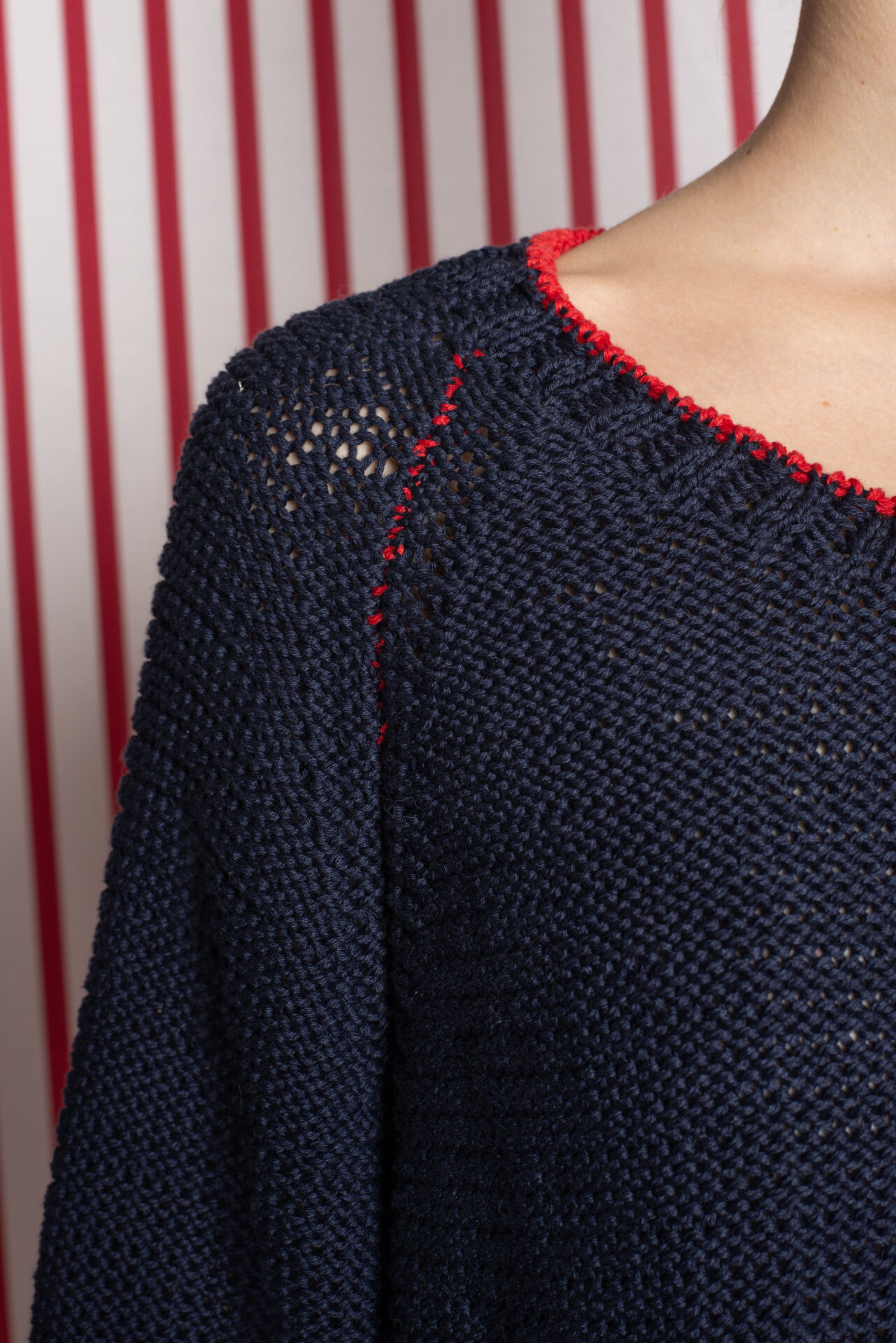 Maglione fatto a mano ai ferri con filato di cotone blu/panna, realizzato in punto rasato rovescio a righe orizzontali piazzate, con maniche raglan. Polsi e orlo a costine blu con rifinitura in rosso; collo smerlato in crochet panna con rifinitura in rosso, fatto a mano; dettaglio cuciture a vista rosse.