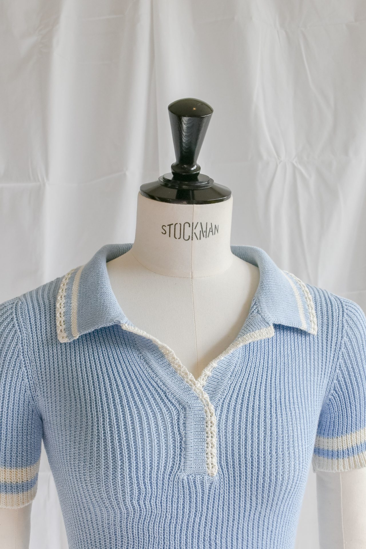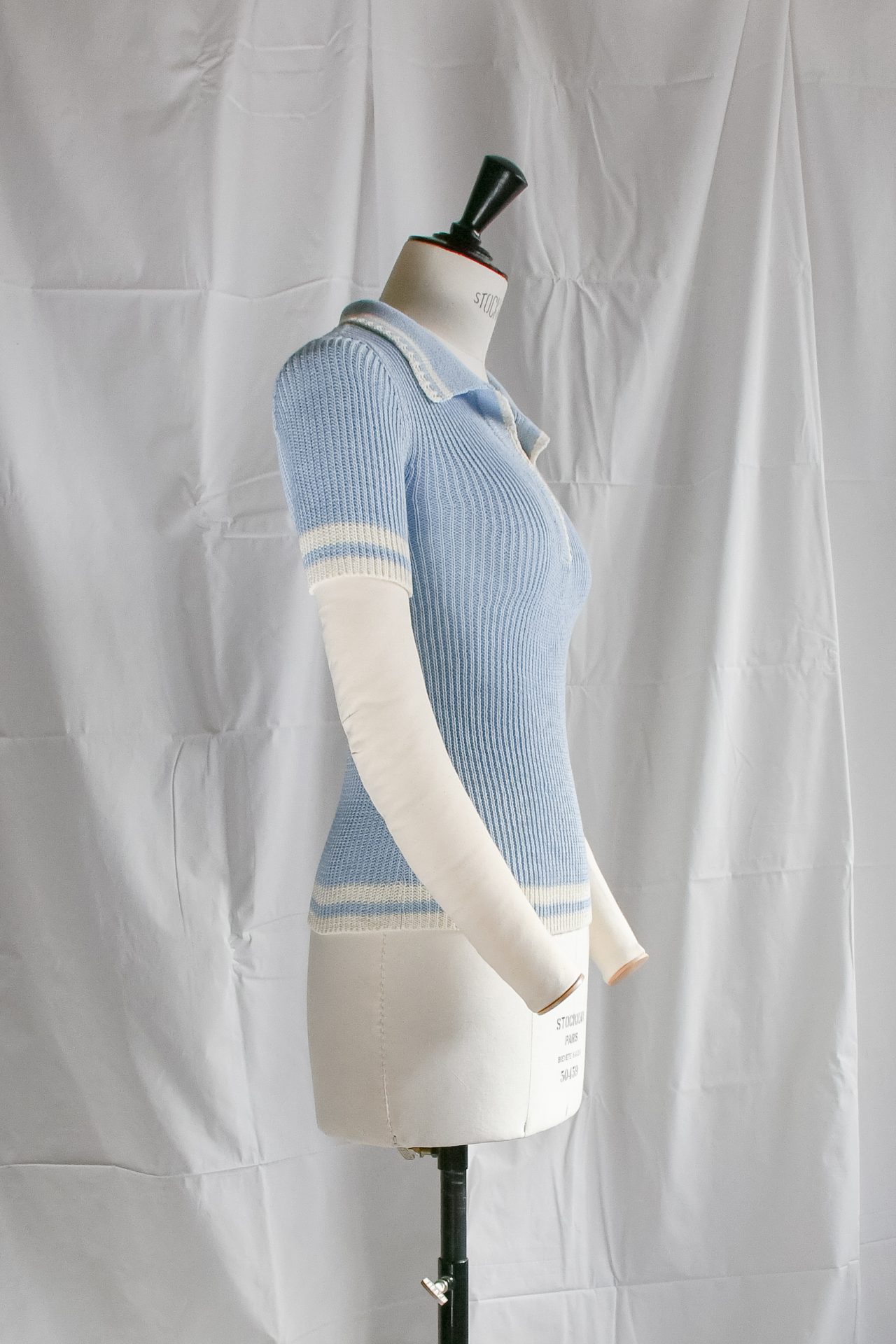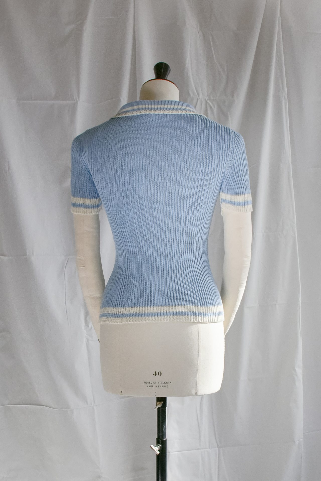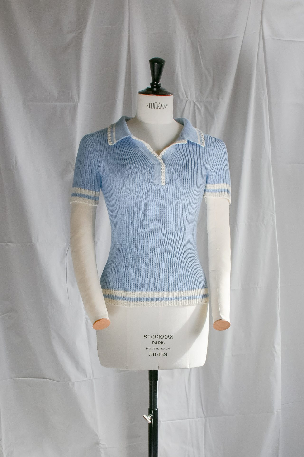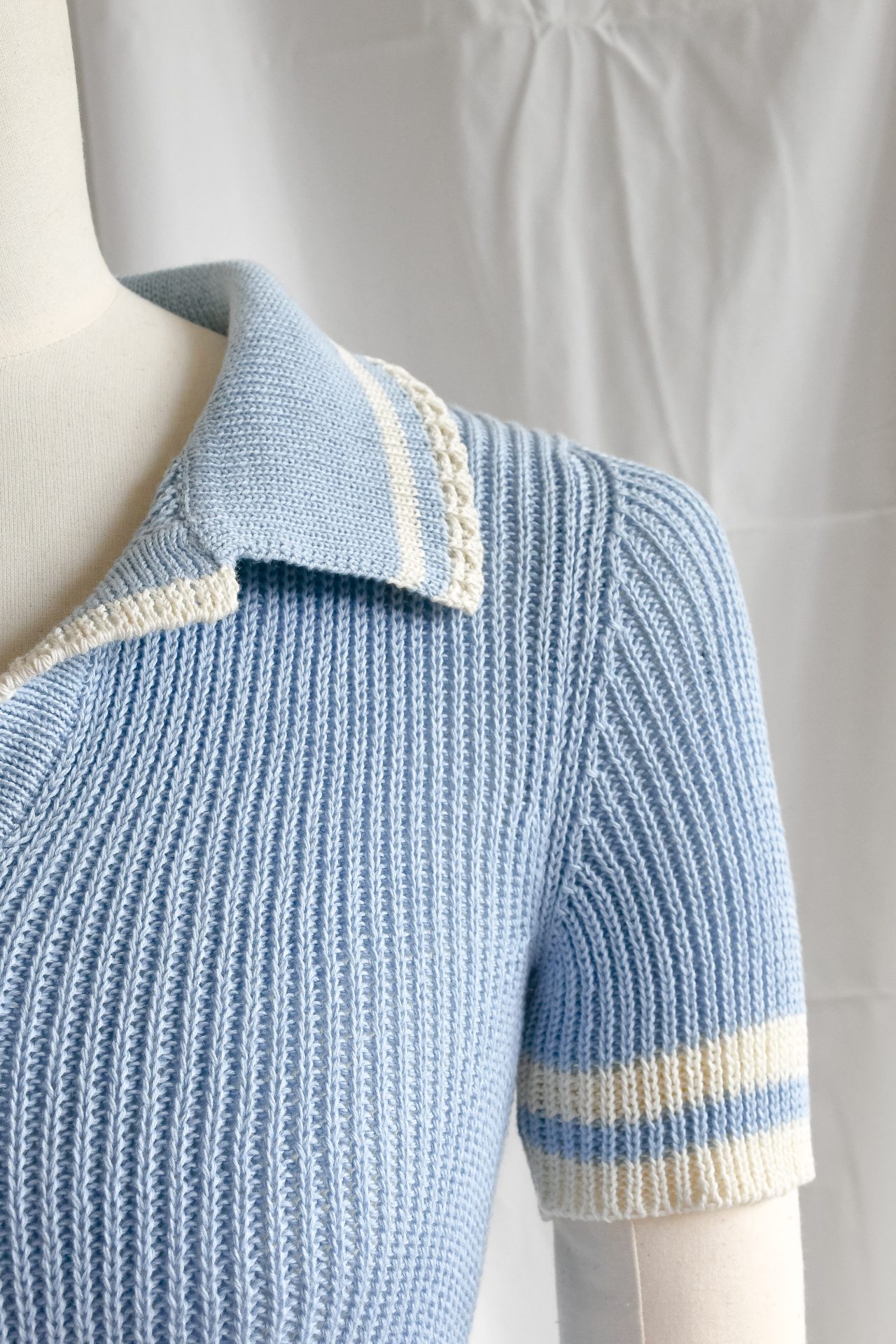 Polo a maniche corte in maglia, realizzato a macchina manuale con filato di cotone azzurro, realizzata in maglia punto costa 1/1. Cannoncino e collo polo in maglia unita con bordo ajour smacchinato panna e riga panna. Maniche e orlo rifinite con doppia riga piazzata panna.
