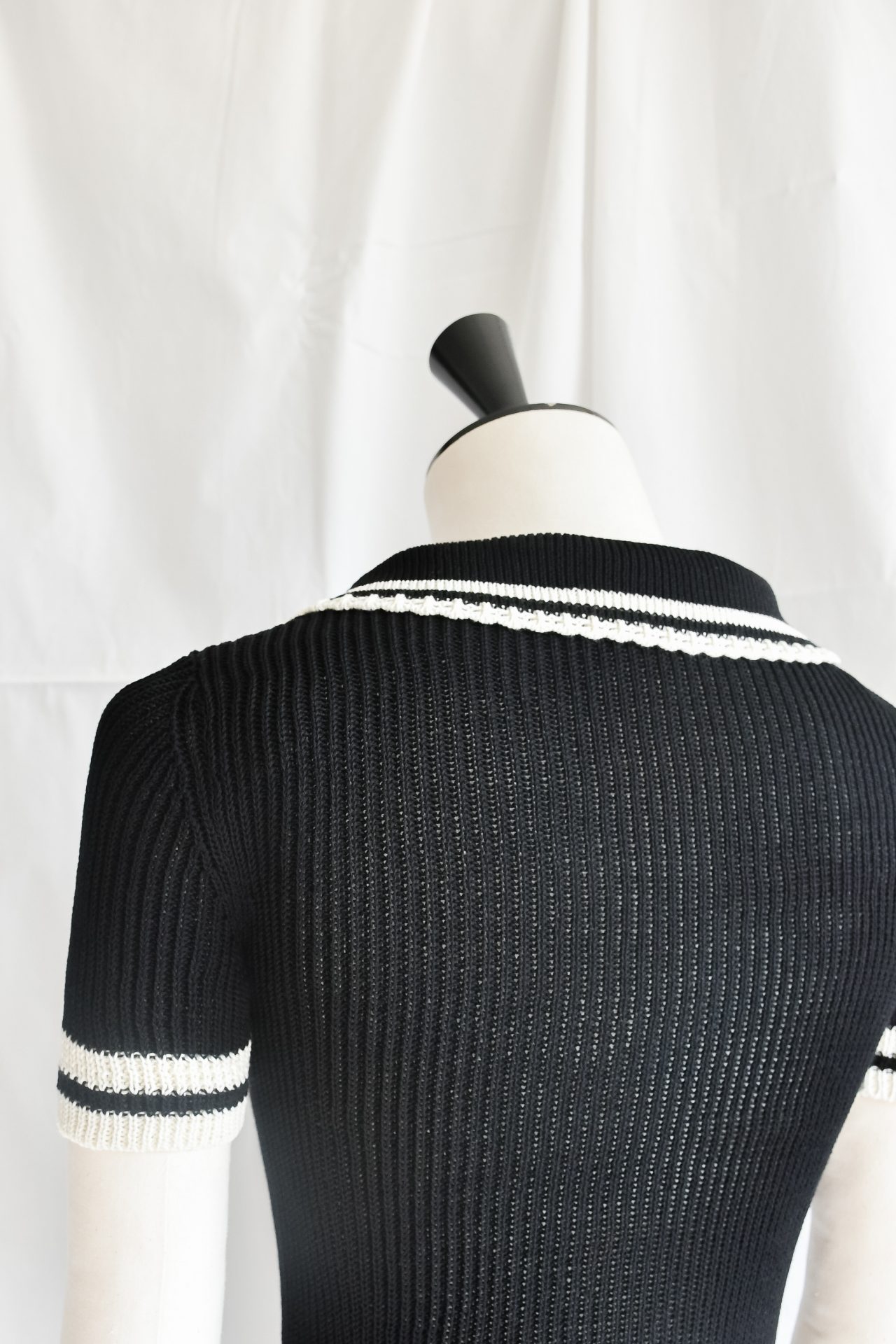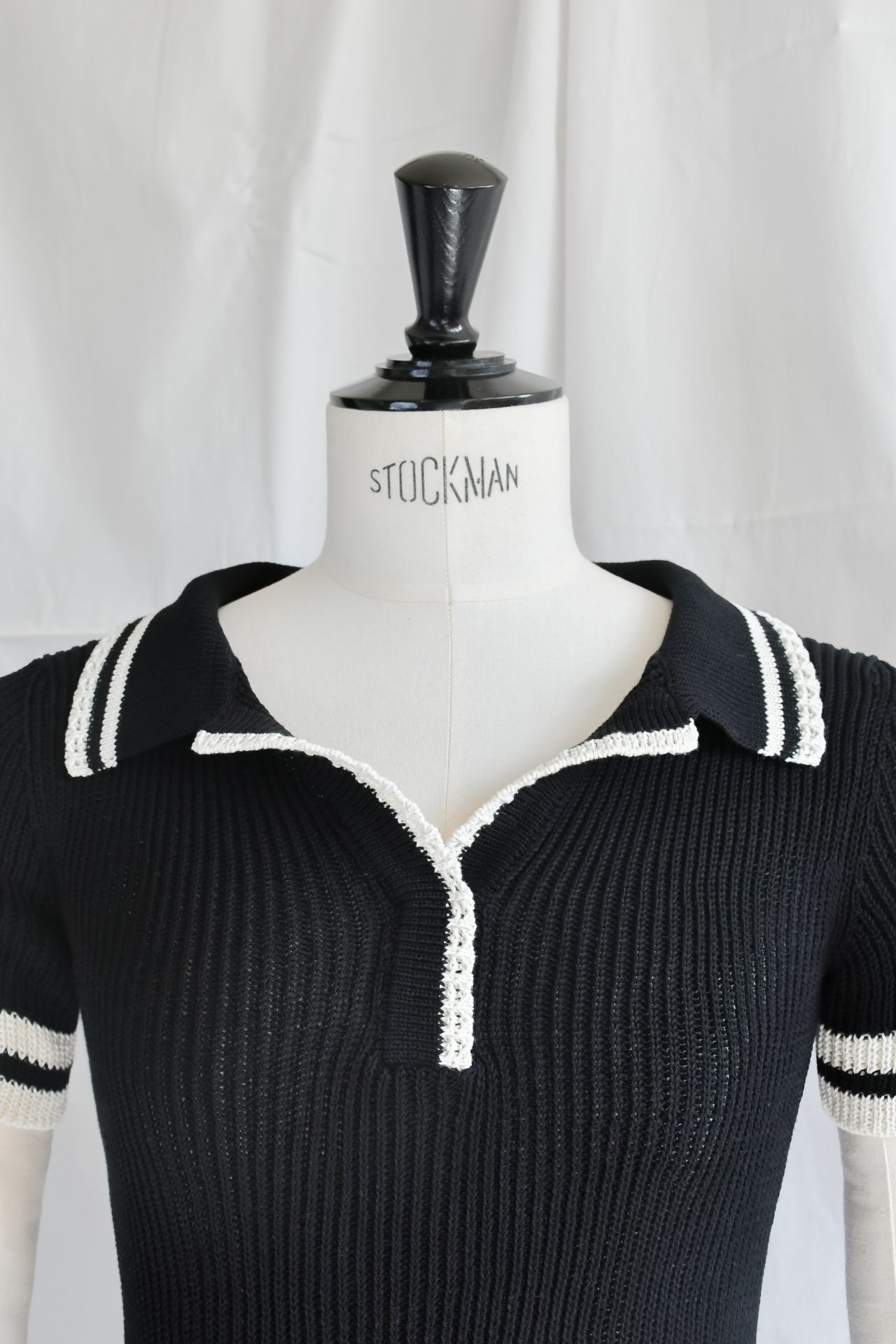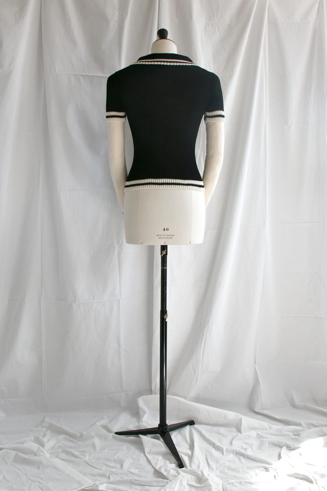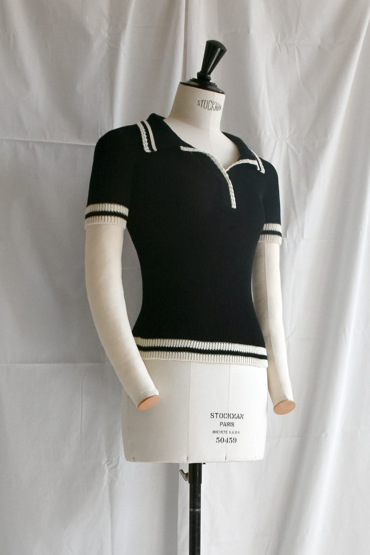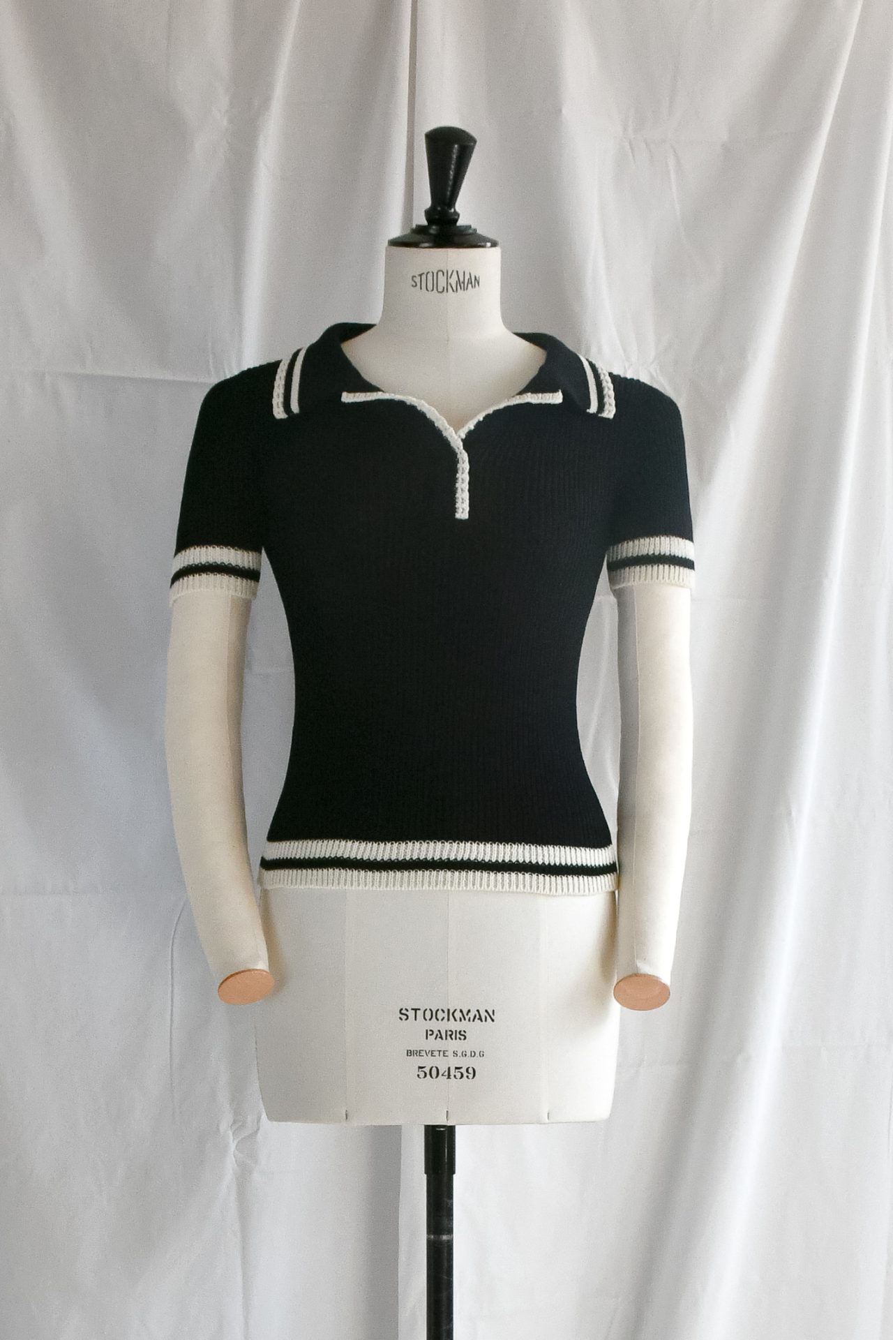 Polo a maniche corte in maglia, realizzato a macchina manuale con filato di cotone nero, realizzata in maglia punto costa 1/1. Cannoncino e collo polo in maglia unita con bordo ajour smacchinato panna e riga panna. Maniche e orlo rifinite con doppia riga piazzata panna.