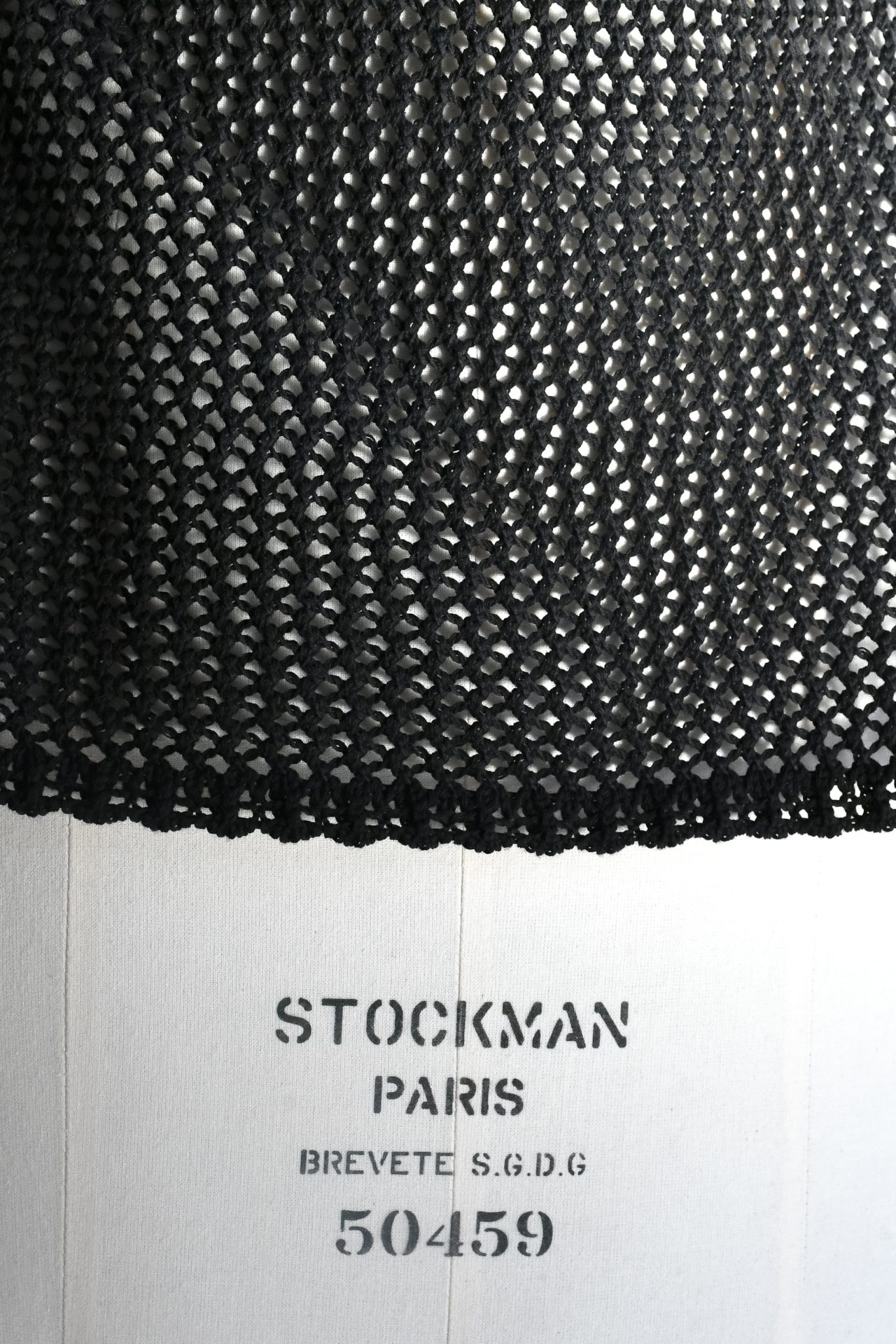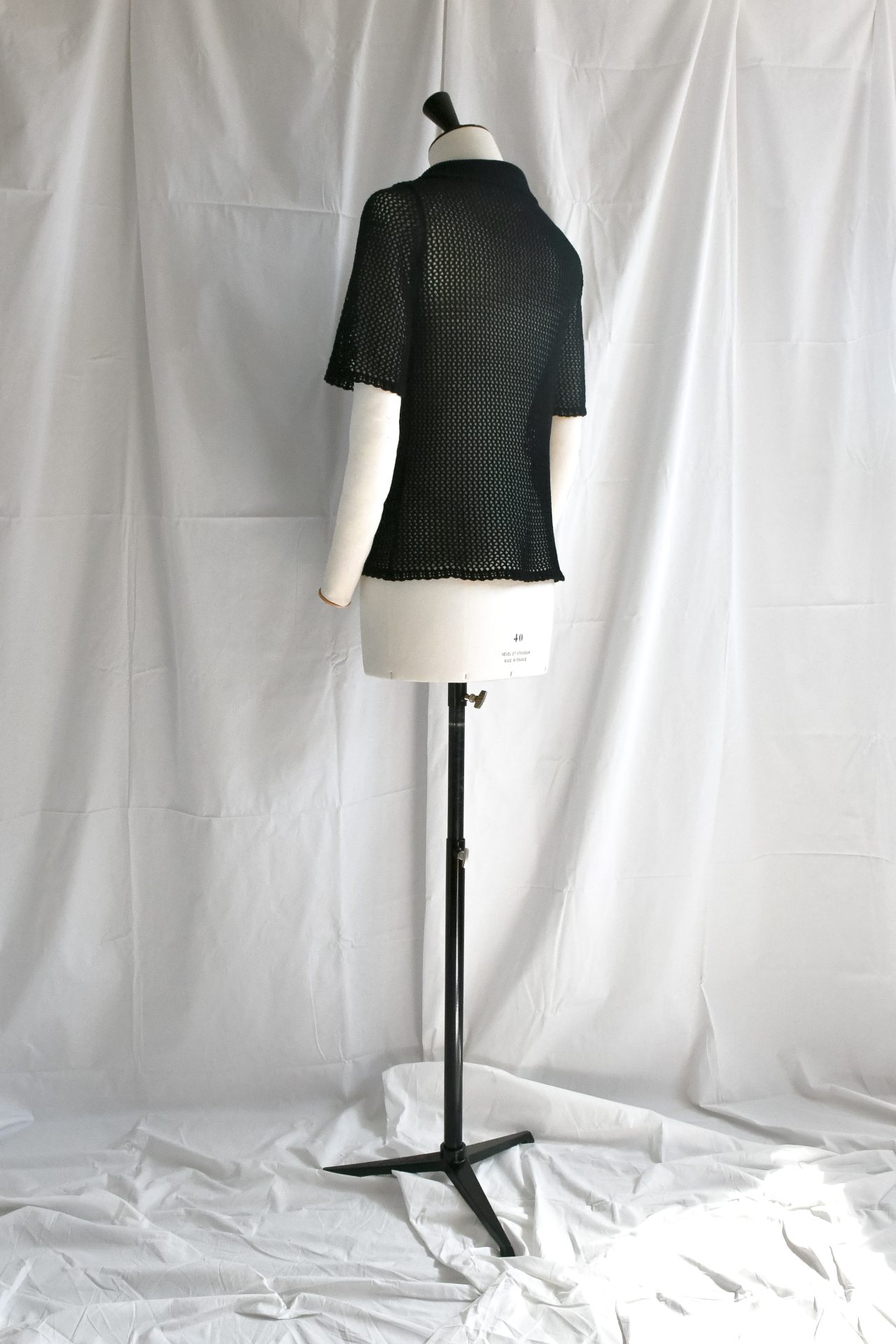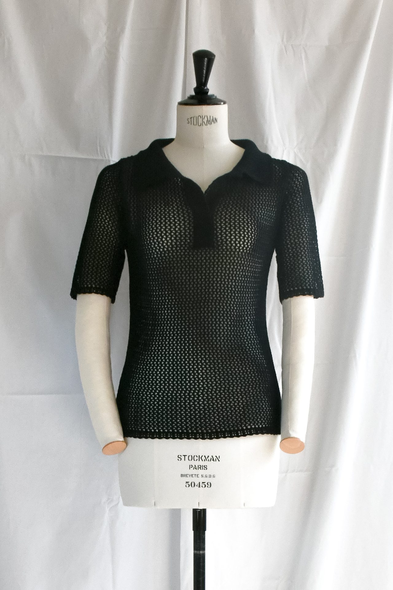 Polo a maniche corte in maglia a rete, realizzata a macchina manuale con filato di cotone nero. Cannoncino e collo polo in maglia unita di cotone nero.