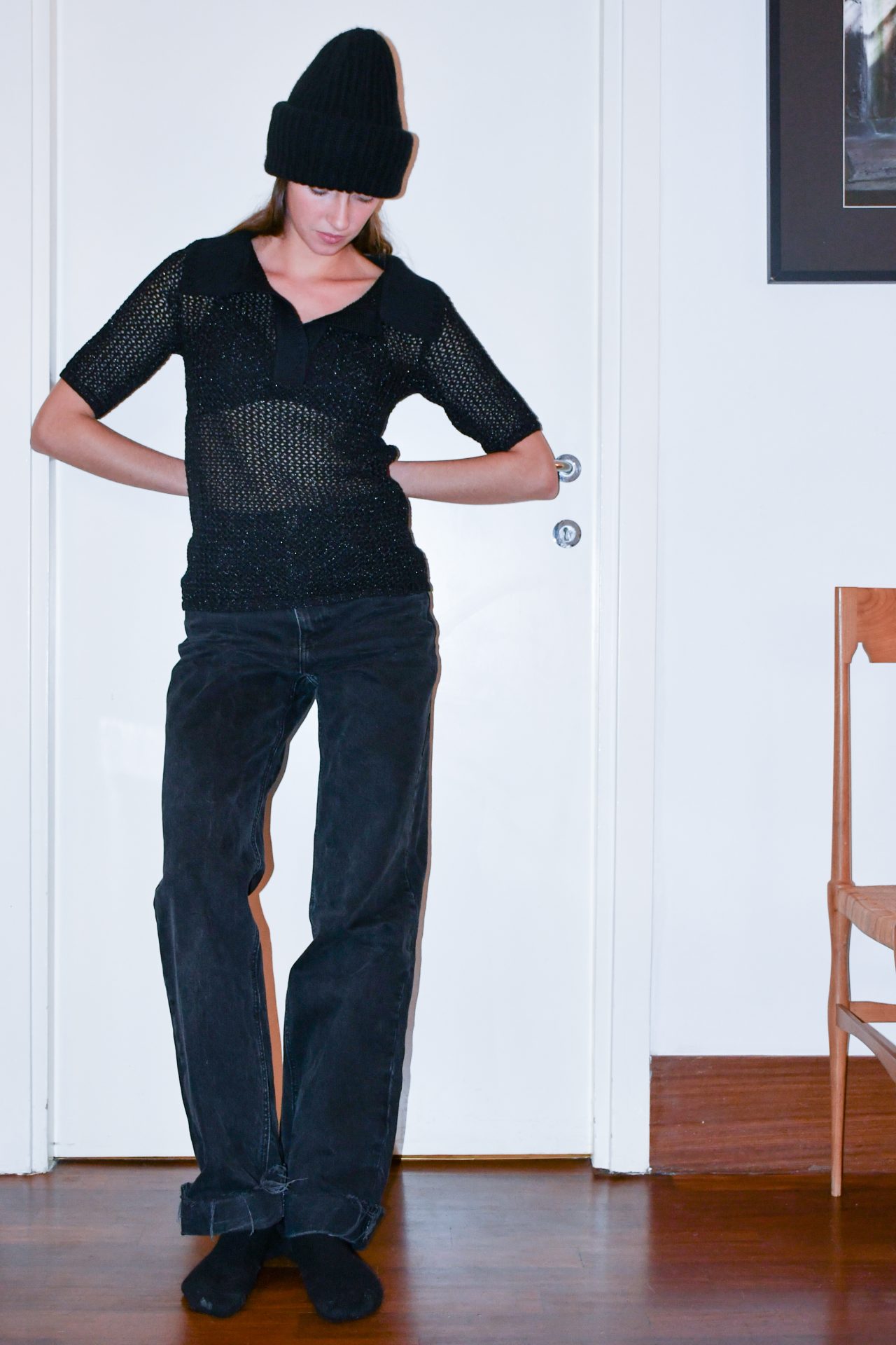 lurex nero realizzato a rete con lavorazione vanisé (lana interno, lurex esterno). Cannoncino e collo