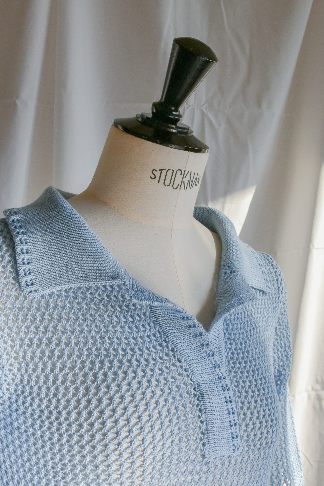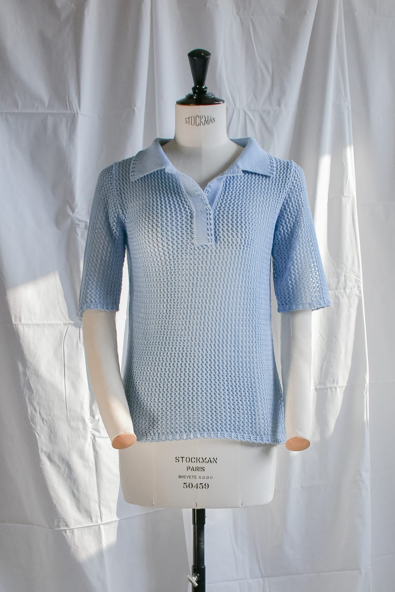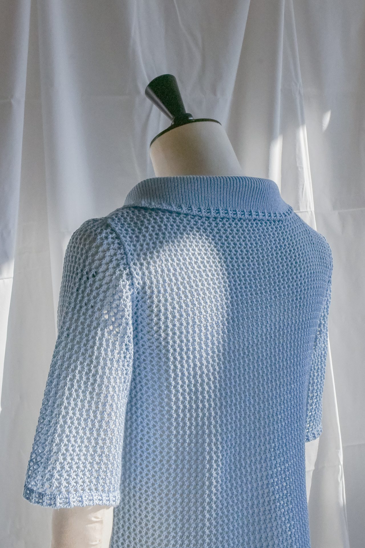 Polo a maniche corte in maglia a rete, realizzata a macchina manuale con filato di cotone azzurro. Cannoncino e collo polo in maglia unita di cotone azzurro.