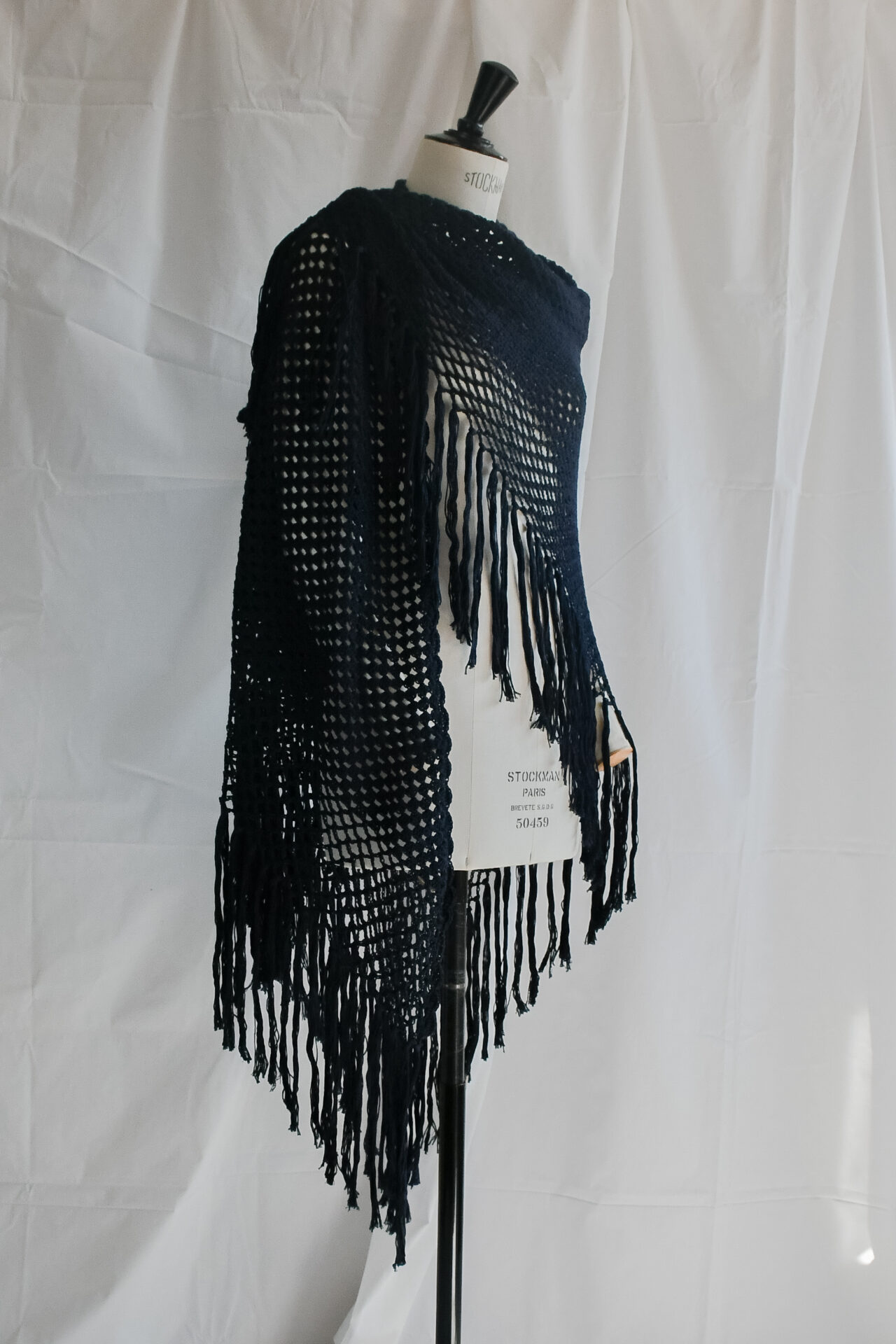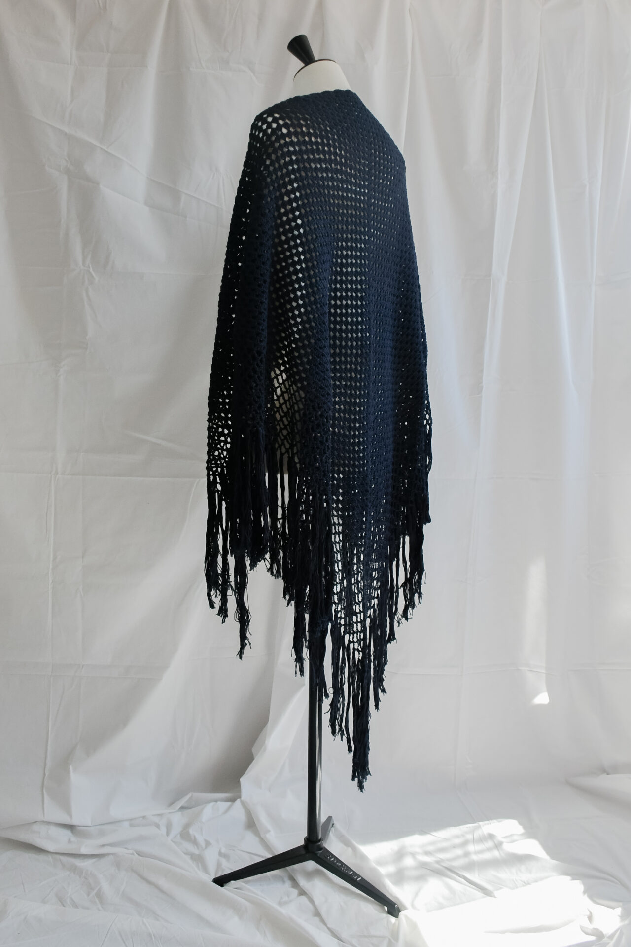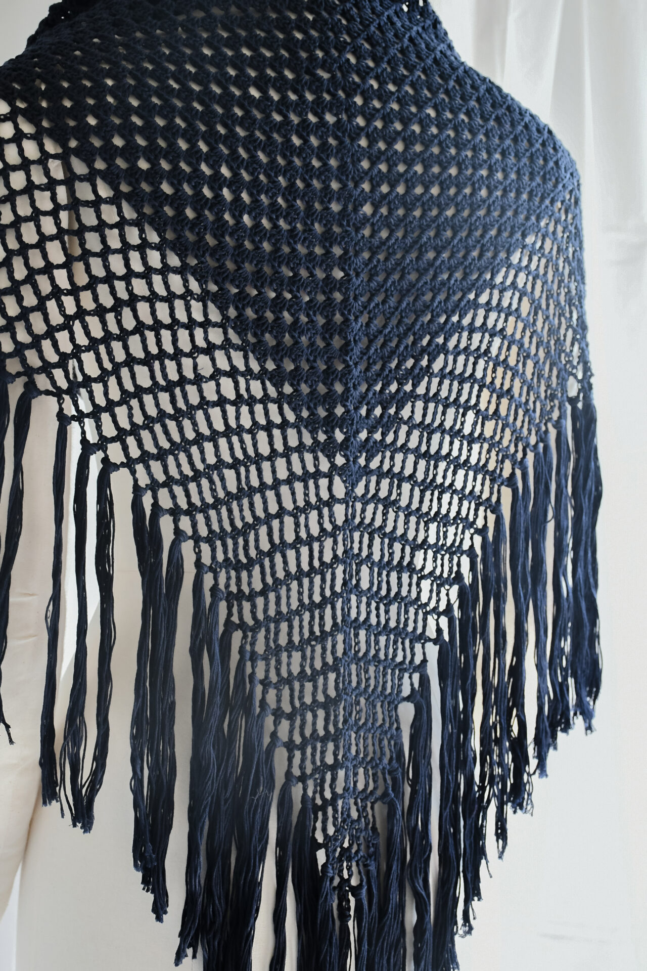 Scialle a triangolo fatto a mano in crochet con filato di cotone blu, realizzato in punto rete, con frange annodate a mano.