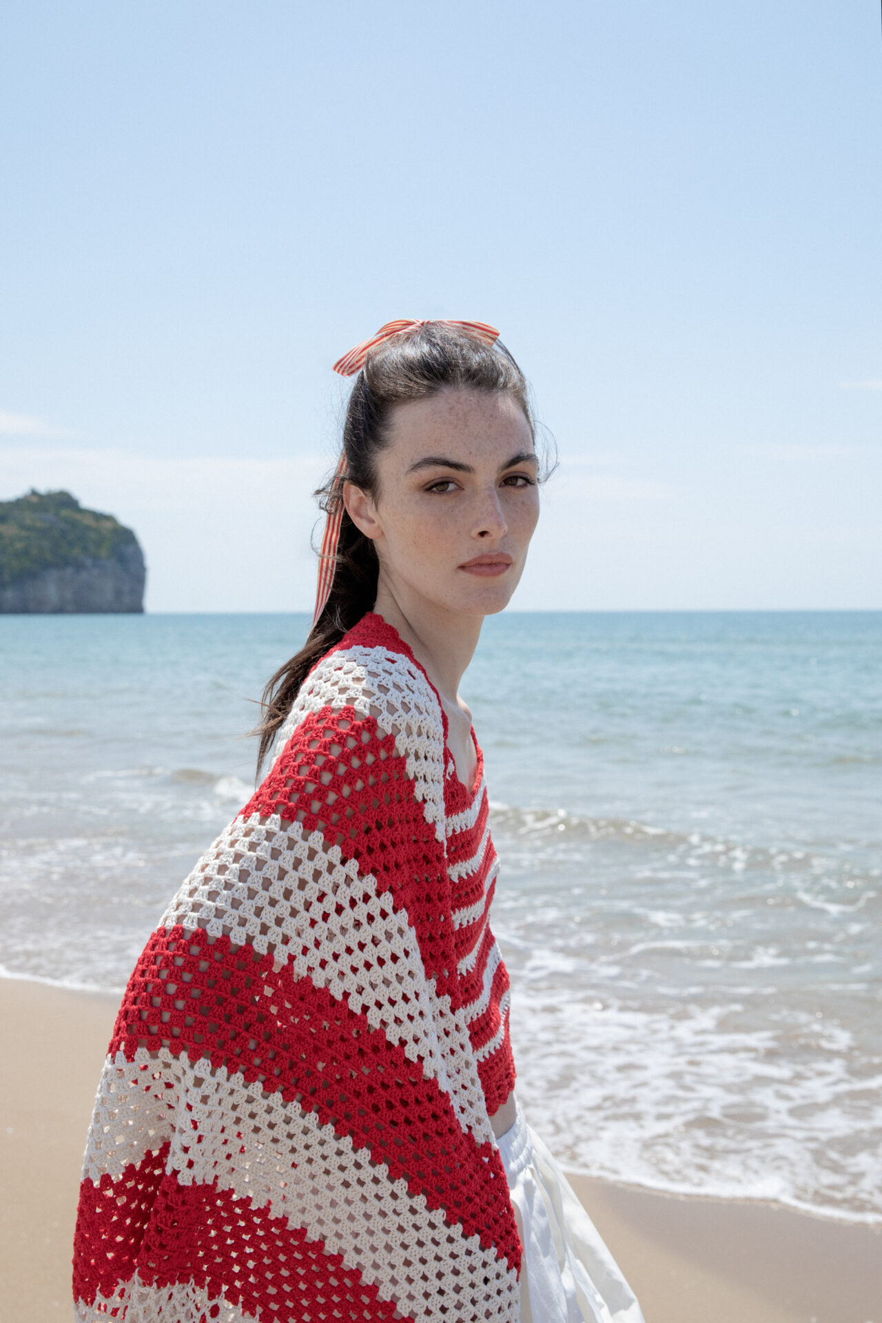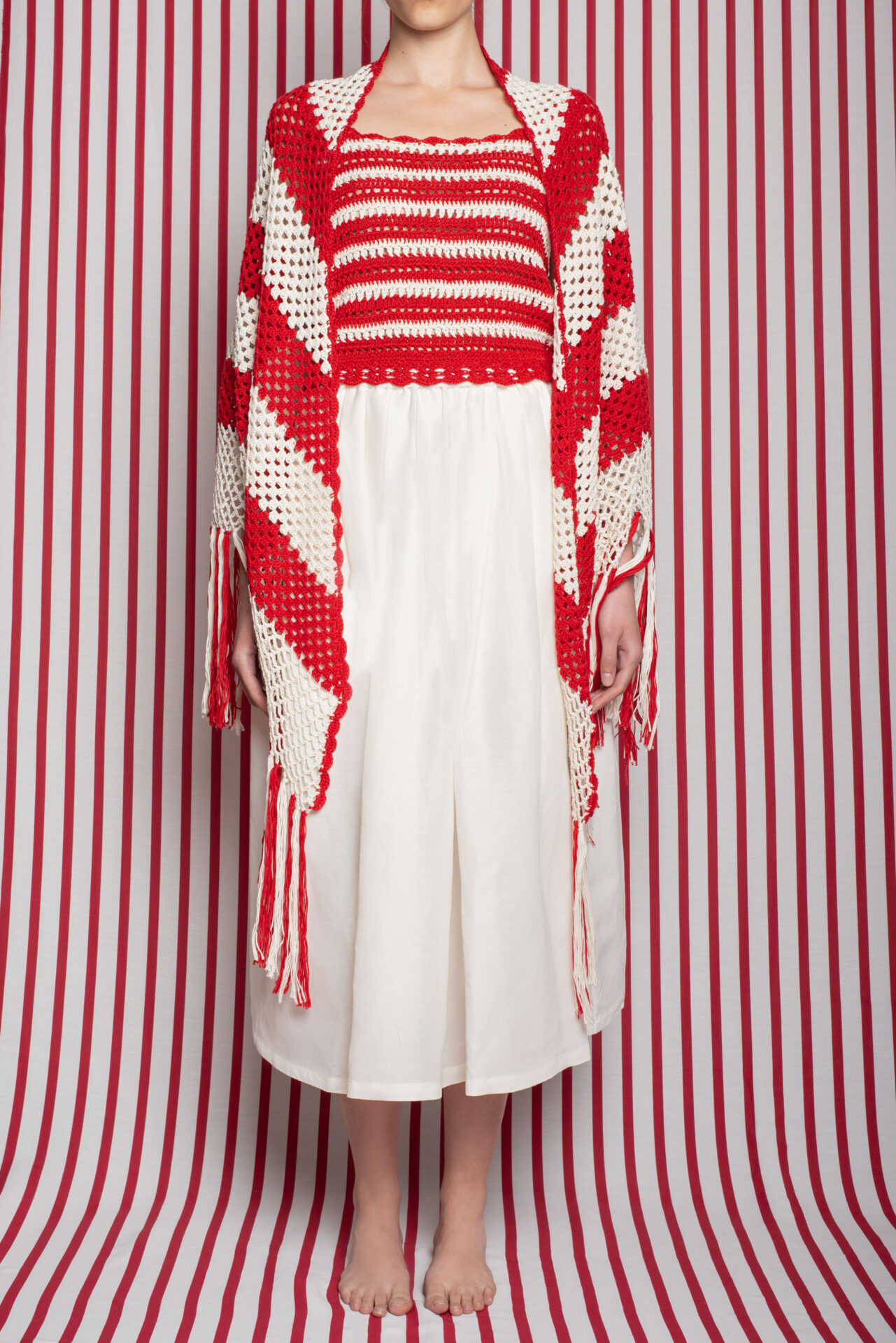 Scialle a triangolo fatto a mano in crochet con filato di cotone rosso/panna, a righe orizzontali realizzate in punto rete, con frange annodate a mano.