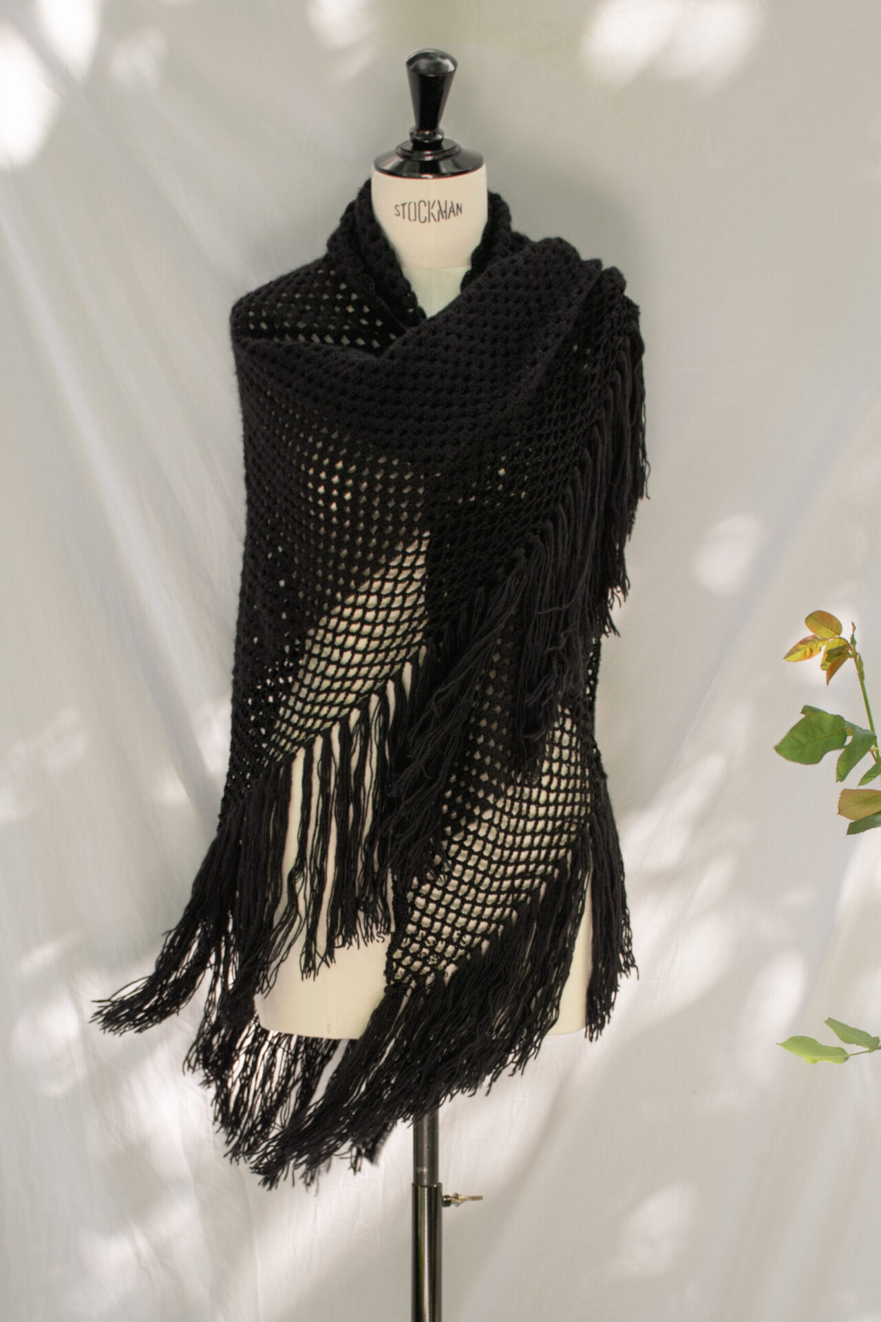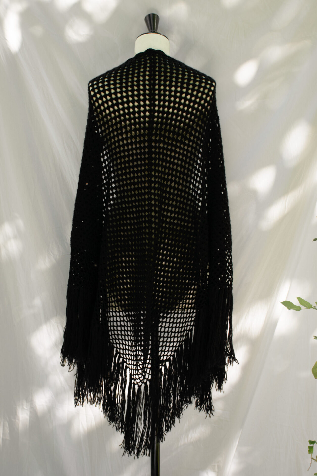Scialle a triangolo fatto a mano in crochet con filato di lana merino, mohair e seta nero, realizzato in punto rete, con frange annodate a mano.