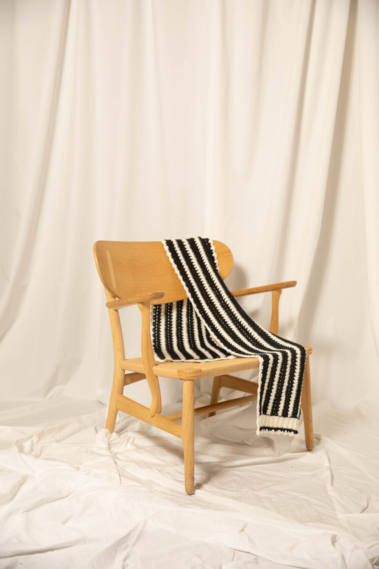 Sciarpa fatta a mano in crochet con filato di lana merino nero/panna, a “righe Gaeta” verticali.
