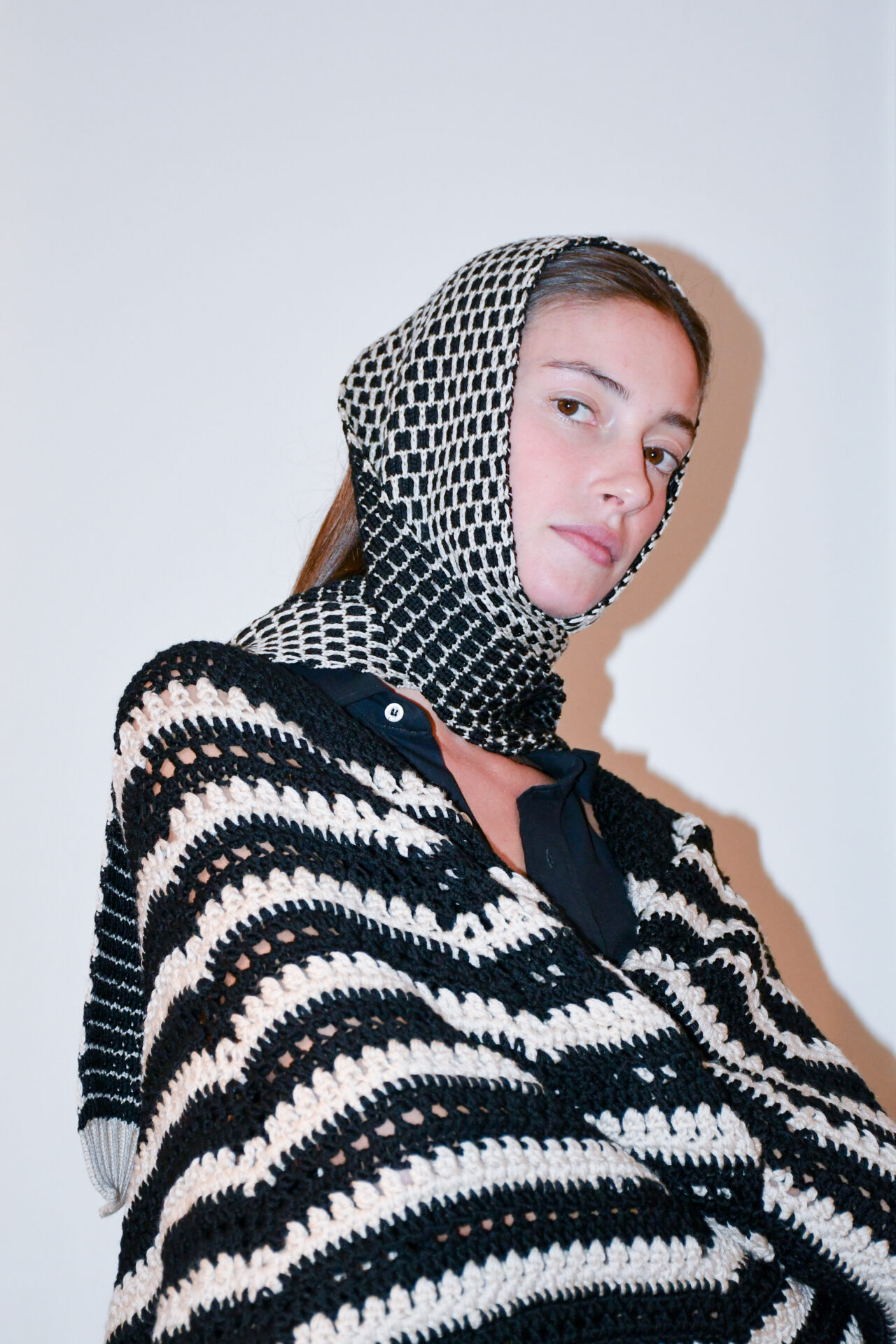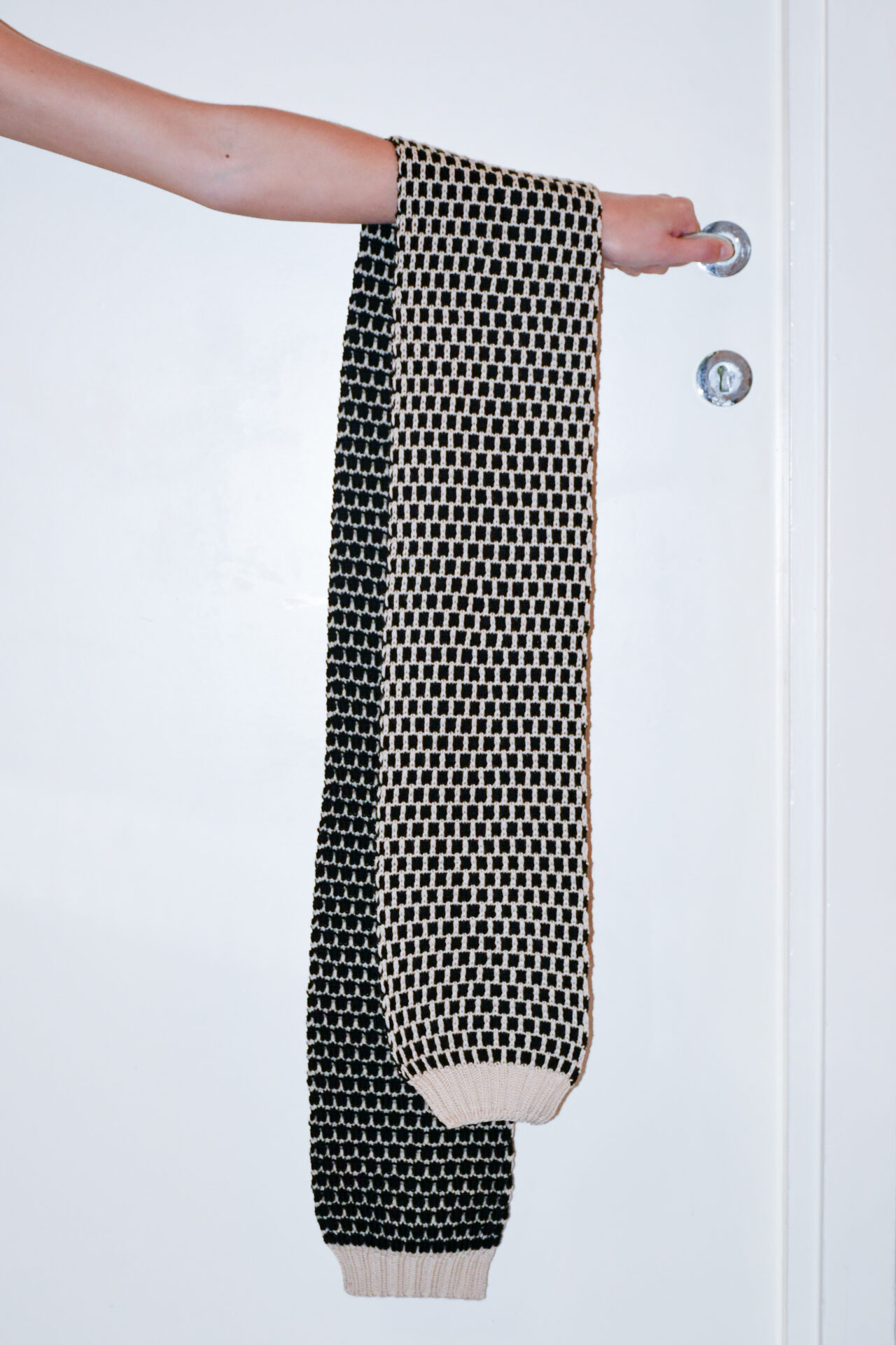 Sciarpa a scacchiera double face realizzata a macchina manuale con filato di lana merino naturale e nero. Estremità a costine in filato lana merino naturale.