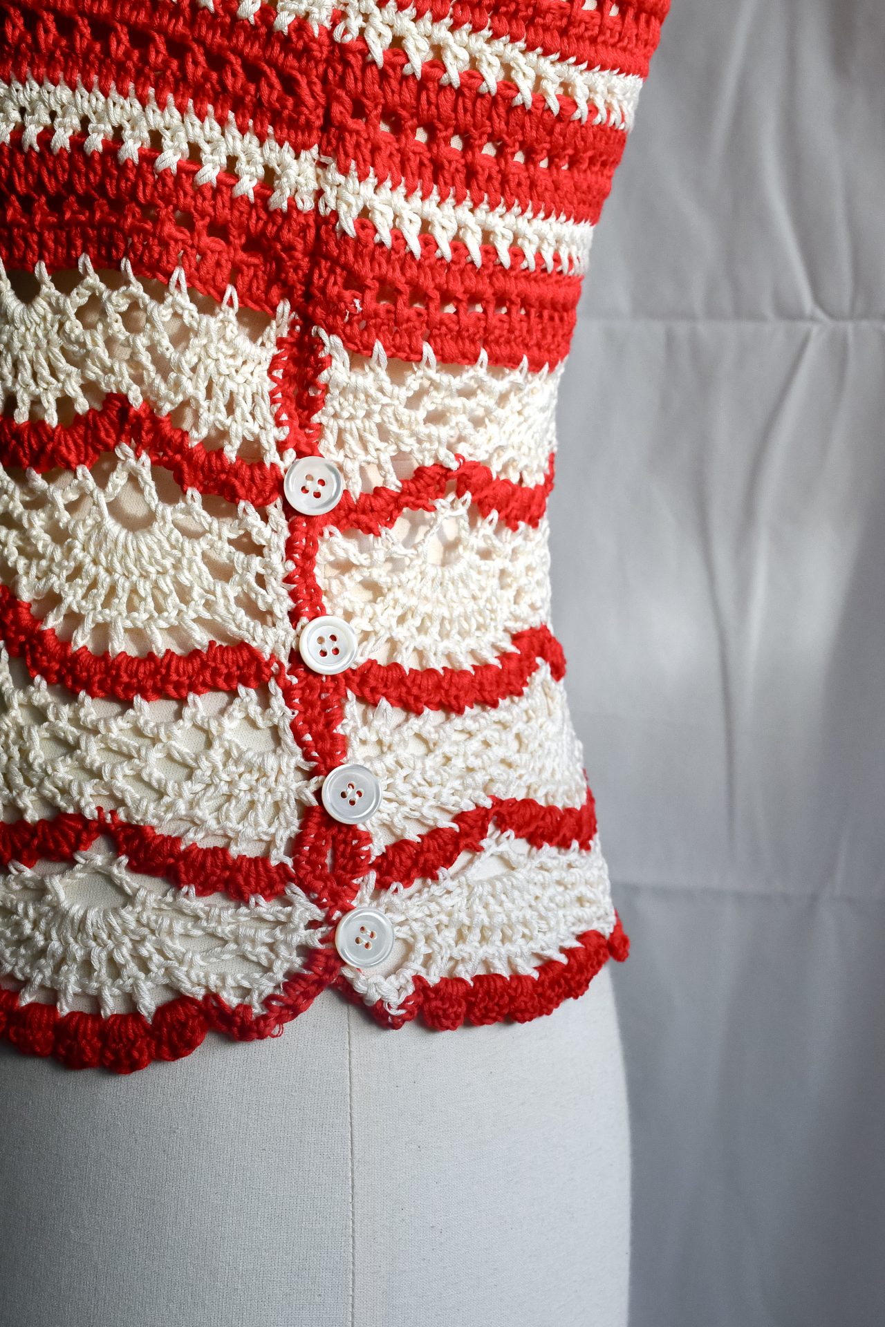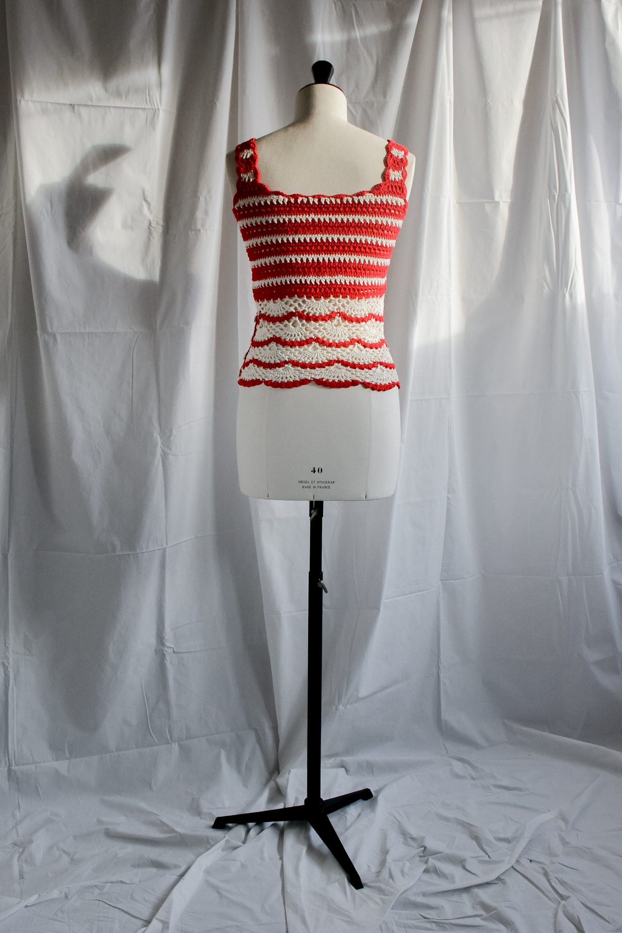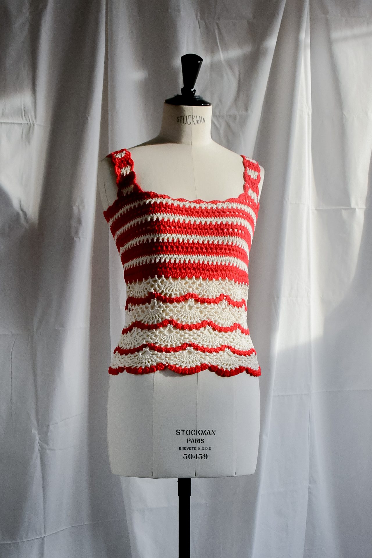 Top fatto a mano in crochet con filato di cotone rosso e panna, parte superiore bicolore con lavorazione a “righe Gaeta” orizzontali, parte inferiore realizzata in punto pizzo con profilo ad archi a contrasto. Scollo rifinito con archetti all’uncinetto. Chiusura sul fianco sinistro con bottoni in madreperla naturale.