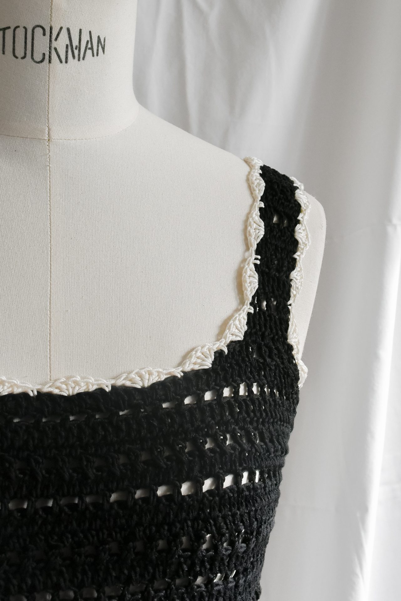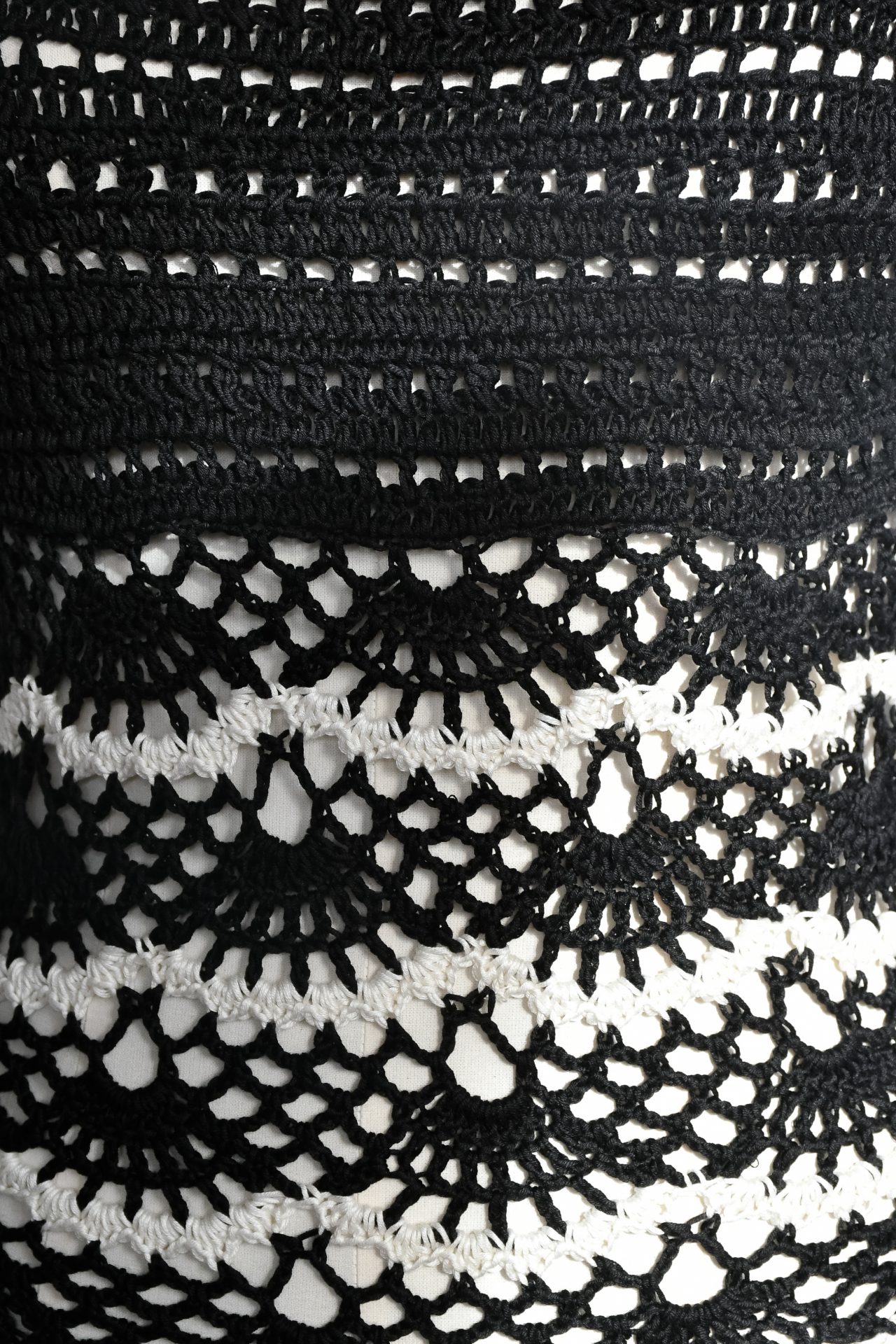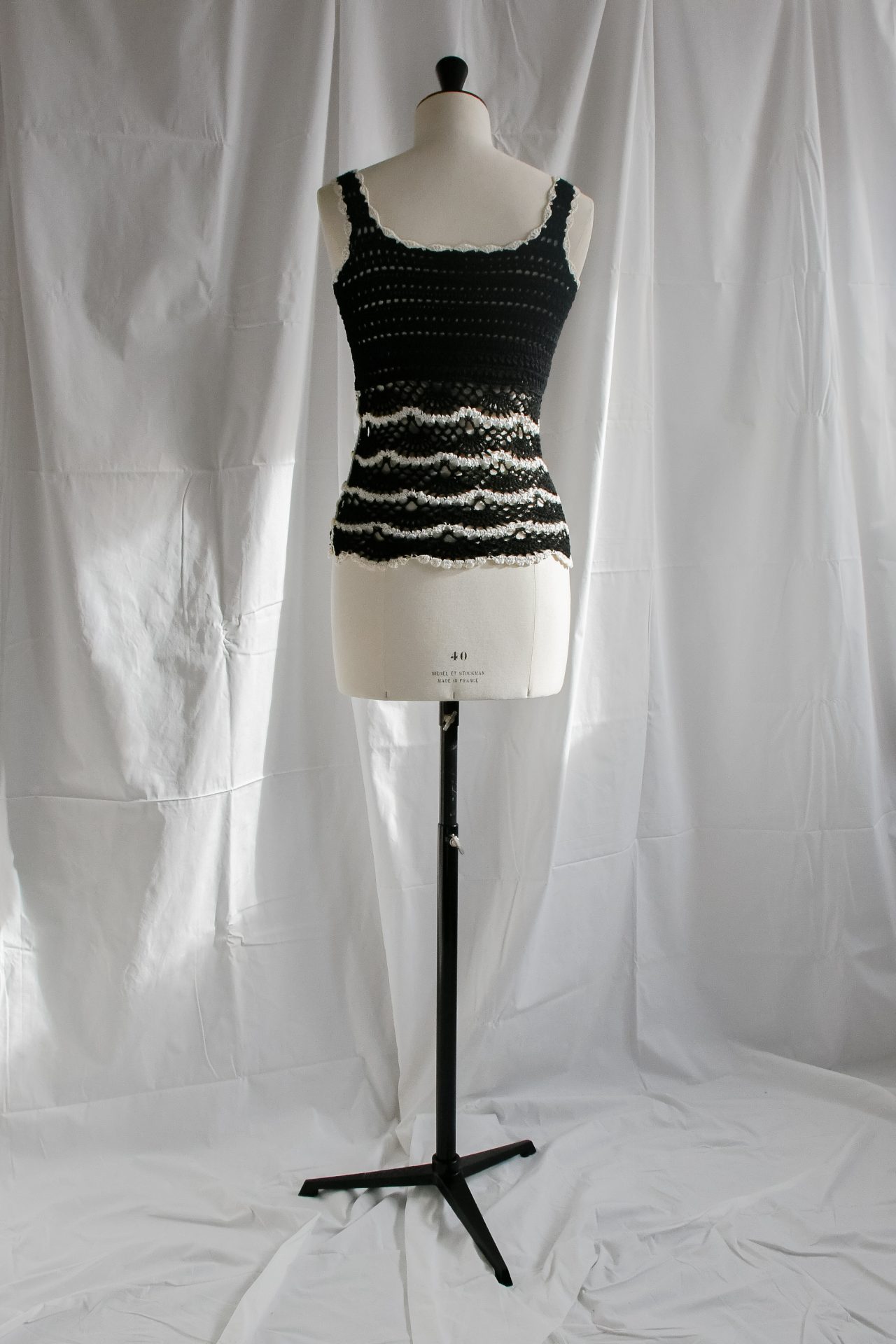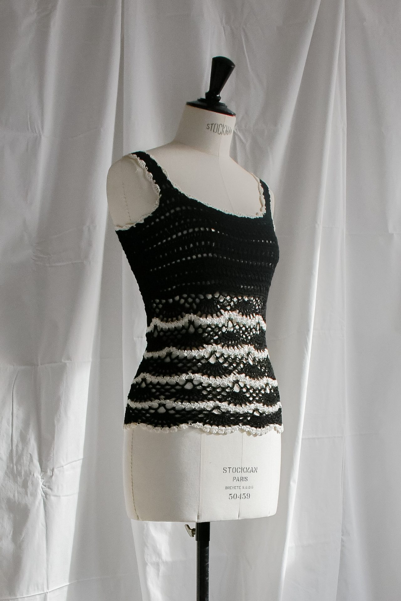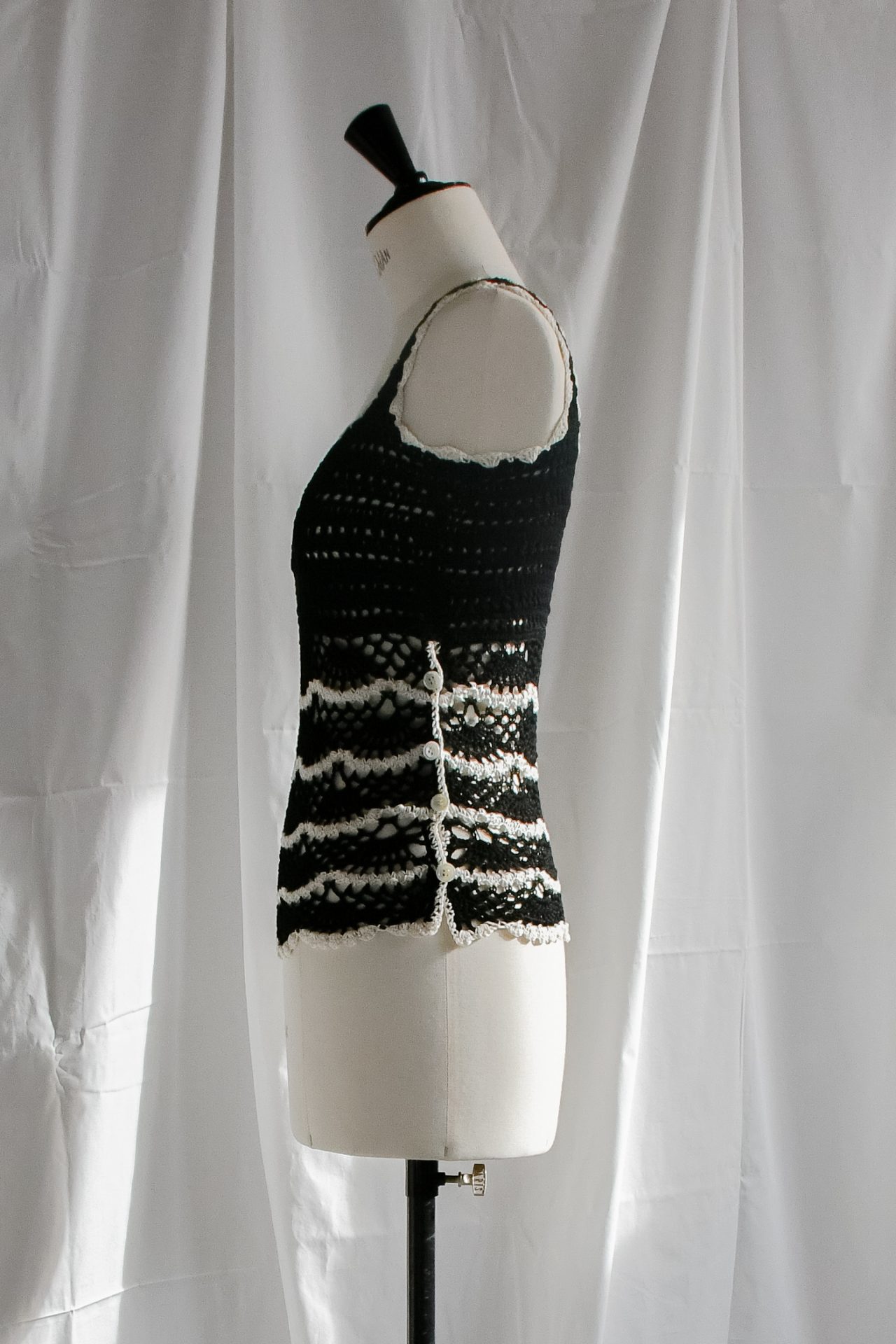 Top fatto a mano in crochet con filato di cotone nero e panna, parte superiore con lavorazione a “righe Gaeta” orizzontali, parte inferiore realizzata in punto pizzo con profilo ad archi a contrasto. Scollo rifinito con archetti all’uncinetto. Chiusura sul fianco sinistro con bottoni in madreperla naturale.