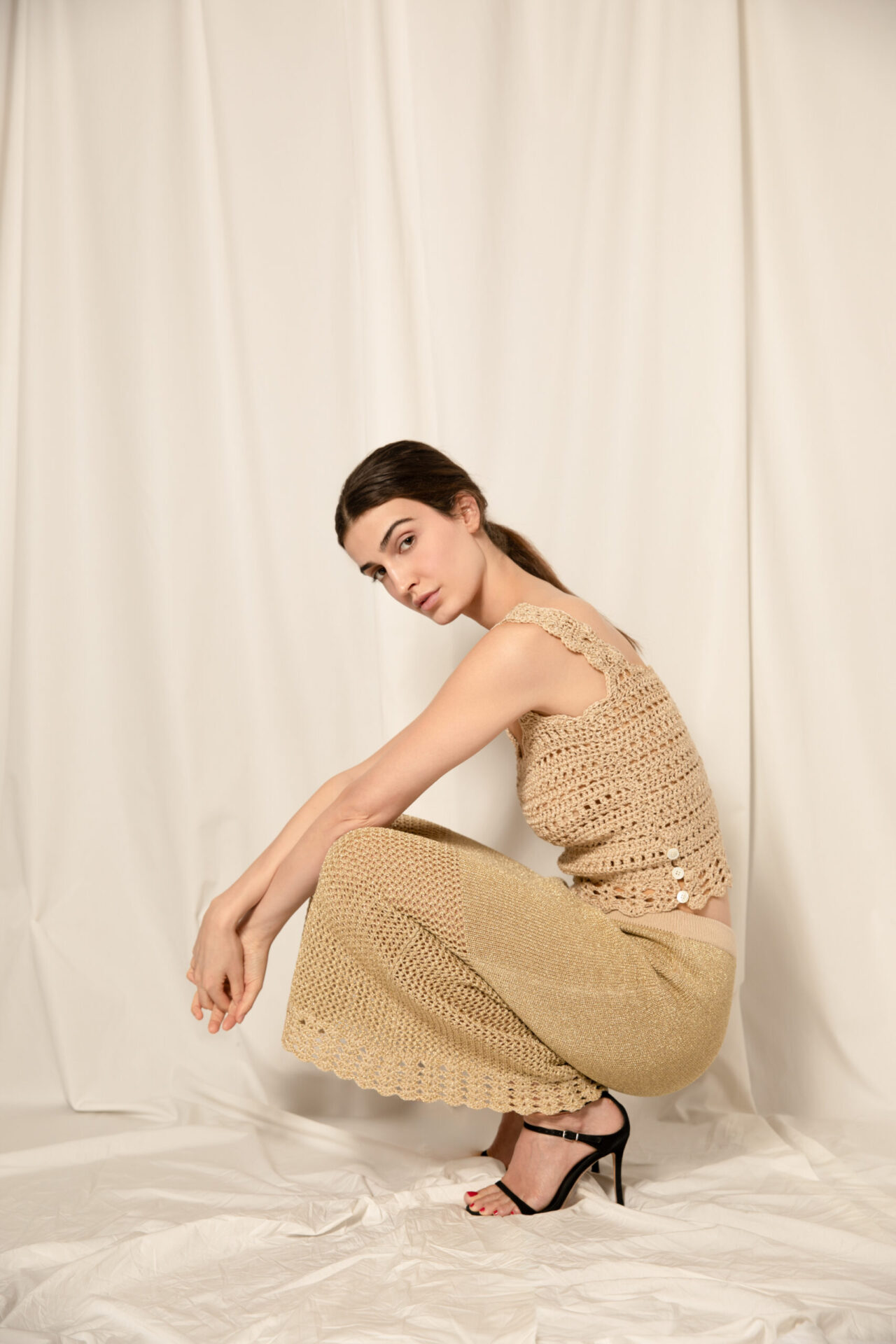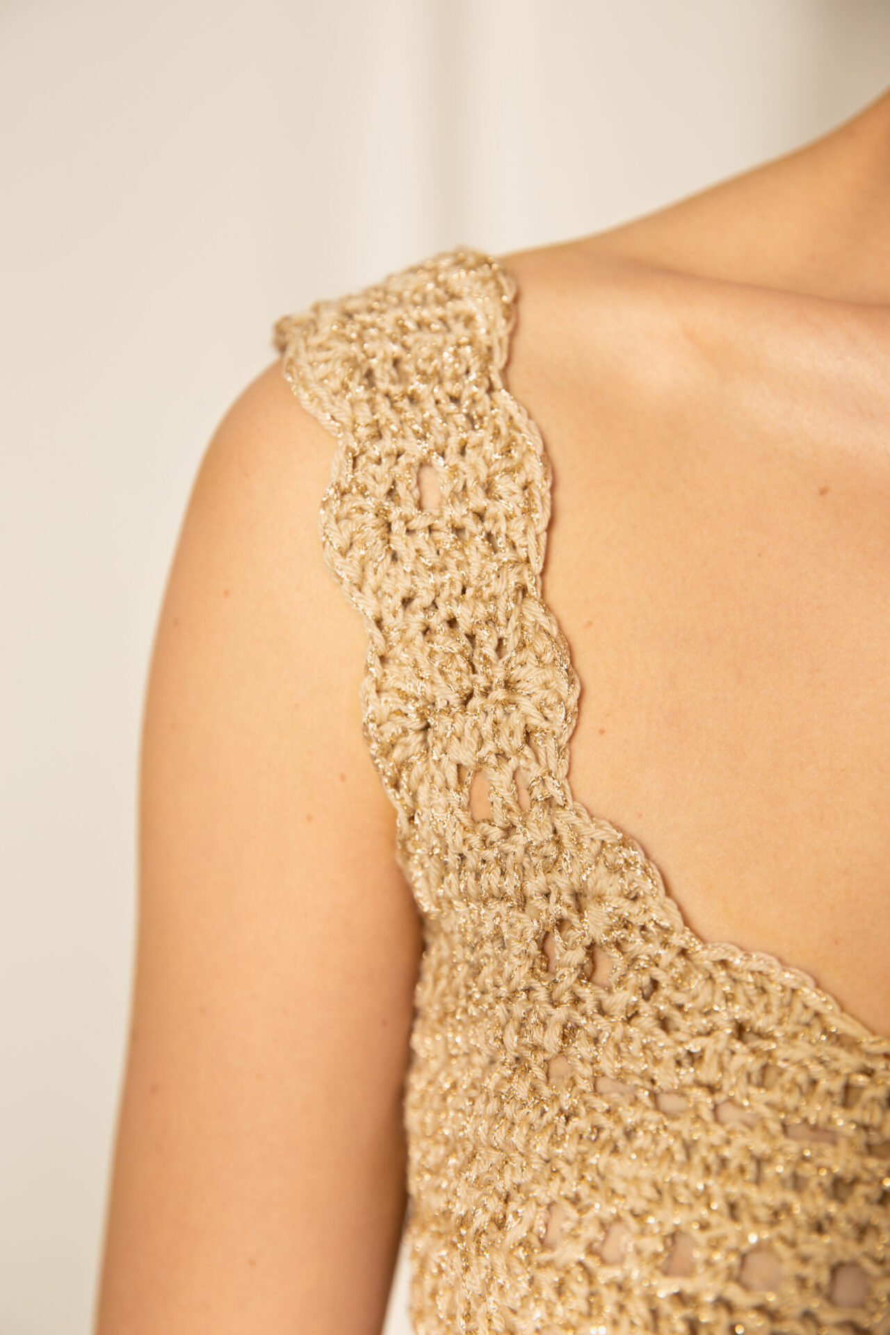 Top fatto a mano in crochet con filato misto lana merino e lamé oro, a “righe Gaeta” orizzontali. Orlo, scollo e giro manica smerlati, in filato misto lana merino e lamé oro. Chiusura con bottoni in madreperla bianchi su fianco sinistro.